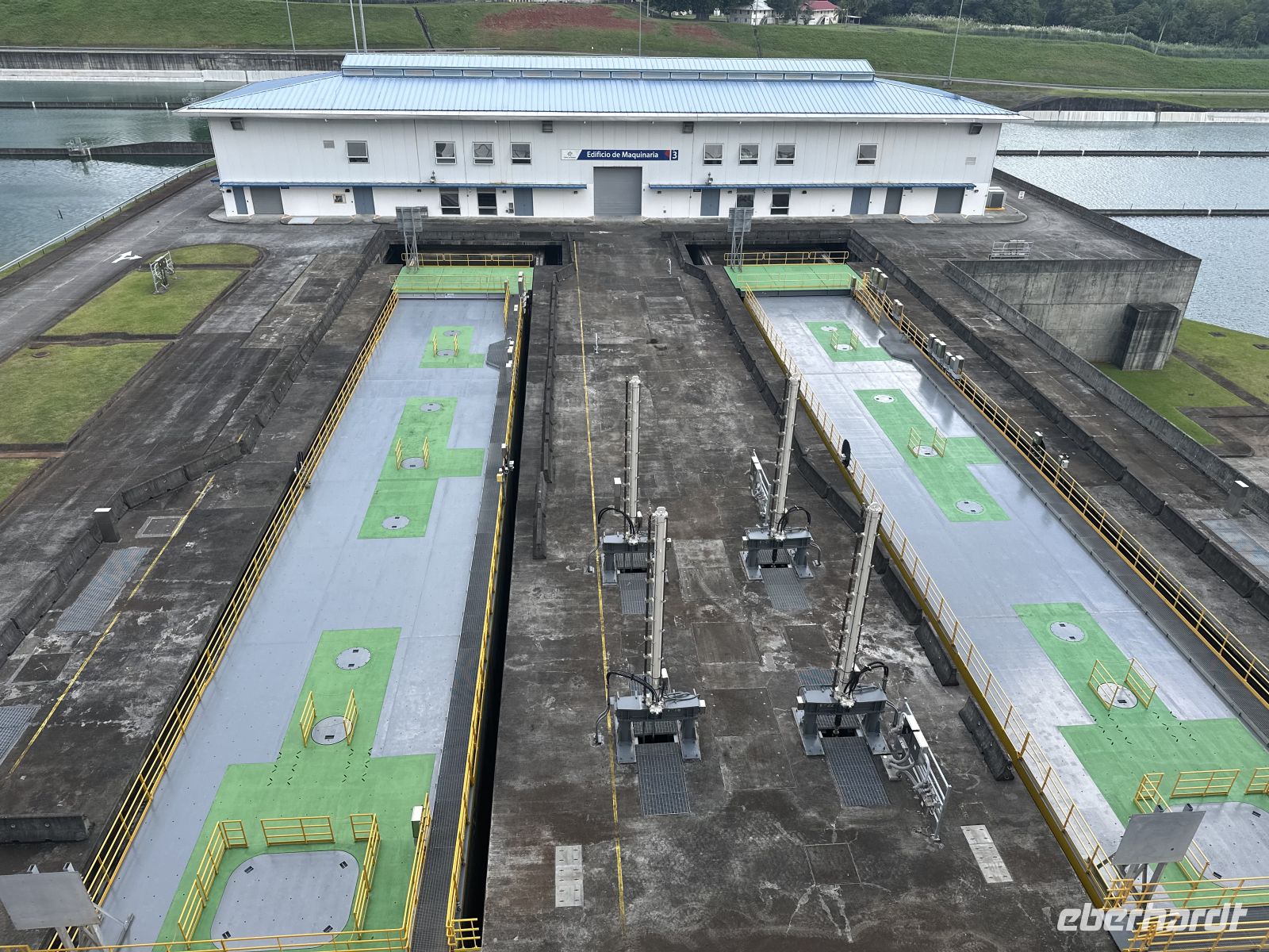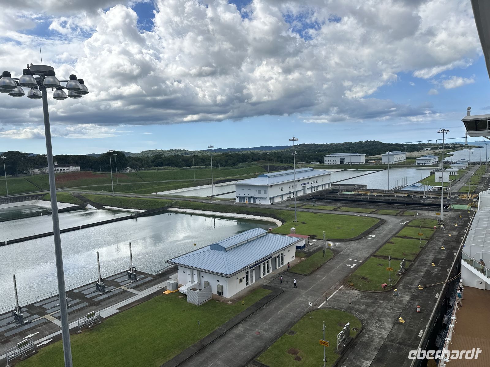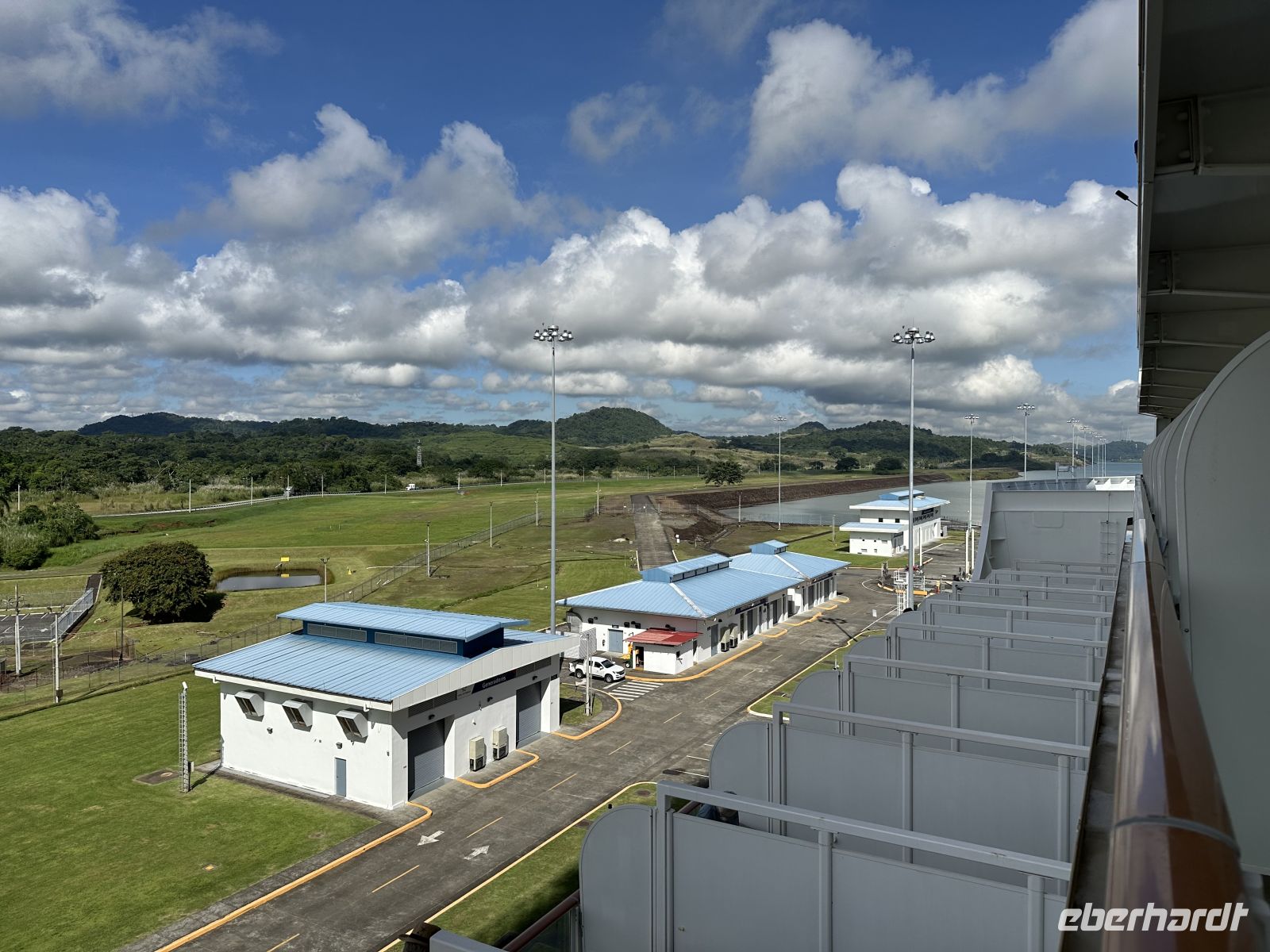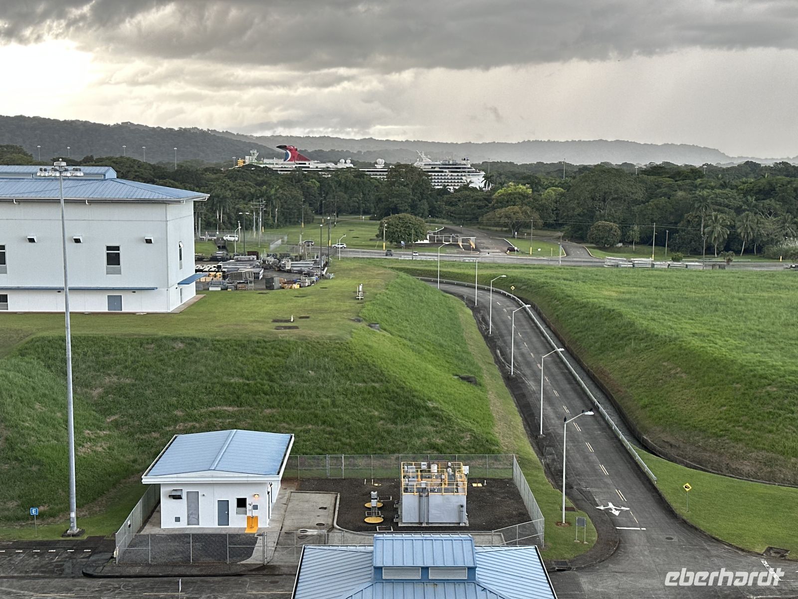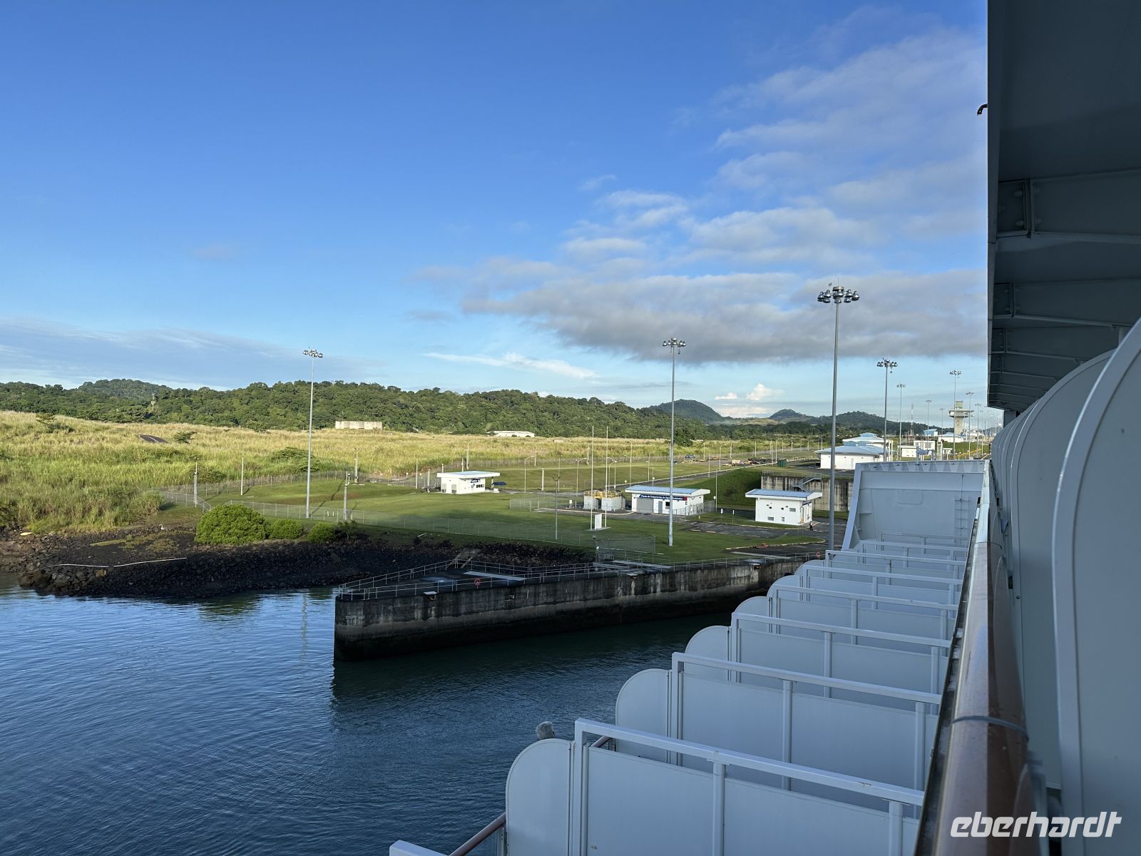 Wir passieren die kleine Ortschaft Gamboa, die als logistischer und wissenschaftlicher Stützpunkt des Kanals bekannt ist. Hier mündet der Rio Chagres in den See, und man kann Boote sehen, die zu Touren in den Soberania-Nationalpark aufbrechen. Trotz der Idylle sind wir nicht allein. Uns begegnen riesige Containerschiffe und Tanker, was das Ausmaß des Kanals als eine der wichtigsten Wasserstraßen der Welt eindrucksvoll verdeutlicht. Am frühen Nachmittag erreichen wir die Atlantikseite und beginnen mit dem Abstieg an den Agua Clara-Schleusen. Wie Cocoli gehören auch diese zu den Neopanamax-Schleusen bei Colon. Der Vorgang ist das exakte Spiegelbild des Morgens, nur rückwärts. Das Wasser in den Kammern wird kontrolliert abgelassen, während wir uns langsam dem Meeresspiegel nähern. Mit dem Verlassen der letzten Schleusenkammer und dem letzten Absenken tönt das Schiffshorn der Norwegian Joy über den Wassern – ein lautes, emotionales Tuten, das den erfolgreichen Transit in den Atlantik besiegelt.