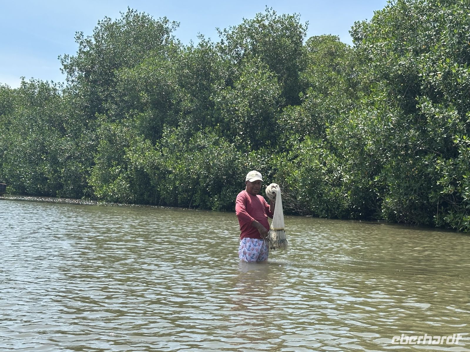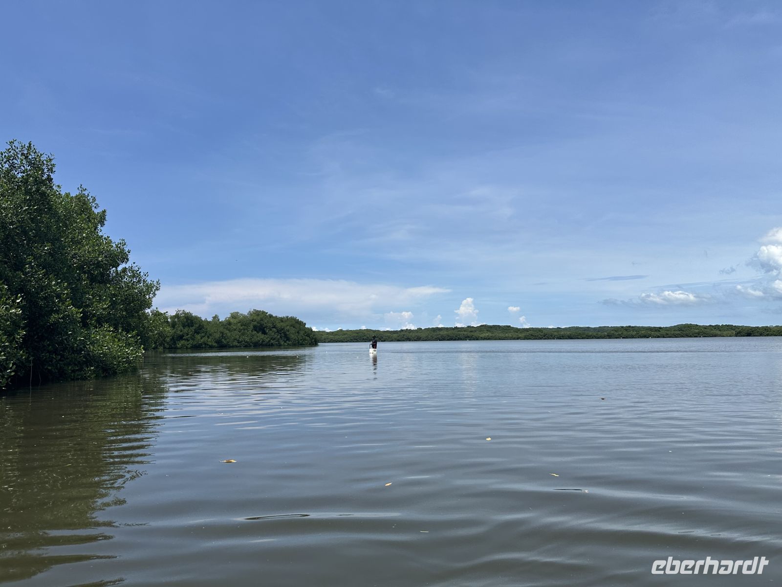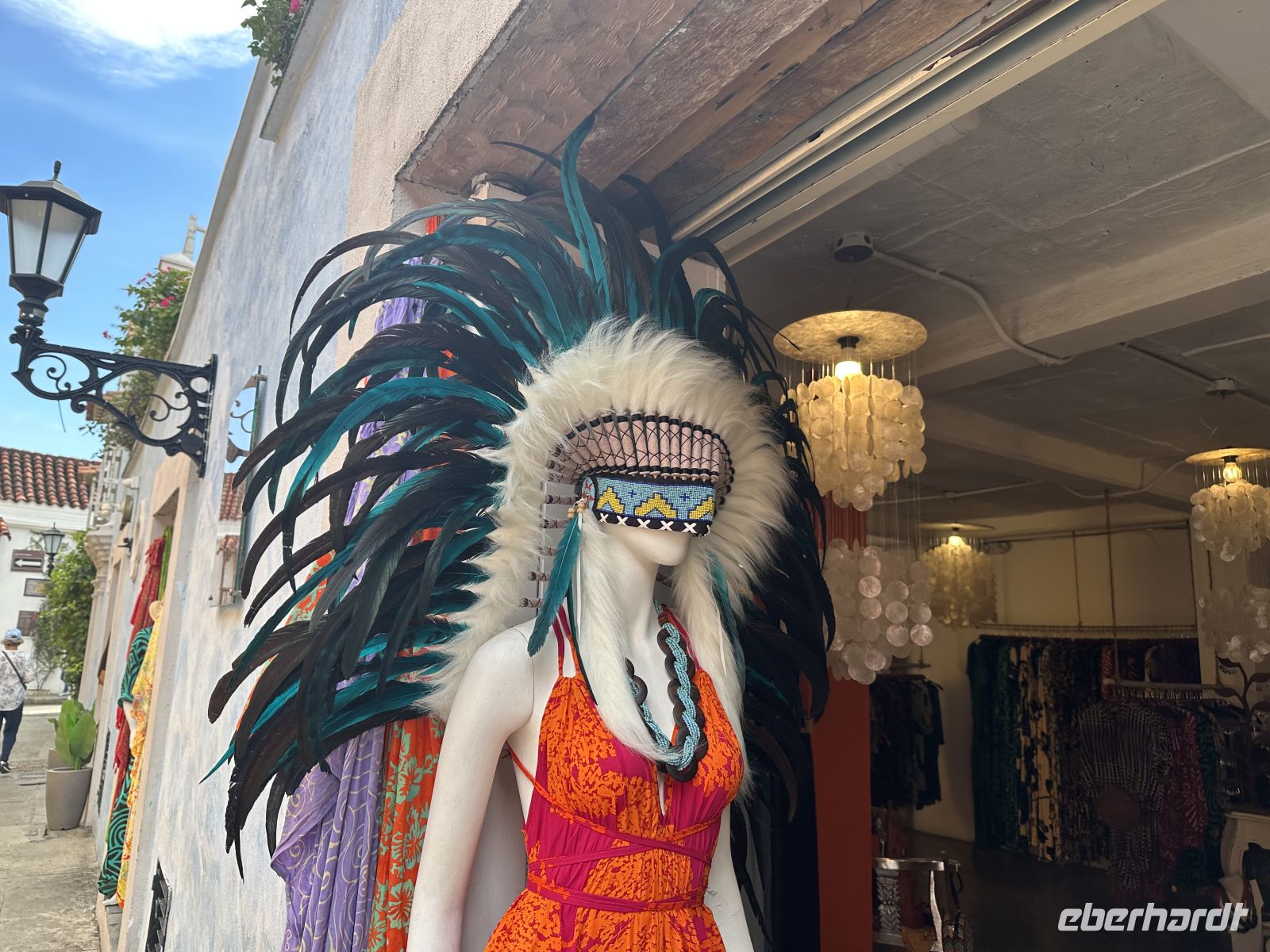 Heute steht wieder ein Eberhardt Ausflug auf dem Programm. Das bedeutet, wir sind nur in unserer Gruppe unterwegs und haben einen privaten Ausflug. Wir frühstücken gemütlich und treffen uns gegen 10 Uhr im Atrium. Das Schiff wird frei gegeben und wir machen uns auf den Weg. Auf Deck 4 werden unsere Kabinenkarten gescannt und damit wird registriert, dass wir von Bord gegangen sind. Der Weg zum Ausgang führt durch da Cruisecenter. Am Eingang zum Cruisecenter steht Angelica, die Vertreterin der Eberhardt Agentur vor Ort, die den Ausflug organisiert hat. Bei ihr ist eine Assistentin, die uns zu unserem Guide Carlos bringen soll. Das ist gut so, denn der Weg durch das Cruisecenter führt vorbei an laut krächzenden farbenfrohen Papageien, die über unsere Köpfe fliegen, rosafarbenen Flamingos und blaubunten Pfauen. Kreuz und quer laufen wir, ehe wir den Ausgang erreichen. Auch von hier ist es noch ein Stück Weg bis uns Carlos begrüßt. Unser Bus gerät in einen unfassbaren Stau, der für Cartagena nicht unüblich sein soll. Irgendwann haben wir uns da durch gequält. In der Zwischenzeit unterhält uns Carlos mit Geschichten aus der Geschichte der Stadt. Er berichtet von Piraten, die zweimal die Stadt ausraubten und zerstörten und vom Bau der Festung, an der wir einen Fotostopp einlegen. Bunt gekleidete Palenquitas versuchen, uns zum Fotografieren zu verleiten, selbstverständlich nicht ohne Obolus. Man muss zugeben, fotogen sind sie schon. Wir fahren weiter und erreichen bald den Strand von La Boquilla. Hier steigen wir in Kanus ein, jeweils vier bis fünf Personen haben Platz. Unsere Bootsführer, die die Kanus staken, sprechen kein Englisch und wir kein Spanisch. Nachdem sie das herausgefunden haben, sorgen sie dafür, dass die Kanus soweit es geht, nebeneinander fahren, damit Carlos für alle seine Erklärungen geben kann. Lautlos gleiten die Kanus durch die engen Kanäle zwischen den Mangroven. Wir erreichen eine Stelle, an der sich ein See gebildet hat. Hier steht ein Fischer, der sein Geld damit verdient, Touristen zu zeigen, wie ein Fischernetz ausgeworfen wird. Auch seine in einer Reuse gefangenen Krebse dürfen wir fotografieren. Freiwillige Spende: 1$ pro Person. Wieder zurück am Ufer werden uns Kokosnüsse serviert, aus denen wir erfrischendes Kokoswasser trinken. In einem der vielen (heute leeren) Strandrestaurants kehren wir zum Mittagessen ein. Alles geht sehr lokal zu, wir dürfen sogar in die Küche schauen, wie der Fisch, den wir gleich verspeisen werden, am offenen Feuer zubereitet wird. Nach dem Mittagessen fahren wir in die Altstadt. In den Stuben einer ehemaligen Kaserne befinden sich heute Souvenirläden, keine Frage, dass wir uns dort eine Weile aufhalten. Anschließend spazieren wir durch die Stadt, bewundern alte Häuser und Kirchen und besuchen ein Kaffeegeschäft. Selbstverständlich gibt es dort den besten Kaffee der Welt, den wir auch kaufen dürfen. Bevor wir zum Schiff zurückkehren, kommen wir an einem Park vorbei, in dem junge Leute mit viel Temperament regionale Tänze aufführen. Der Weg zum Schiff führt erneut durch das Cruisecenter. Ein paar Minuten bleiben auch zum Fotografieren. Sogar ein ganz kleines Faultier entdecken wir noch. An der Gangway tanzt heute die Crew und begrüßt uns lautstark zurück an Bord. Ein erlebnisreicher Tag neigt sich dem Ende zu.