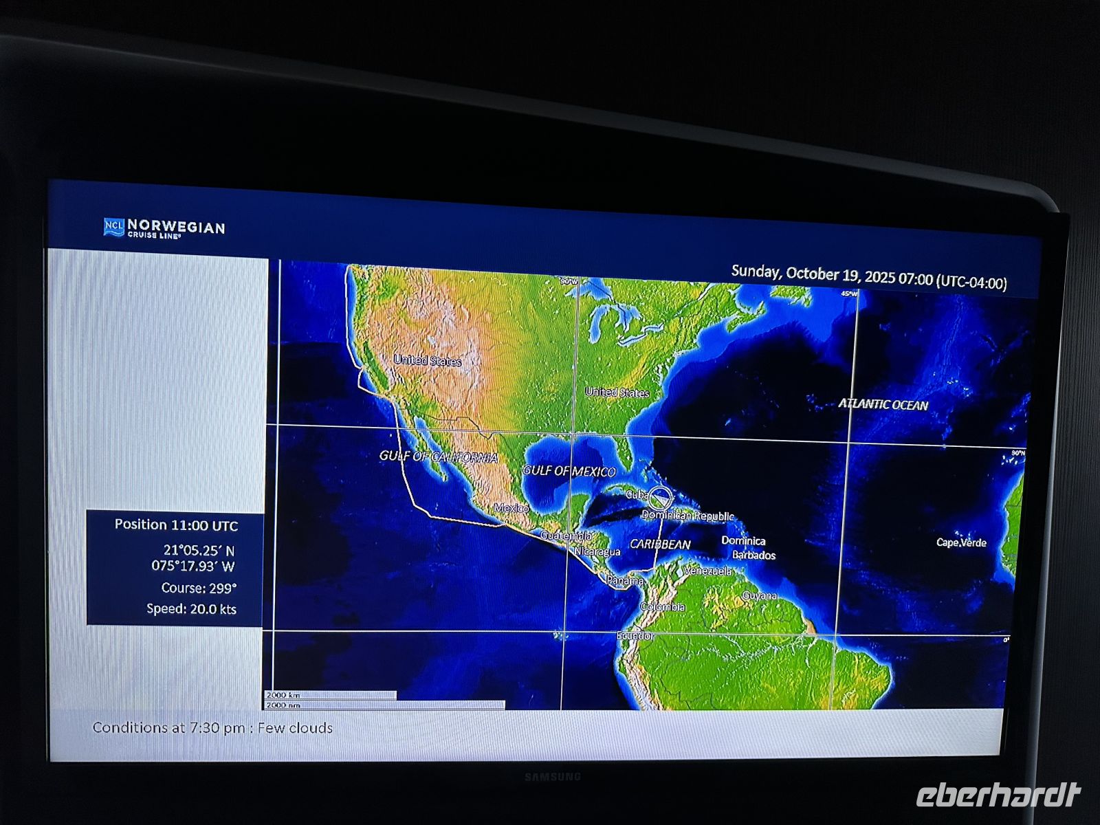 Ganz hoch im Kurs stehen an Bord die NFL Spiele. Auf mehreren Großleinwänden kann man die Spiele verfolgen. Vormittags stellen der Kapitän, der Chefingenieur und der Kreuzfahrtleiter vor, wie ein Kreuzfahrtschiff funktioniert. Bei einem Vortrag über Miami können wir uns auf das nächste und letzte Ziel unserer Reise einstimmen. Im Atrium zeigen Mitreisende eine Tanzshow, die sie in den letzten Tagen einstudiert haben. Mit viel Humor präsentieren sie Tänze zu Thriller, Titanic und