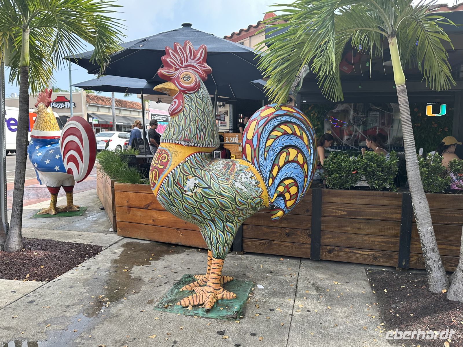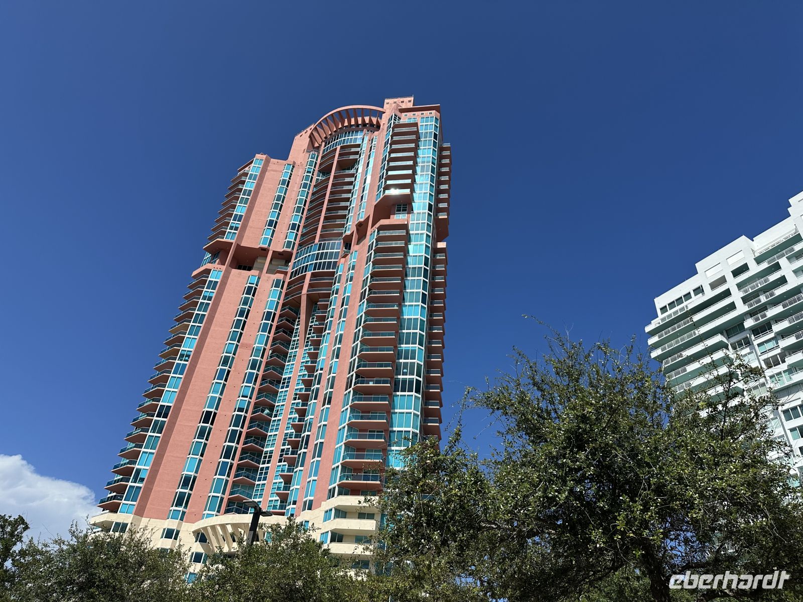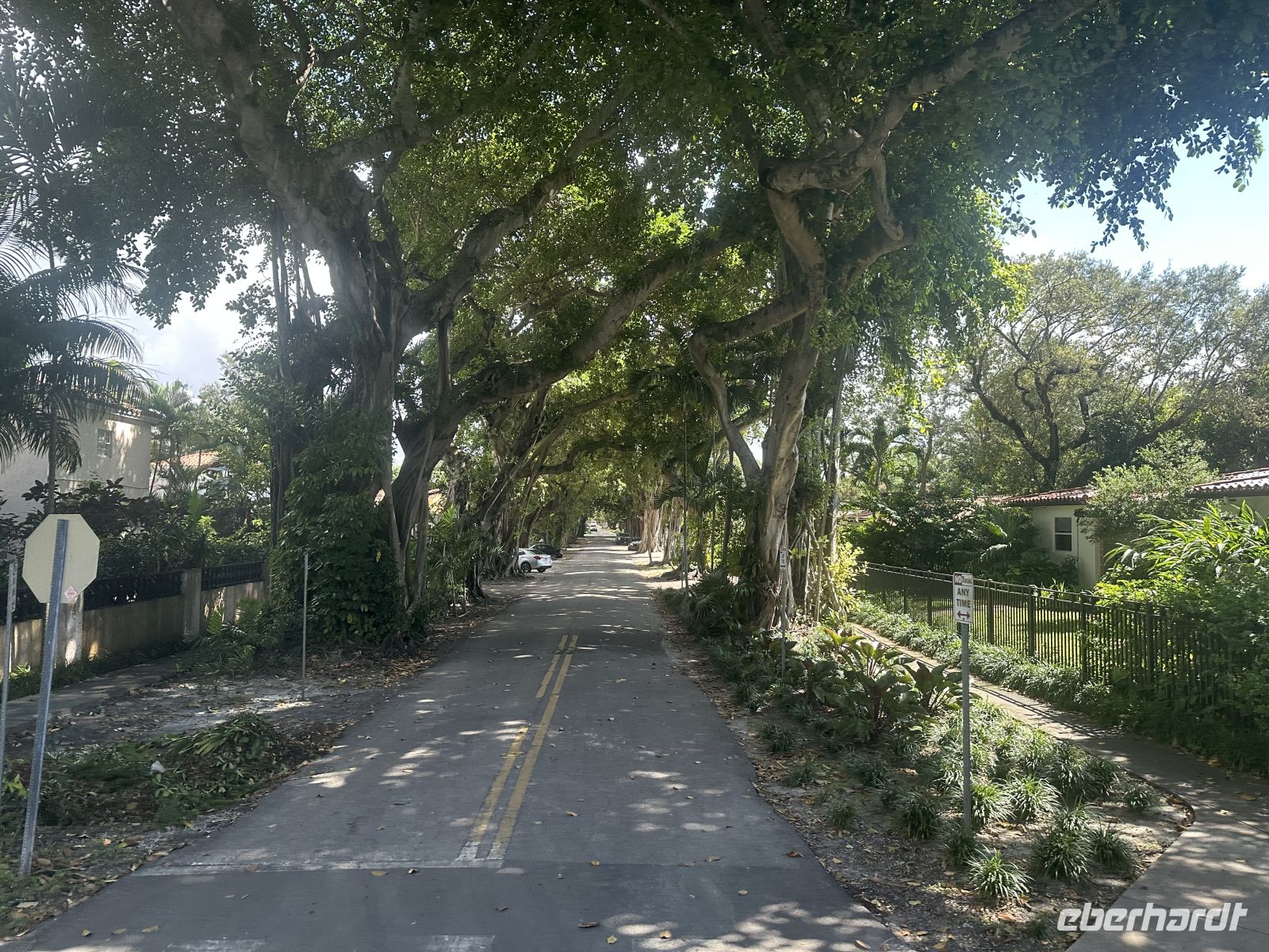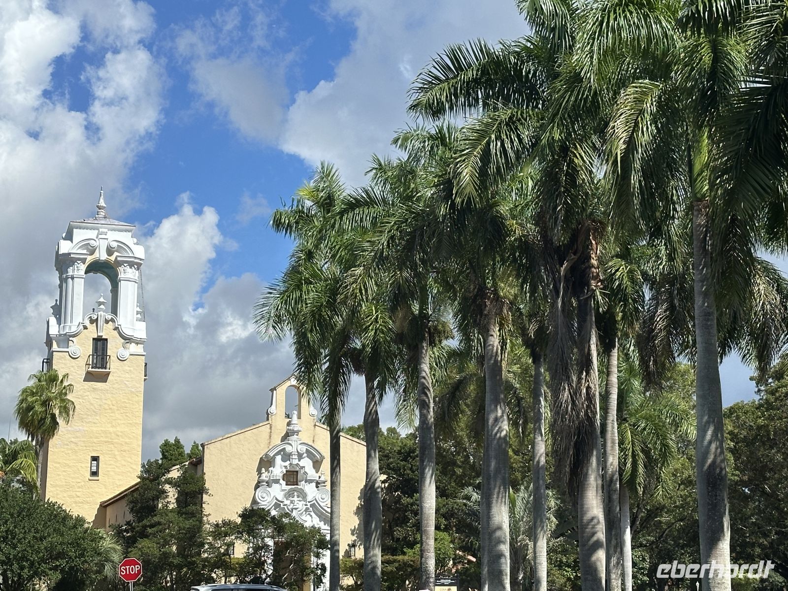 Wir fahren durch Coral Gables, eine Stadt im Miami-Dade County in Florida, die unmittelbar südwestlich an Miami grenzt. Sie ist bekannt für ihre Schönheit, ihren Wohlstand und ihre einzigartige, sorgfältig geplante Architektur. Coral Gables wurde in den 1920er Jahren von dem Visionär George E. Merrick als geplante Gemeinde entworfen. Der Spitzname ist „The City Beautiful“ (Die schöne Stadt). Die Stadt ist durchgängig vom Mediterranean Revival Style (mediterraner Wiederbelebungsstil) geprägt, der von spanischer und italienischer Architektur inspiriert ist. Dies verleiht der Stadt ein sehr elegantes, harmonisches und gepflegtes Erscheinungsbild mit pastellfarbenen Fassaden, Ziegeldächern und üppigem Grün. Coral Gables gilt als eine der wohlhabendsten Städte im Großraum Miami-Dade County. Am Biltmore Hotel legen wir einen Fotostopp ein. Es ist ein historisches und architektonisch beeindruckendes Luxushotel mit einem hohen Turm und das Wahrzeichen von Coral Gables. Es verkörpert perfekt den geplanten Mediterranean Revival Style. Sein markantestes Merkmal ist der imposante, 16-stöckige Turm. Er ist eine Nachbildung des Giraldaturms (des Glockenturms der Kathedrale von Sevilla) in Spanien. Das gesamte Gebäude strahlt eine zeitlose Eleganz und den Glamour der Jazz-Ära (1920er Jahre) aus. Das Biltmore ist als National Historic Landmark in den USA gelistet, was seine herausragende historische Bedeutung unterstreicht. Es wurde 1926 als Zentrum für Sport, Mode und gehobenes Leben errichtet und es hat eine spannende Vergangenheit: Ursprünglich war das Biltmore Hotel der Treffpunkt der High Society und Hollywood-Stars.