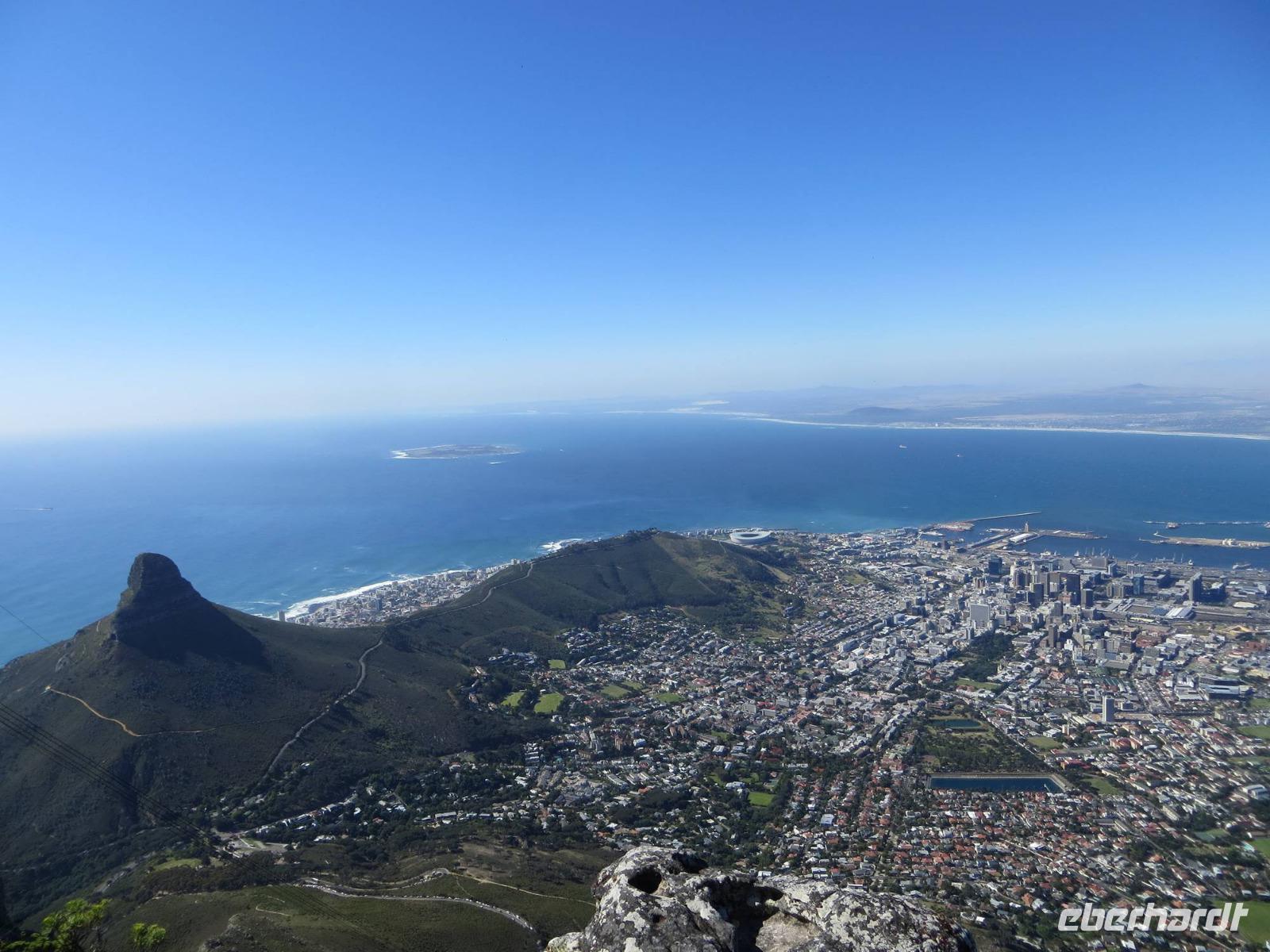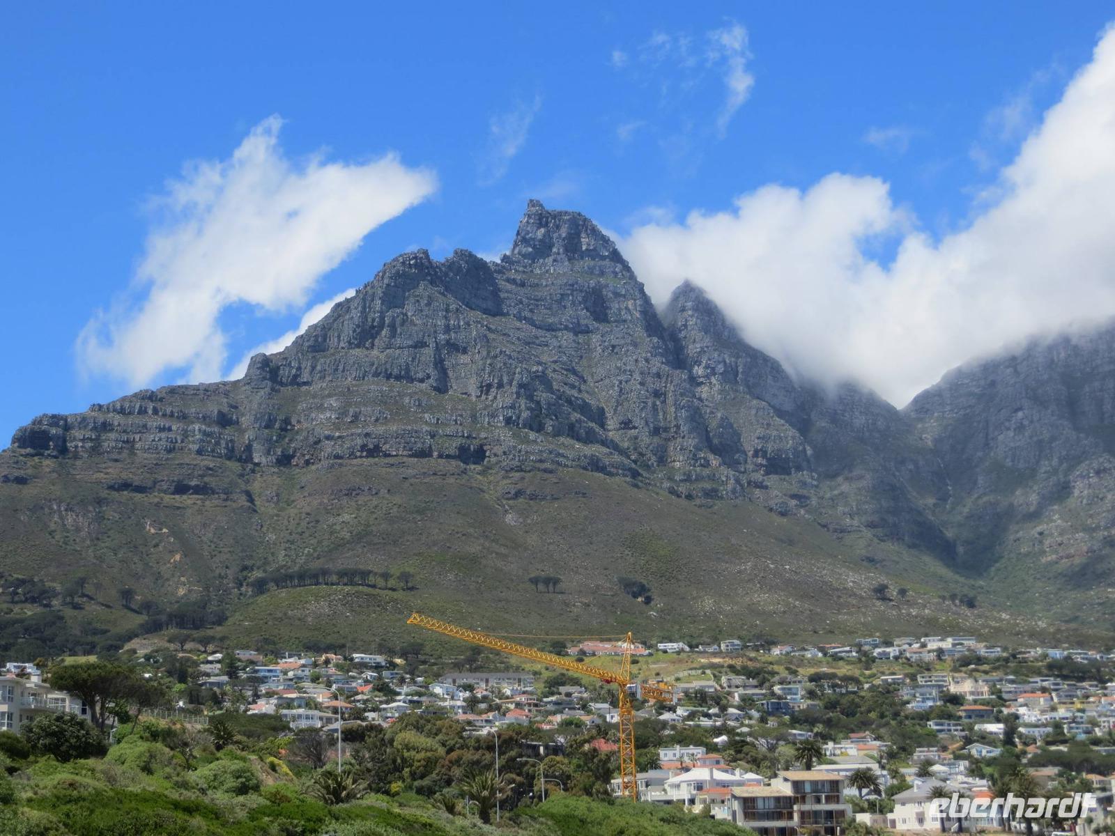 Danach fahren wir zurück nach Kapstadt. Wir sehen, dass der Tafelberg mit einer dünnen Wolkendecke bedeckt ist und hoffen, dass das Wetter uns am nächsten Tag wohlgesonnen ist und wir hinauffahren können. Das ist immer ein spannendes Thema, denn das Wetter ändert sich hier schnell und es darf oben nicht zu windig sein, damit die Seilbahn fahren kann.