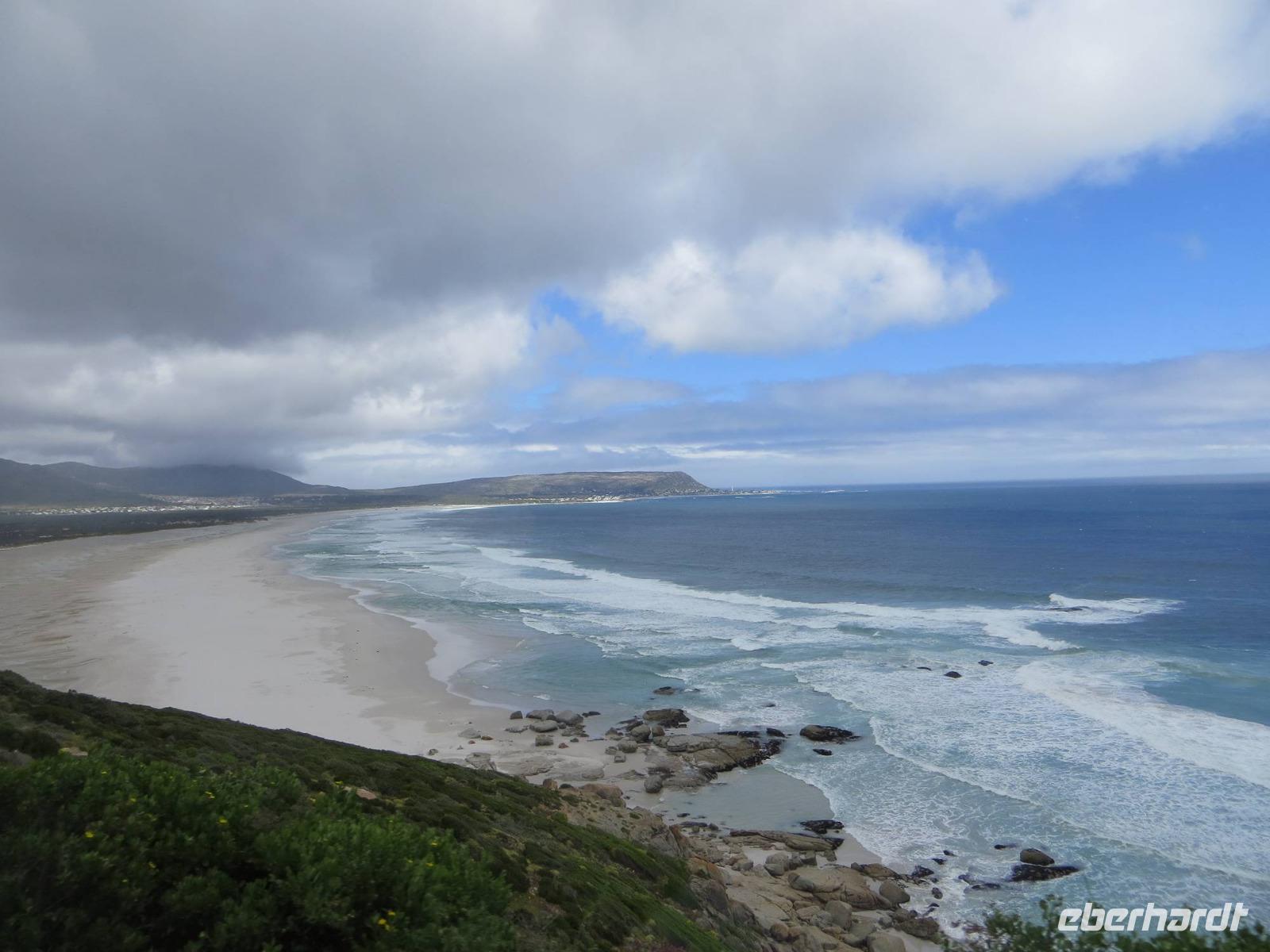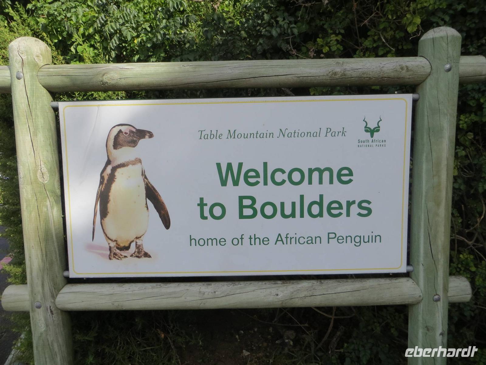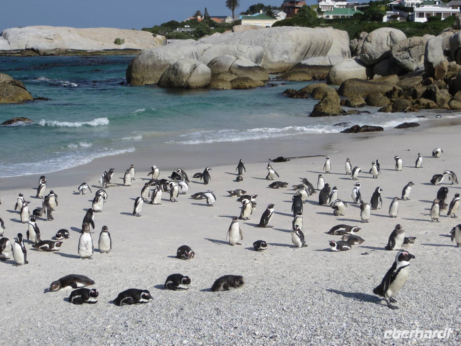 Unser nächstes Ziel ist der Boulders Beach bei Simonstown. Der Strandabschnitt, der zum Table-Mountain-Nationalpark gehört, beherbergt eine der nur drei Brillenpinguin-Kolonien in ganz Südafrika. Wir spazieren auf den angelegten Stegen, die uns ganz nah zu den Vögeln bringen. Es ist ein toller Anblick: Pinguine am Strand zwischen Granitfelsen, die Wellen des Atlantiks und der blaue Himmel, denn hier scheint die Sonne wieder.