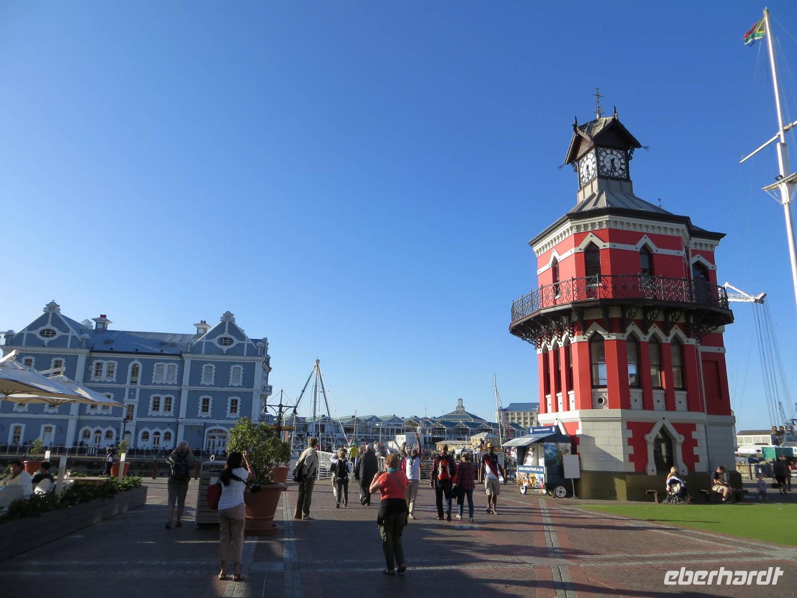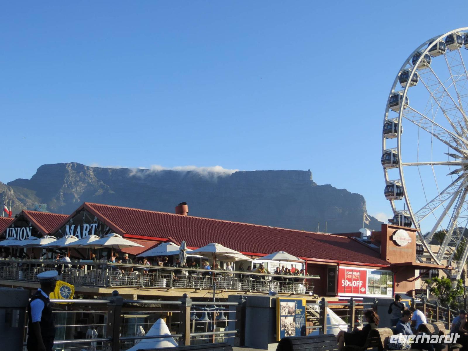 So kaufen wir unsere Tickets und besteigen die Seilbahn, die während der Fahrt hinauf sich einmal dreht. War es an der Talstation noch warm, überrascht uns hier oben ein kühler Wind. Trotzdem genießen wir alle den fantastischen Rundumblick auf Kapstadt und die False und unternehmen zusammen mit Hildegard einen kleinen Spaziergang trinken Kaffee und genießen dieses Erlebnis. Als wir bereits in der Warteschlange zur Fahrt zurück anstehen, ertönt das laute Signal, dass bekannt gibt, dass der Tafelberg aufgrund des Wetters nun „geschlossen" wird und alle Gäste sich wieder zur Talstation begeben sollen. Trotz des Windes bringt uns die Seilbahn wieder sicher zurück und unten ist nix von Wind zu spüren.Auf der Rückfahrt zum Hotel stoppen wir an der Waterfront, einige bleiben gleich hier und andere fahren zurück zum Hotel. Wir bummeln durch das bekannte Vergnügungsviertel und genießen das bunte Treiben an dem restaurierten Hafenviertel. Erste Souveniers werden gekauft, bevor wir zusammen zurück zum Hotel laufen.