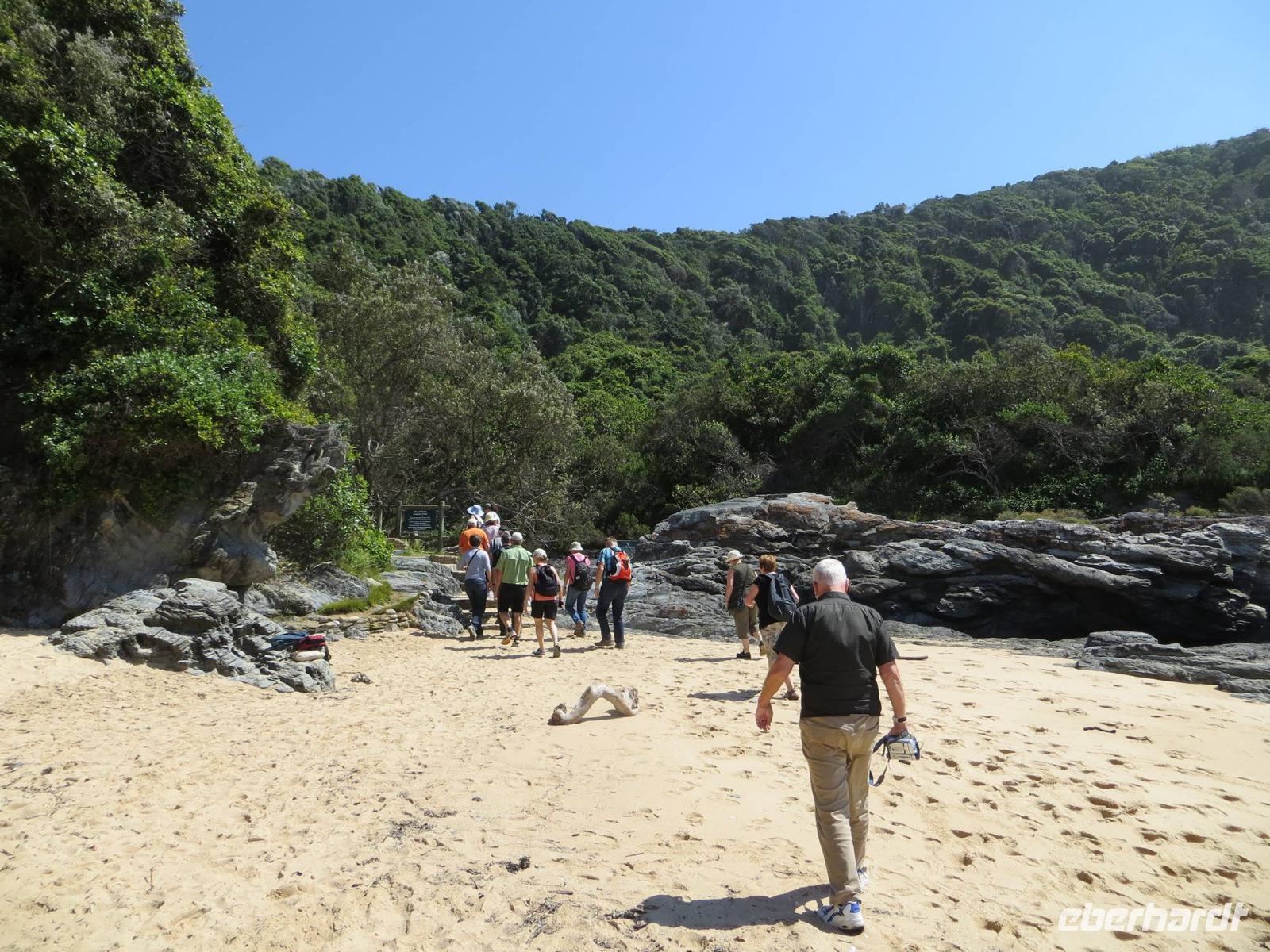 Nach dem Frühstück setzten wir unsere Fahrt entlang der Gartenroute fort. Knysna ist umgegeben von Wäldern, die als Naturerbe Südafrikas besonders geschützt sind, denn noch heute leben hier Elefanten. In Knysna sehen wir auch unseren ersten blühenden Jacaranda-Baum. Auf der Weiterfahrt stoppen wir kurz an einer der höchsten Bungee-Brücken der Welt. Aus der Ferne sehen wir zu, wie sich Wagemutige, nur an einem Seil gesichert, aus knapp 220 Metern Höhe stürzen. Um 10:00 Uhr bereits erreichen wir anschließend den Tsitsikamma-Nationalpark. Wir starten direkt am Strand des Indischen Ozeans einen kleinen Spaziergang, gelangen über einige Treppenstufen und über Stege -langen vorbei an einem Wasserfall und der herrlichen Vegetation bis zur 77m langen Storms-River-Hängebrücke. Einige wagen deren (und 2 weiteren) Überquerung, bevor wir wieder zurück laufen. Unterwegs sehen wir auch einige Klippschliefer, die vom Aussehen her unseren Murmeltieren ähneln. Die anschließende Freizeit nutzen einige Gäste zum Baden im Indischen Ozean. Bevor wir später das Reservat wieder verlassen, entdecken wir sogar eine grüne Baumschlange.Nach einer kurzen Fahrt und Spaziergang gelangen wir zum „Big Tree". Der 800 Jahre alte Gelbholzbaum ist 37m hoch. Unter ihm genießen wir gemeinsam einen ersten Amarula.Danach geht unsere Fahrt entlang der Gartenroute weiter bis Port Elizabeth zum Kelway-Hotel. Nach dem Abendessen verabschieden wir uns herzlichst bei Hildegard und unserem Fahrer Antonie, der uns täglich sehr sicher chauffiert hat.
