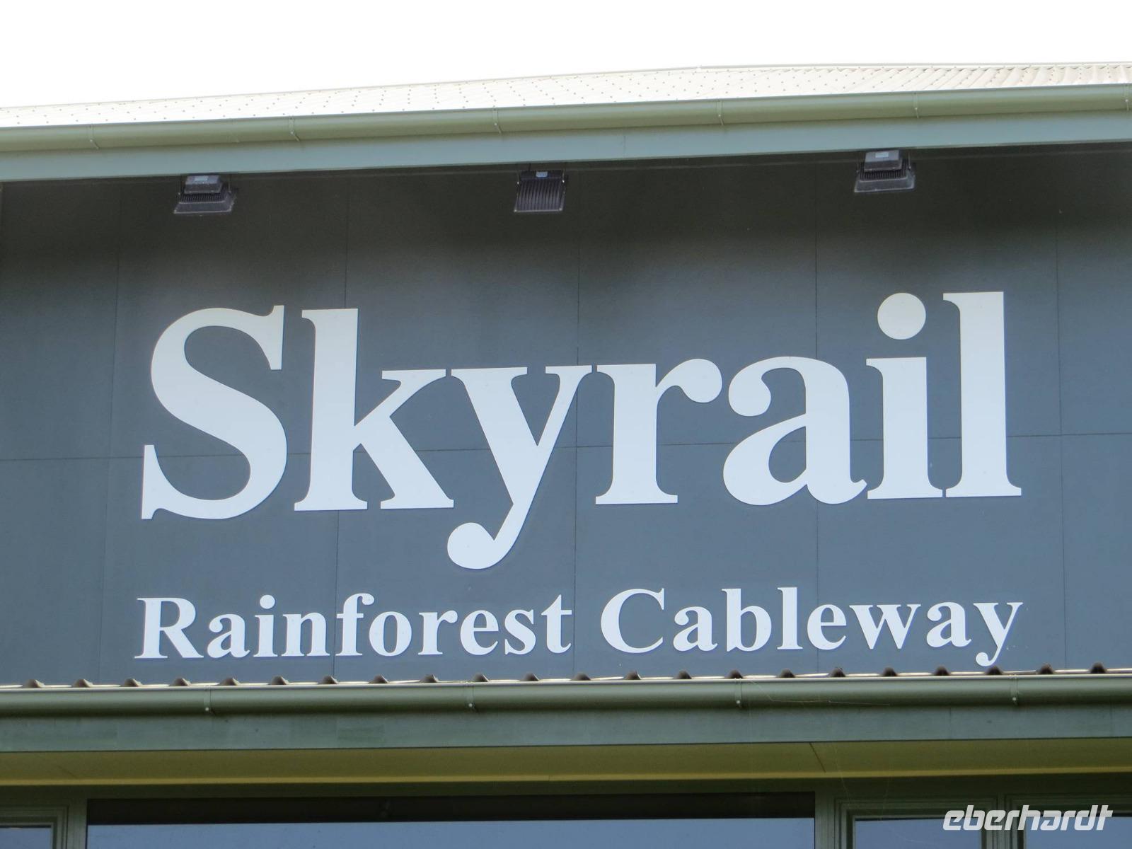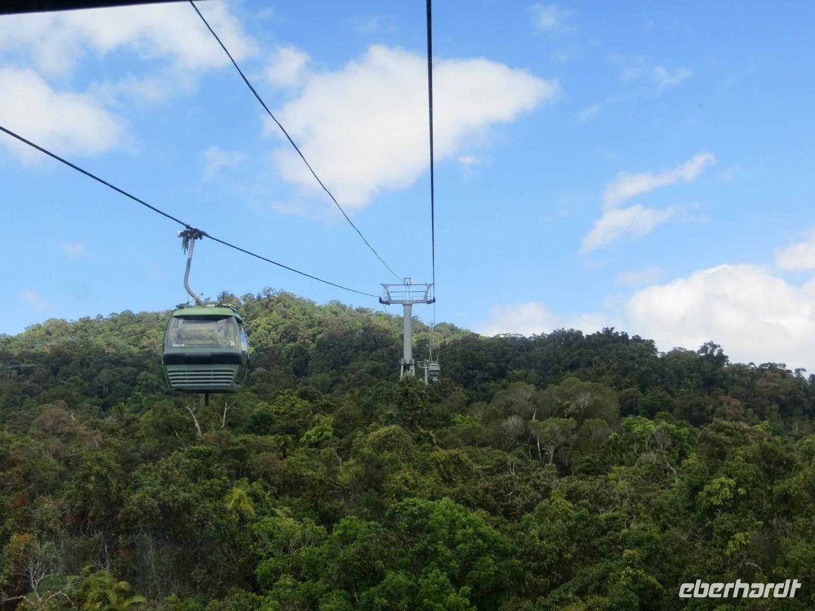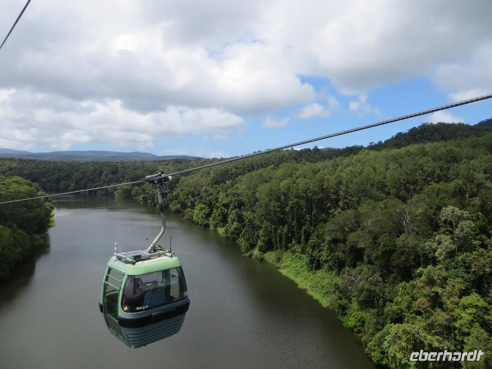 Bereits vom Park aus sahen wir die Gondeln der „Skyrail" über uns. Nun besteigen wir jeweils zu viert selbst diese Seilbahn und schweben über das Blätterdach des tropischen Regenwaldes. Wir überqueren den Barron Fluß und erblicken die gleichnamigen Wasserfälle. Unterwegs steigen wir an einer Zwischenstation aus und erkunden zu Fuß die imposante Vegetation mit riesigen Baum- und Palmfarnen. Anschließend fahren wir weiter bis in das kleine Bergstädtchen Kuranda. Hier bummeln wir durch die Geschäfte und essen zu Mittag. Bevor wir unsere Reise fortsetzen probieren wir alle noch einen ???, den typischen Zuckerrohrschnaps der Region. Die Rückfahrt nach Cairns unternehmen wir mit der „Kuranda Scenic Train". Die historische Eisenbahn verbindet bereits seit 1891 Kuranda mit Cairns. In den kommenden 1,5 Stunden genießen wir immer wieder atemberaubende Ausblicke auf die Atherton Tablelands. Wir steigen in Freshwater aus und fahren mit dem Bus zurück zum Hotel.