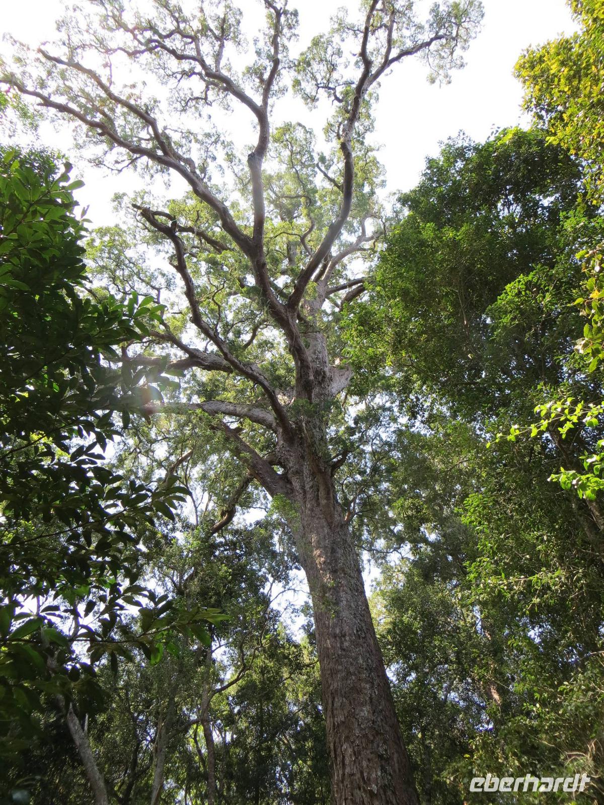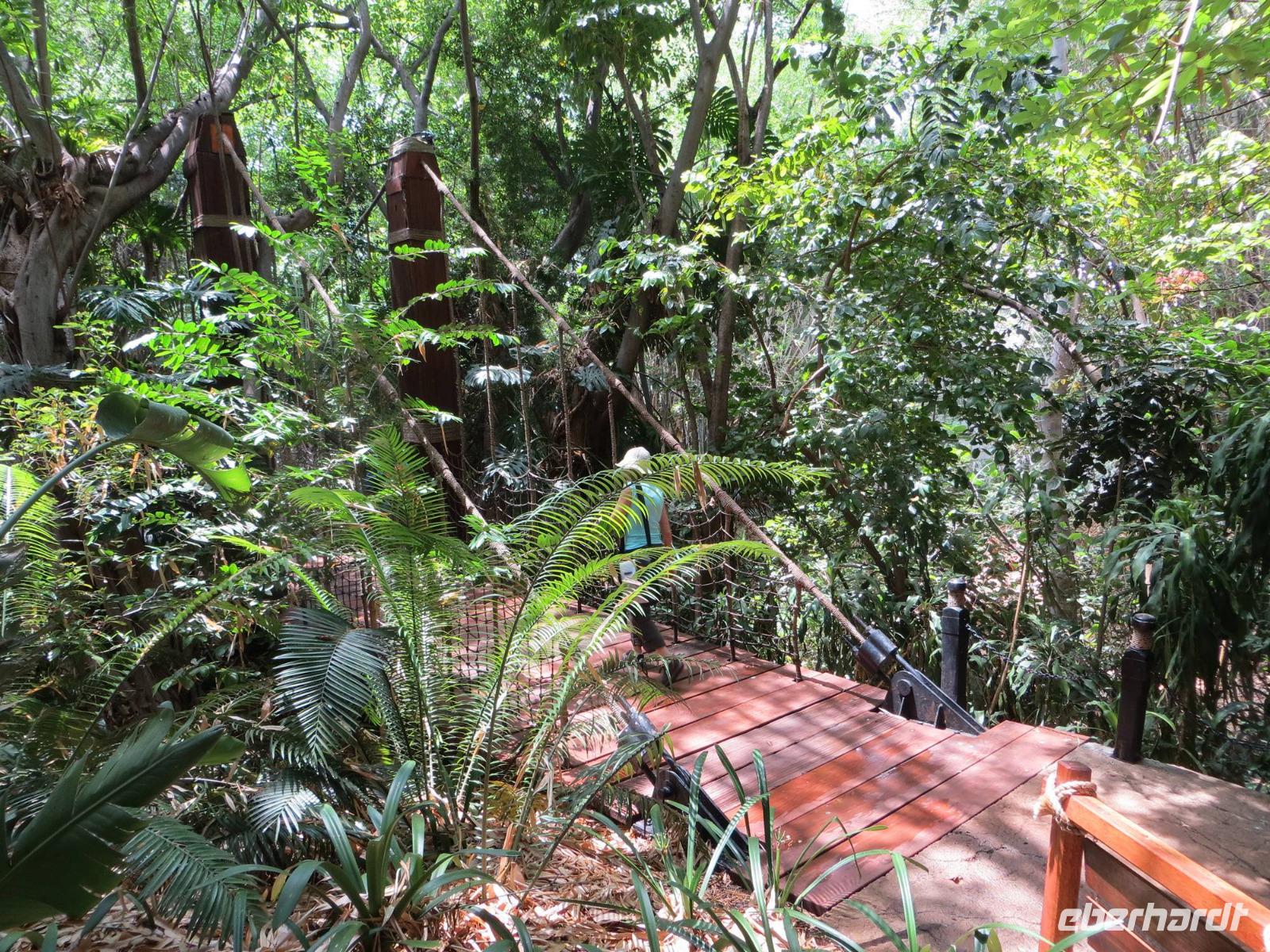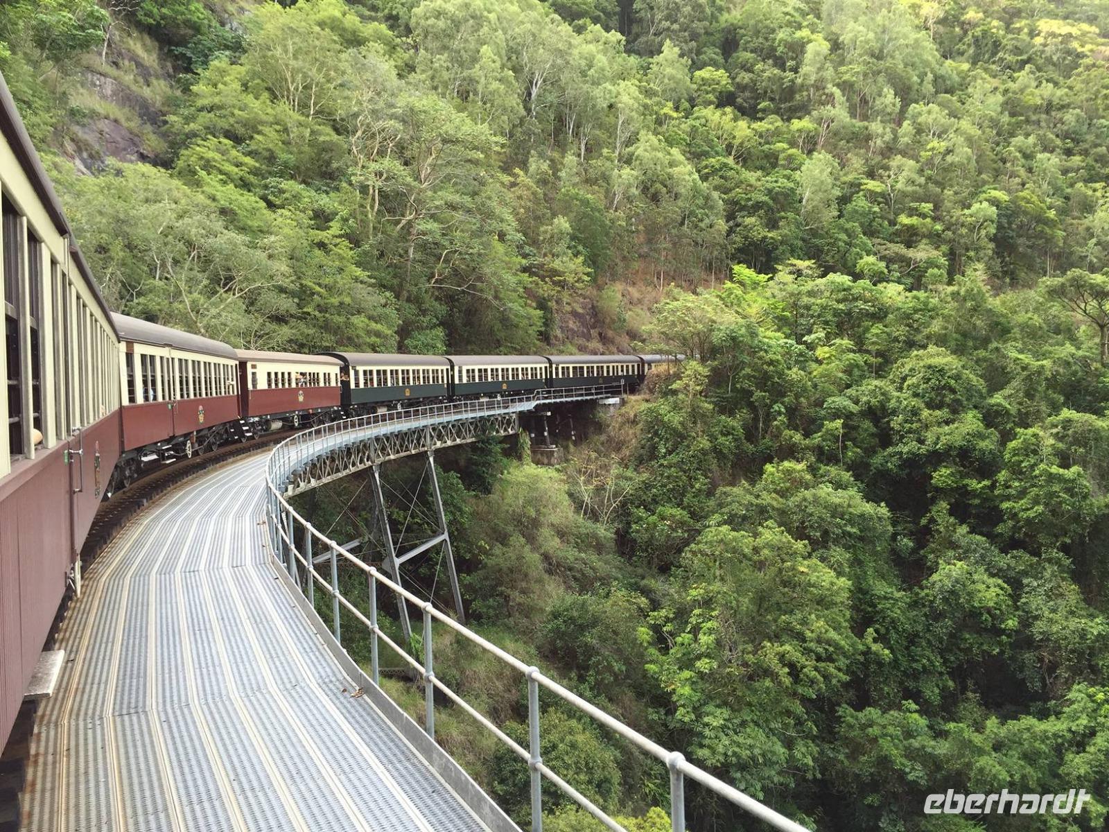 Bereits vom Park aus sahen wir die Gondeln der „Skyrail" über uns. Nun besteigen wir jeweils zu viert selbst diese Seilbahn und schweben über das Blätterdach des tropischen Regenwaldes. Wir überqueren den Barron Fluß und erblicken die gleichnamigen Wasserfälle. Unterwegs steigen wir an einer Zwischenstation aus und erkunden zu Fuß die imposante Vegetation mit riesigen Baum- und Palmfarnen. Anschließend fahren wir weiter bis in das kleine Bergstädtchen Kuranda. Hier bummeln wir durch die Geschäfte und essen zu Mittag. Bevor wir unsere Reise fortsetzen probieren wir alle noch einen ???, den typischen Zuckerrohrschnaps der Region. Die Rückfahrt nach Cairns unternehmen wir mit der „Kuranda Scenic Train". Die historische Eisenbahn verbindet bereits seit 1891 Kuranda mit Cairns. In den kommenden 1,5 Stunden genießen wir immer wieder atemberaubende Ausblicke auf die Atherton Tablelands. Wir steigen in Freshwater aus und fahren mit dem Bus zurück zum Hotel.