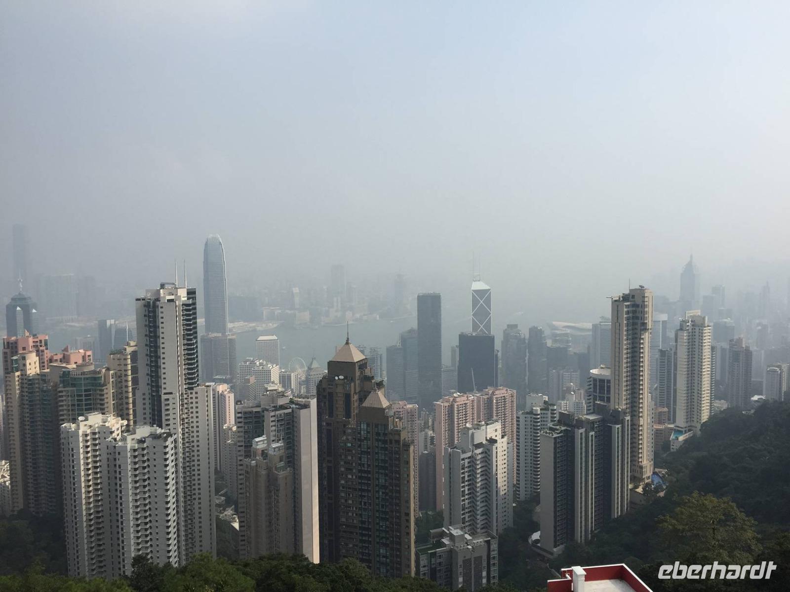 Strahlend erwartet uns unsere Reiseleiterin Winnie, die 6 Jahre in Berlin gelebt hat. Wir starten sofort mit unserem Tagesprogramm und fahren hinüber zu Hongkong Island durch den morgendlichen Berufsverkehr zur Talstation der Victoria Peak-Bahn. Die Standseilbahn bringt uns teils mit knapp 50% Steigung hinauf zum Victoria Peak. Von hier genießen wir eine fantastische Aussicht über das Häusermeer von Hong Kong.