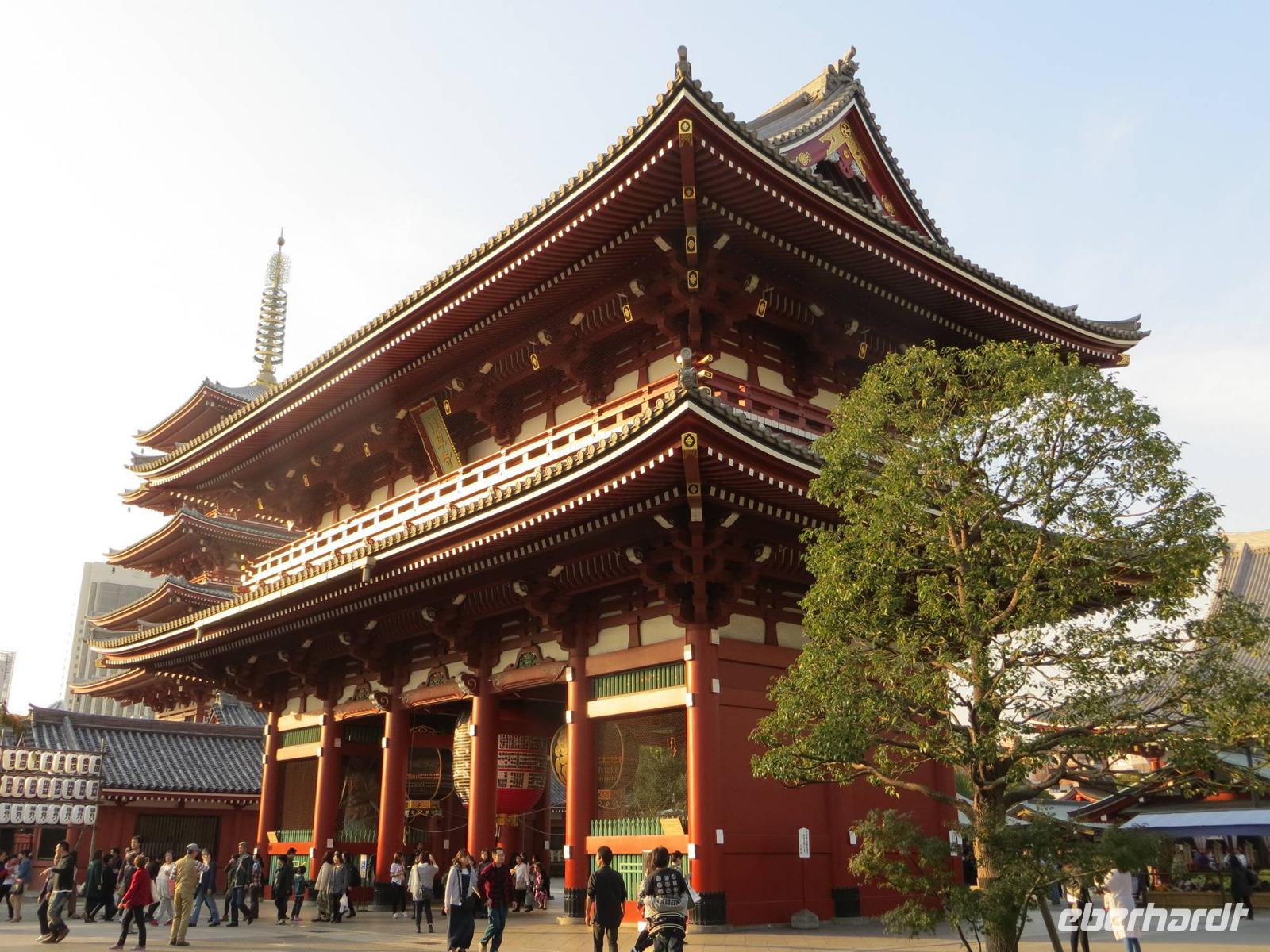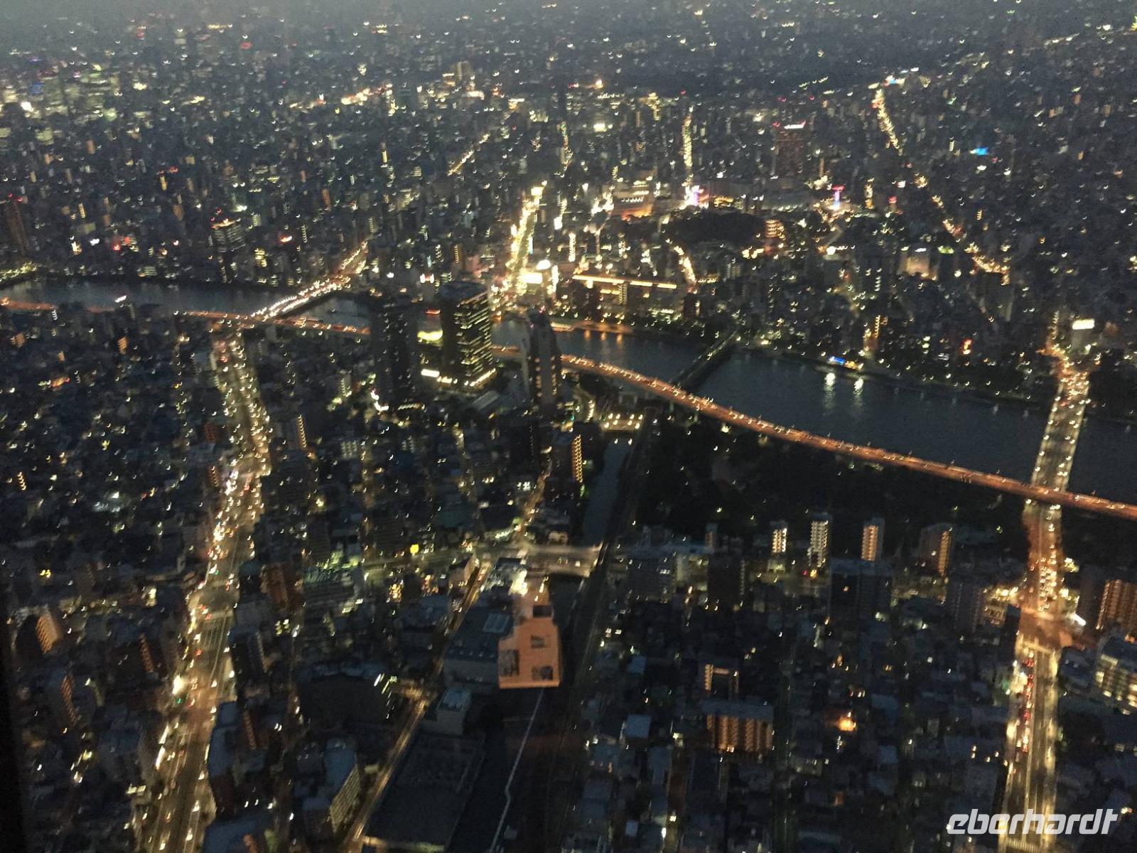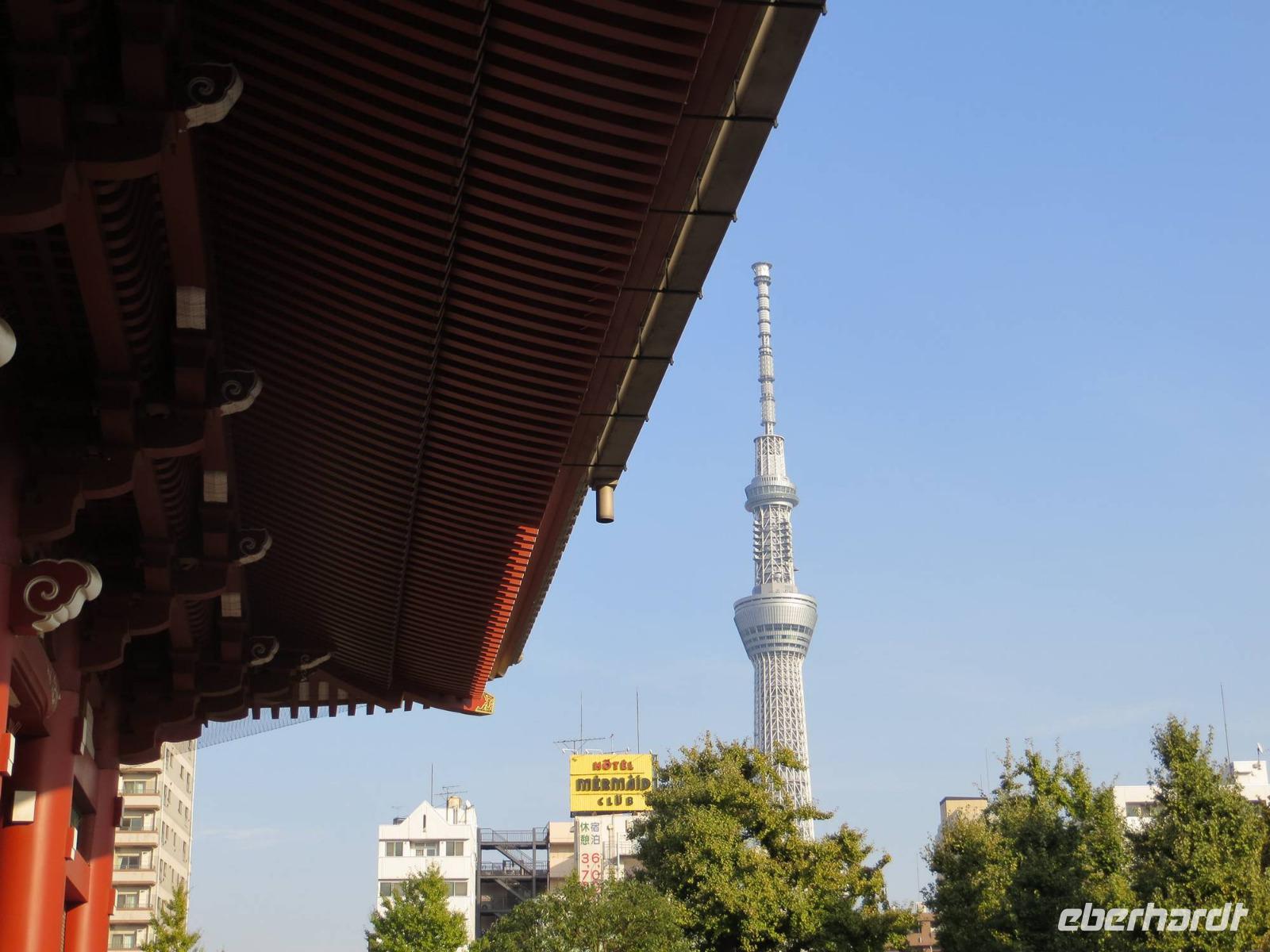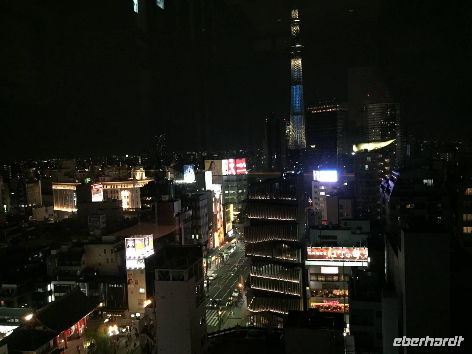 Da wir bereits 7:00 Uhr zum Flughafen müssen, erhalten wir auf das Zimmer eine etwas gewöhnungsbedürftige Frühstücksbox. Auf der Fahrt beantwortete Winnie uns teils sehr persönliche Fragen zum Leben als junges Paar bzw. Familie in Hongkong. Wir haben sie in der kurzen Zeit wirklich in unser Herz geschlossen. Dann heißt es Abschied nehmen und 4 Flugstunden später erreichen wir bereits Tokio! Die Paßkontrolle dauert etwas länger, aber alle sind sehr freundlich. Am Ausgang erwartet uns Stan, der uns an den kommenden 2 Tagen seine Wahlheimat zeigen wird. Stan ist Deutscher und lebt seit 9 Jahren mit Frau und Kind in Tokio. Heute werden wir nicht mit dem Bus zum Hotel chauffiert, sondern wir nutzen den schnellen Skyliner, der uns in einer ca. dreiviertel Stunde zum Bahnhof Ueno bringt. Hier steigen wir dann ins Taxi und gelangen so zum „The Gate Hotel Kaminarimon" im traditionellen Stadtteil Asakusa. Ungewöhnlich geht es weiter: die Rezeption befindet sich ganz oben im Hotel. Wir checken ein und genießen den fantastischen Abendblick hinüber zum hell erleuchteten „Sky-Tree" und zum Kannon-Tempel. Wir sind begeistert von unseren kleinen, aber geschmackvollen Zimmern und belustigt über die beheizten, musikalischen Toiletten. Anschließend wollen wir in einem nahegelegenen typischen Izakaya-Lokal zu Abend essen. Übersetzt heißen diese in Japan beliebten kleinen Restaurants soviel wie „Sake-Laden zum Sitzen" ?. Zuerst müssen wir unsere Schuhe ausziehen, dann sitzen wir auf auf bodennahen Bänken an niedrigen Tischen. Netterweise hat man den Boden unter den Tischen aber auch abgesenkt, so dass es für uns sehr bequem ist. Unsere Getränkebestellung sorgt für etwas Belustigung auf beiden Seiten, man hat nur 2 Flaschen Wein vorrätig (also nicht 2 Sorten, sondern 2 Flaschen eben). Einige von uns kosten den traditionellen Sake. Wir erhalten kleine japanische Köstlichkeiten, probieren uns mehr oder