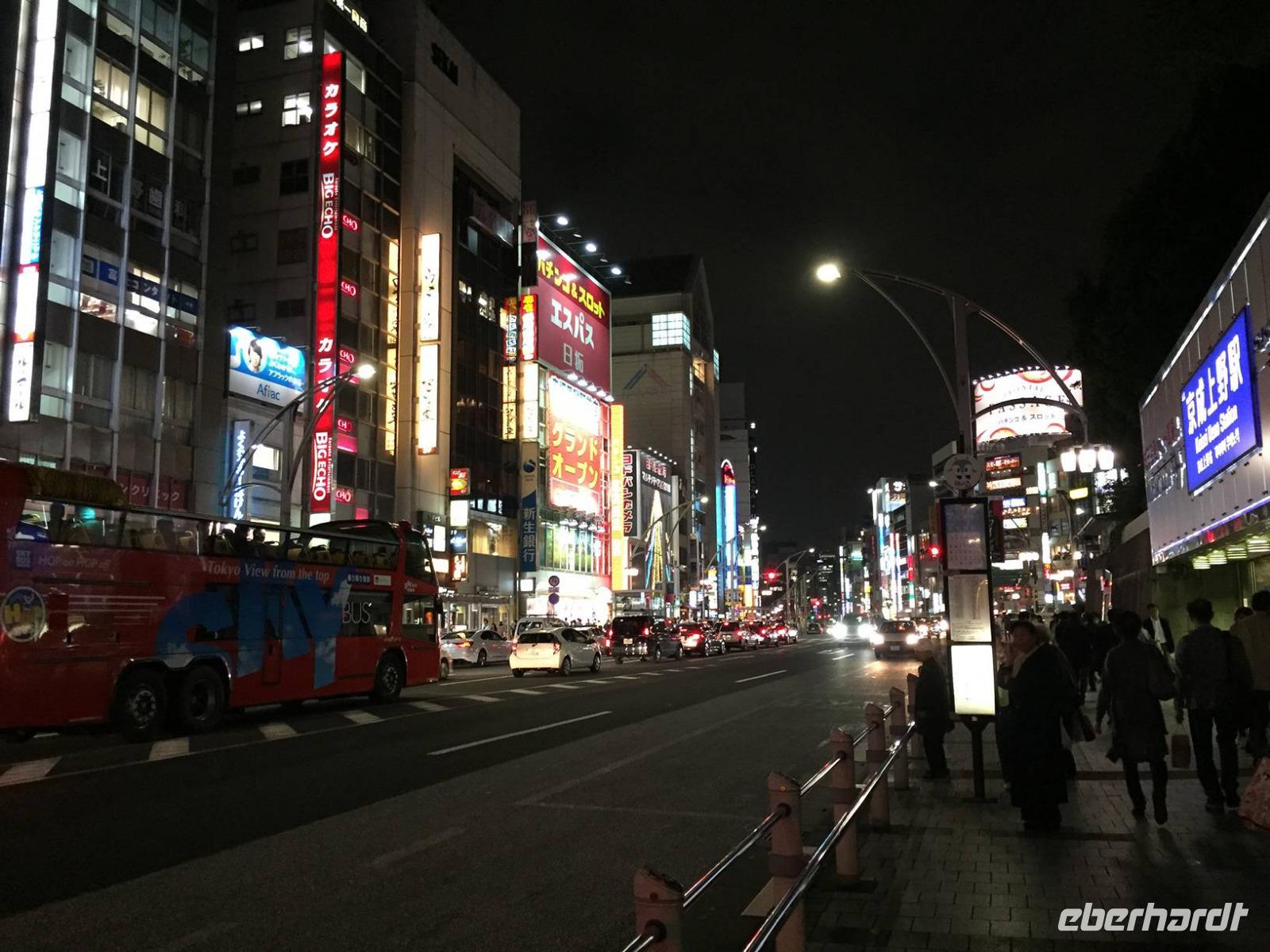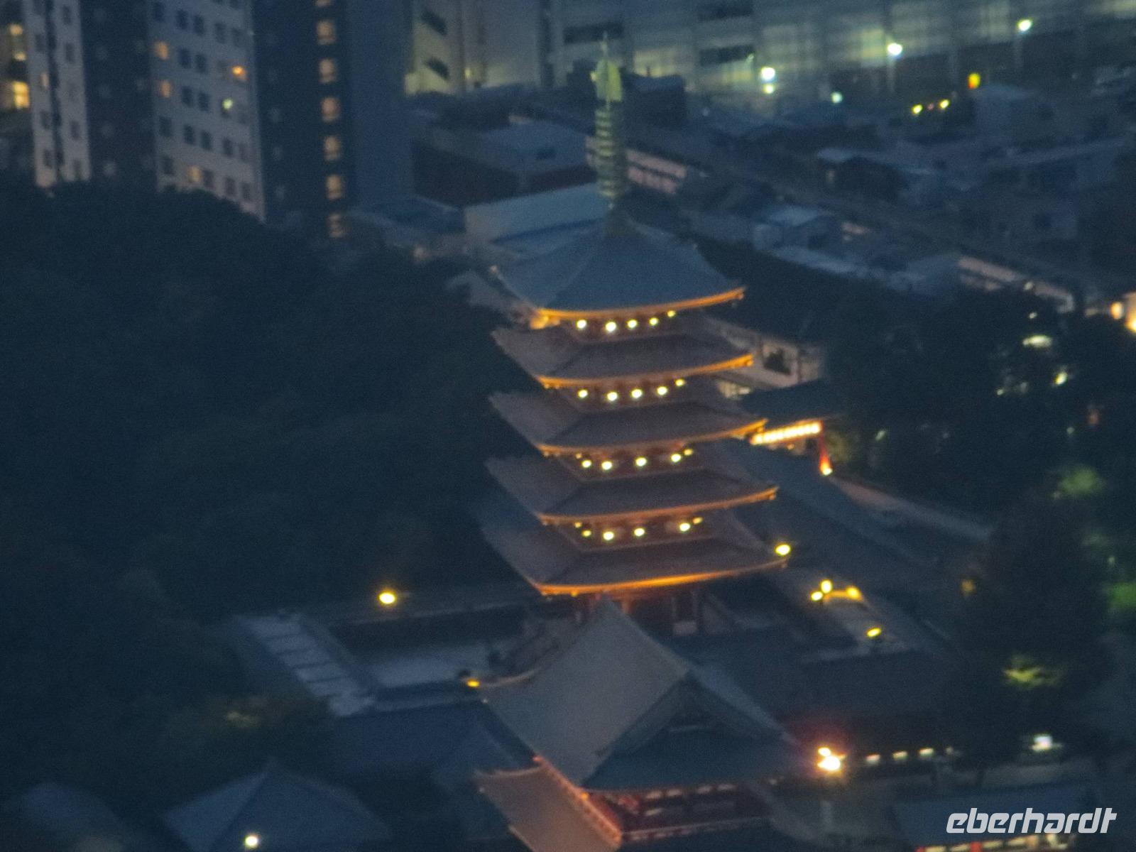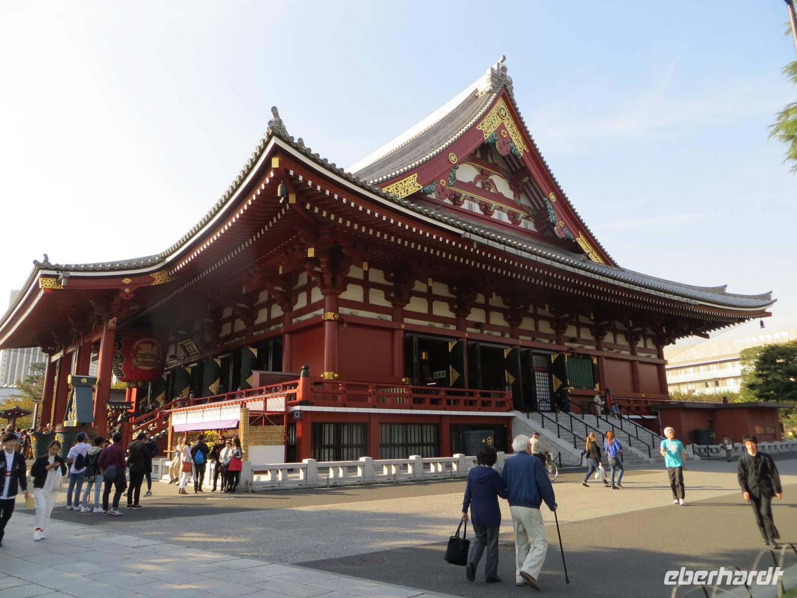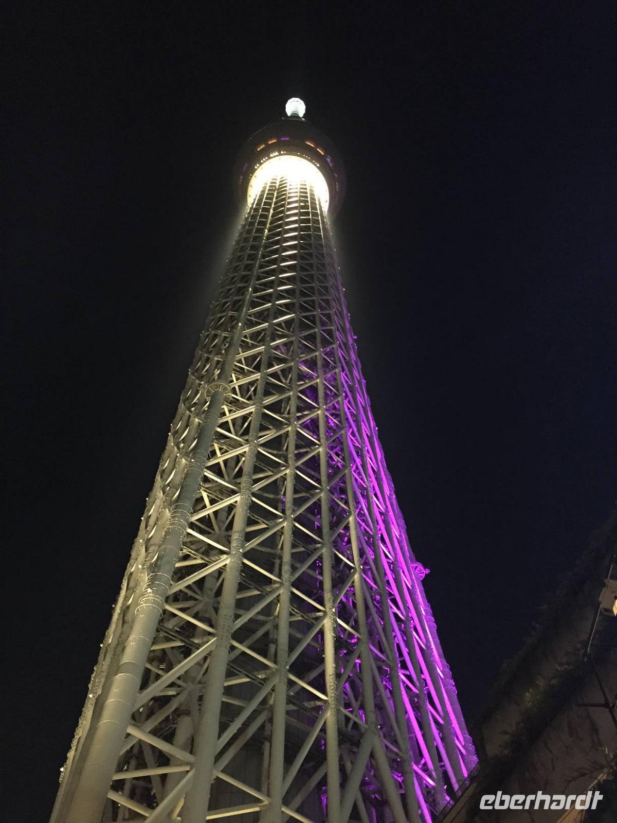 Da wir bereits 7:00 Uhr zum Flughafen müssen, erhalten wir auf das Zimmer eine etwas gewöhnungsbedürftige Frühstücksbox. Auf der Fahrt beantwortete Winnie uns teils sehr persönliche Fragen zum Leben als junges Paar bzw. Familie in Hongkong. Wir haben sie in der kurzen Zeit wirklich in unser Herz geschlossen. Dann heißt es Abschied nehmen und 4 Flugstunden später erreichen wir bereits Tokio! Die Paßkontrolle dauert etwas länger, aber alle sind sehr freundlich. Am Ausgang erwartet uns Stan, der uns an den kommenden 2 Tagen seine Wahlheimat zeigen wird. Stan ist Deutscher und lebt seit 9 Jahren mit Frau und Kind in Tokio. Heute werden wir nicht mit dem Bus zum Hotel chauffiert, sondern wir nutzen den schnellen Skyliner, der uns in einer ca. dreiviertel Stunde zum Bahnhof Ueno bringt. Hier steigen wir dann ins Taxi und gelangen so zum „The Gate Hotel Kaminarimon" im traditionellen Stadtteil Asakusa. Ungewöhnlich geht es weiter: die Rezeption befindet sich ganz oben im Hotel. Wir checken ein und genießen den fantastischen Abendblick hinüber zum hell erleuchteten „Sky-Tree" und zum Kannon-Tempel. Wir sind begeistert von unseren kleinen, aber geschmackvollen Zimmern und belustigt über die beheizten, musikalischen Toiletten. Anschließend wollen wir in einem nahegelegenen typischen Izakaya-Lokal zu Abend essen. Übersetzt heißen diese in Japan beliebten kleinen Restaurants soviel wie „Sake-Laden zum Sitzen" ?. Zuerst müssen wir unsere Schuhe ausziehen, dann sitzen wir auf auf bodennahen Bänken an niedrigen Tischen. Netterweise hat man den Boden unter den Tischen aber auch abgesenkt, so dass es für uns sehr bequem ist. Unsere Getränkebestellung sorgt für etwas Belustigung auf beiden Seiten, man hat nur 2 Flaschen Wein vorrätig (also nicht 2 Sorten, sondern 2 Flaschen eben). Einige von uns kosten den traditionellen Sake. Wir erhalten kleine japanische Köstlichkeiten, probieren uns mehr oder