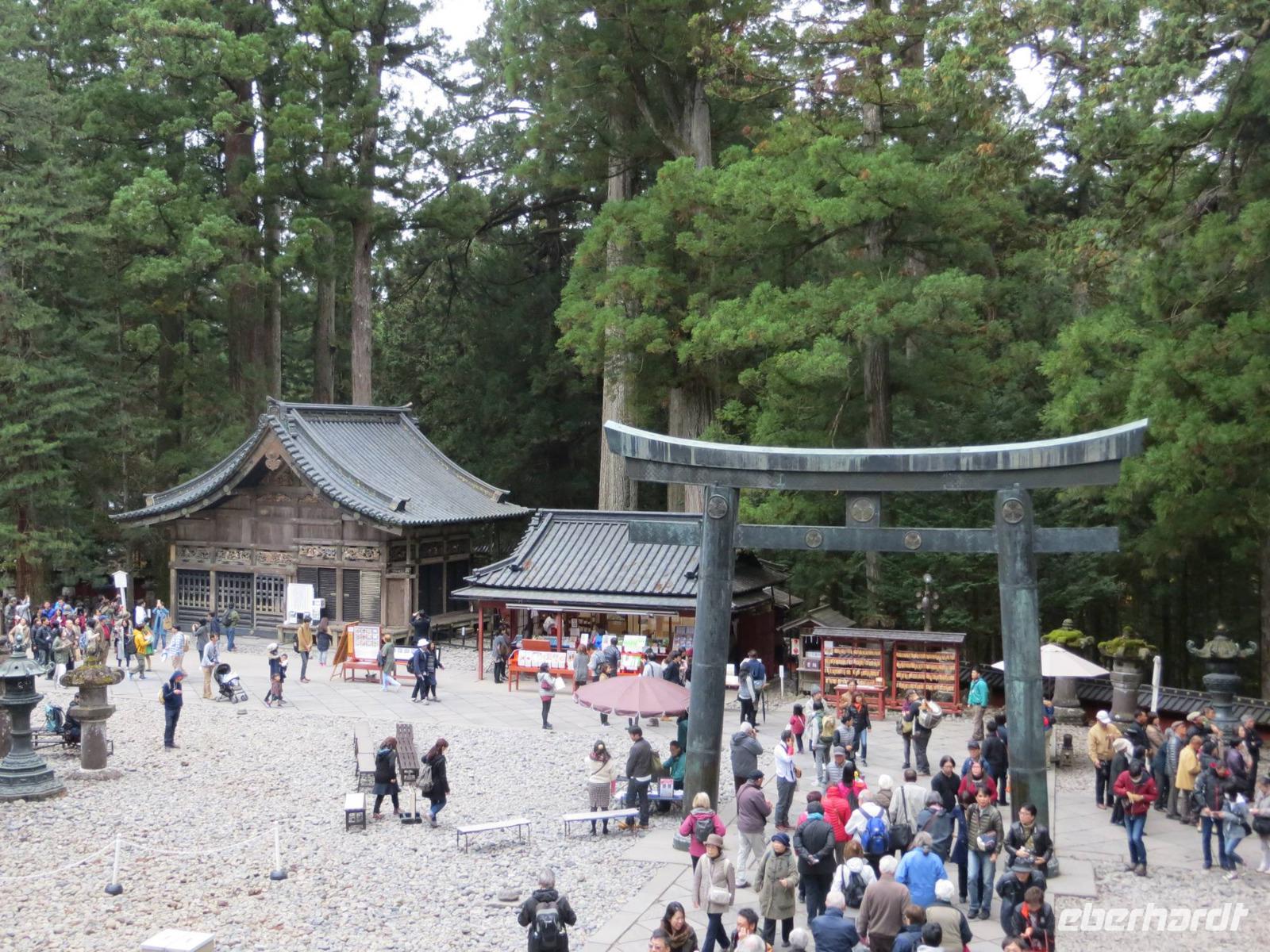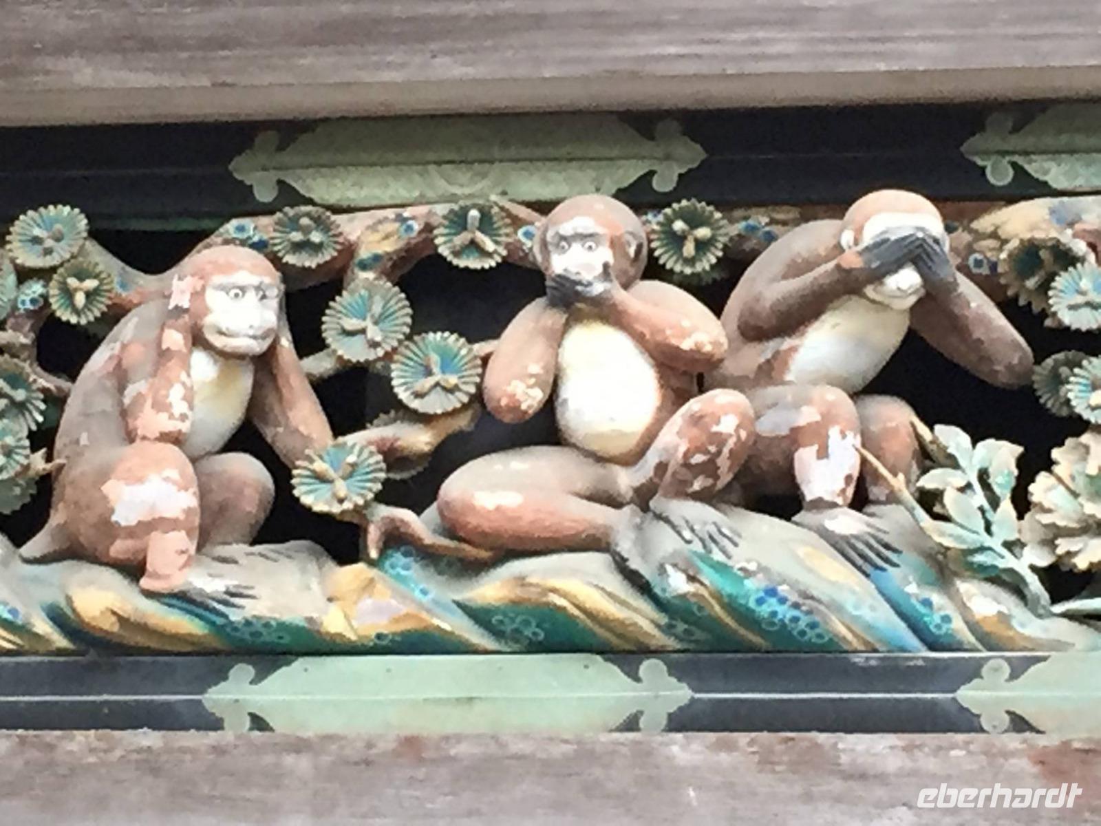 Um 8 Uhr checken wir aus und verlassen Tokio in Richtung Nikko. Leider stehen wir im Stau und erreichen das 140 km entfernte Tagesziel erst 11:00 Uhr. Nikko besteht aus über 20 größeren Gebäuden, an denen 100.000 Personen, darunter 10.000 Holzschnitzer gearbeitet haben sollen. Berühmt es ist für die Wandchnitzerei der 3 Affen, die den aus dem Buddhismus stammende Spruch „nichts (Böses) sehen, nichts (Böses) hören, nichts (Böses) sagen" darstellen. Einige der Schreine zählen zum Weltkulturerbe der UNESCO. Trotz der vielen Besucher und einem späten Mittagessen fahren wir zurück zum Tokioer Flughafen.