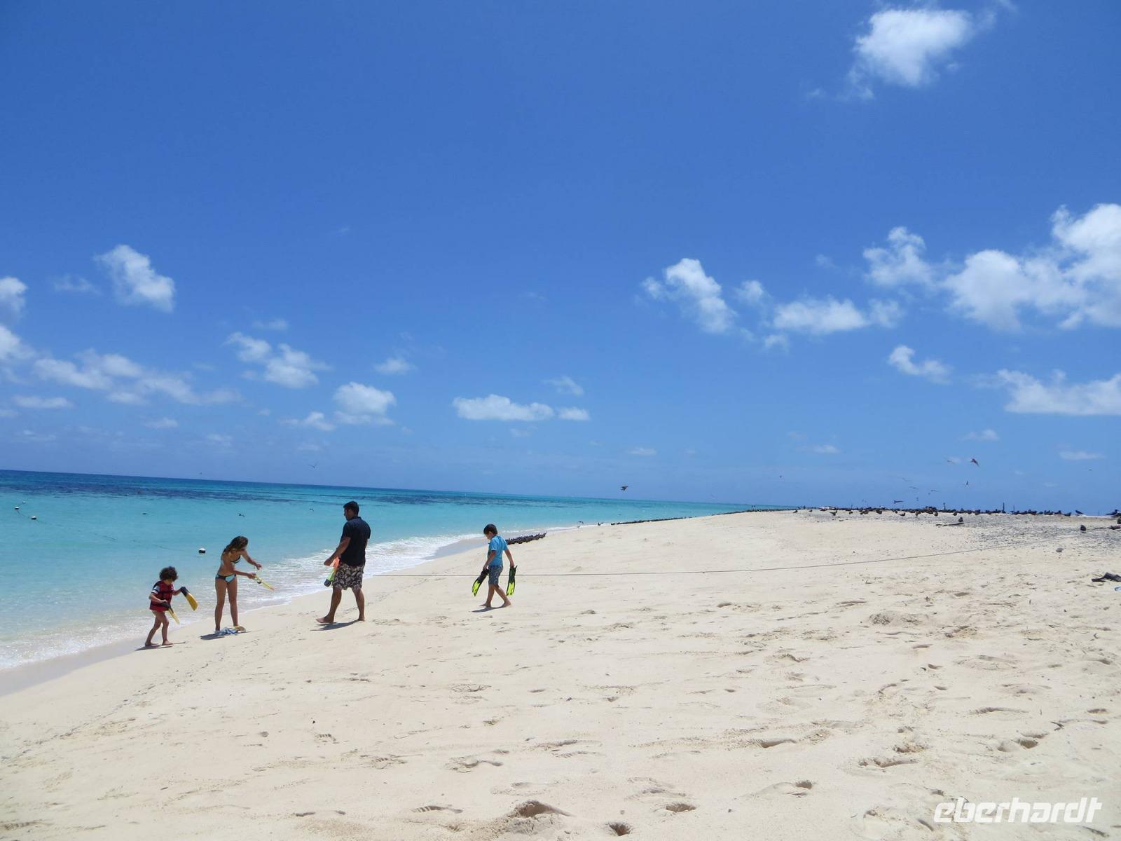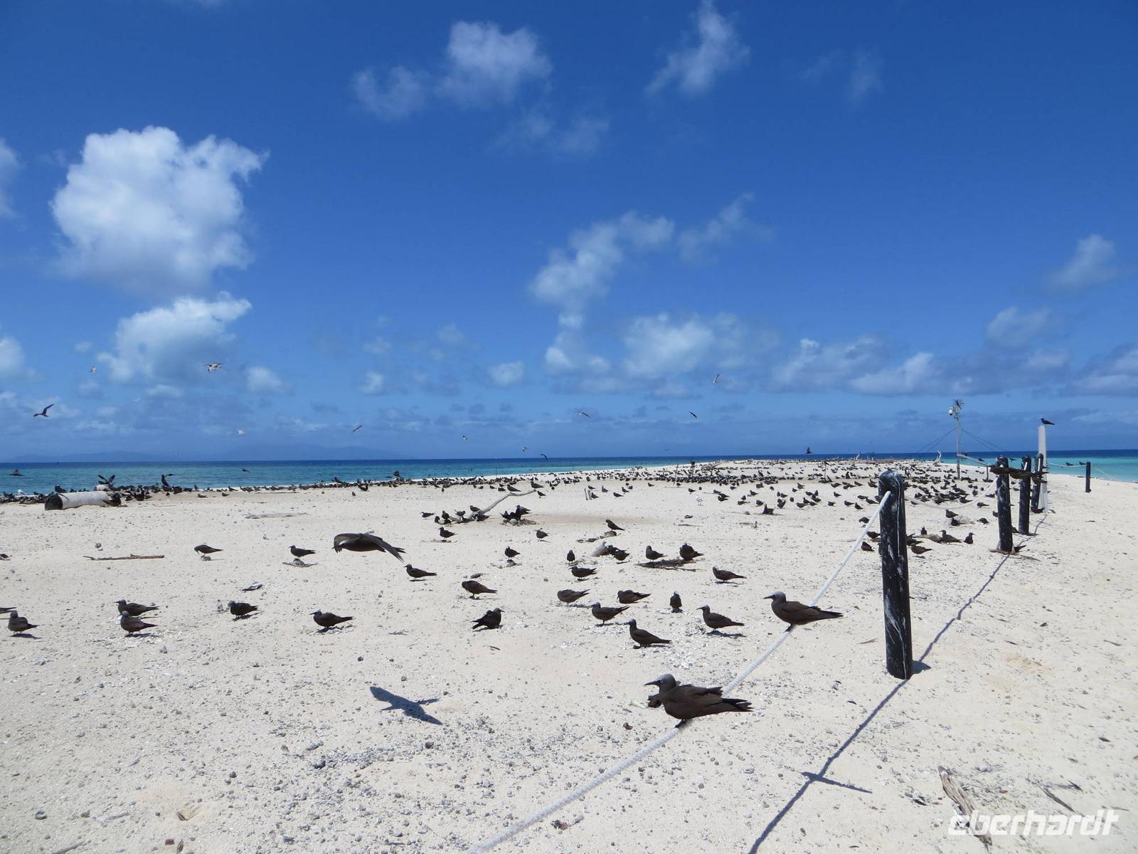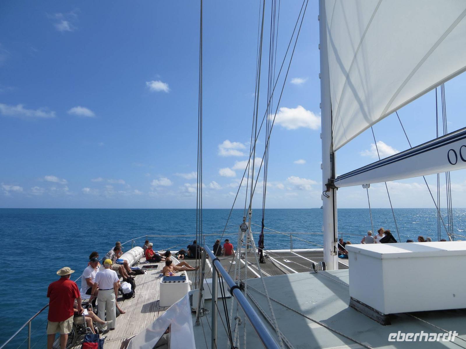 Heute steht das Great Barrier Reef, das größte und älteste Korallenriff der Welt, auf unserem Programm! Nach dem Frühstück wartet am Hafen unser Segelkatamaran „Ocean Spirit" auf uns. Die nächsten 2 Stunden fahren wir angenehm ruhig hinaus aufs Meer bis zur Insel Michaelmas Cay, vor der wir etwas entfernt ankern. Ein kleines Boot bringt uns hinüber zur Insel, ein Naturschutzgebiet, das wir uns mit tausenden Vögeln teilen. Wir genießen unseren Teil des weißen Sandstrandes, schwimmen und schorcheln in dem türkisblauen Meer ... Postkartenidylle pur. Später bringt uns das Beiboot zurück zum Katamaran, wo wir uns am Buffet stärken - baden macht bekanntlich hungrig. Nach dem Essen steigen wir ins Glasboden-Boot und wir erfahren noch mehr Interessantes zu dieser beeindruckenden Unterwasserwelt. Am Nachmittag startet die „Ocean Spirit" die Rückfahrt nach Cairns, die wir zum Teil entspannt auf dem Sonnendeck verbringen. Es war ein Bilderbuchtag, den wir mit seiner ganzen Ruhe sehr genossen haben.