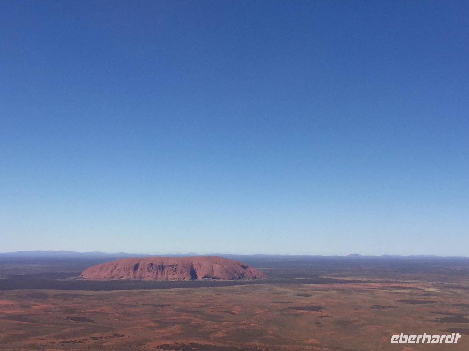 Am frühen Morgen verabschieden wir uns von Gabi und dem Norden Australiens. In knapp 3 Stunden werden wir das Outback erreichen. Schon von oben erhalten wir einen beeindruckenden Überblick über die karge, rotgefärbte Landschaft, mit ausgetrockneten weißen Salzseen und kurz vor der Ankunft erblicken wir auch den imposanten Uluru, eines der bekanntesten Wahrzeichens Australiens.