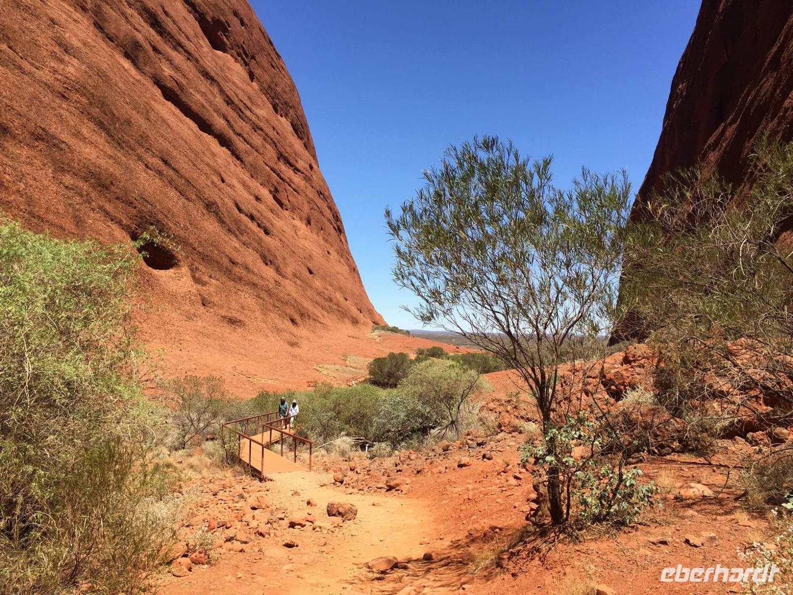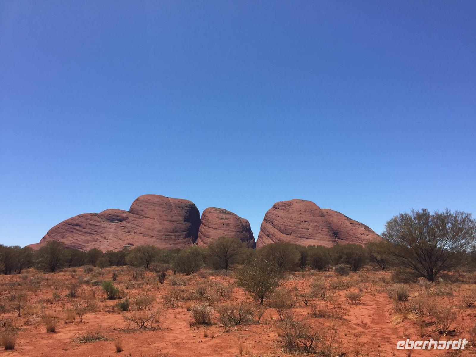 Am kleinen Flughafen empfangen uns 35°C und unsere örtliche Reiseleiterin Eva. Nach einer herzlichen Begrüßung beginnen gleich mit dem Programm: unser erstes Ziel sind die Olgas bzw. die Kata Tjuta. Insgesamt 36 Felskuppeln leuchten rostrot in der Sonne. Trotz Hitze unternehmen wir einen kleinen Spaziergang entlang der „Walpa Gorge". In der „Windigen Schlucht" geht jedoch nicht das geringste Lüftchen. Wir entdecken in dieser steinigen Landschaft dafür überraschenderweise das ein oder andere blühende Pflänzchen mit lustigem Name, wie „Mulla Mulla".
