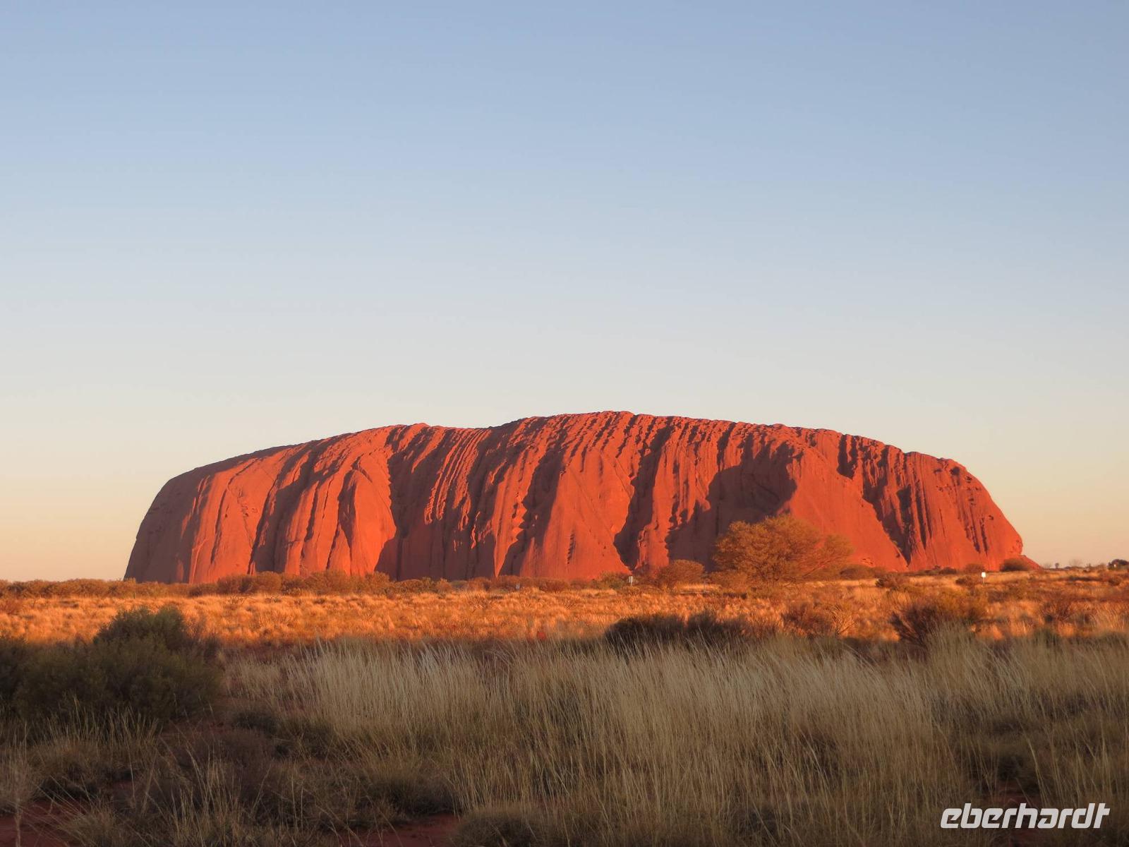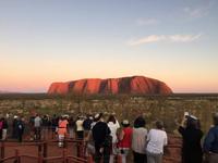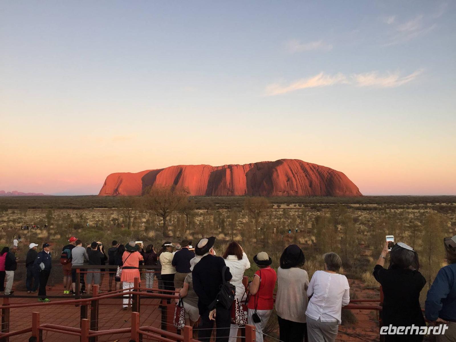 Gegen Mittag erreichen wir das „Outback Pioneer Hotel & Lodge", unsere Unterkunft für die kommenden 2 Nächte. Wir essen zu Mittag, kaufen Souvenirs und einige von uns testen den Pool. Zu heute den Sonnenuntergang am Uluru (vielen bekannter unter dem Namen Ayers Rock) erleben. Der heilige Inselberg der Aborigines ist ca. 3 km lang und 2 km breit! Vom gegenüberliegenden Aussichtspunkt genießen wir ein besonderes Naturschauspiel bei einem (oder zwei) Glas Sekt und kleinen Snacks: die untergehende Sonne taucht den Uluru immer wieder in ein neues atemberaubendes Licht und wir schießen unzählige Fotos.