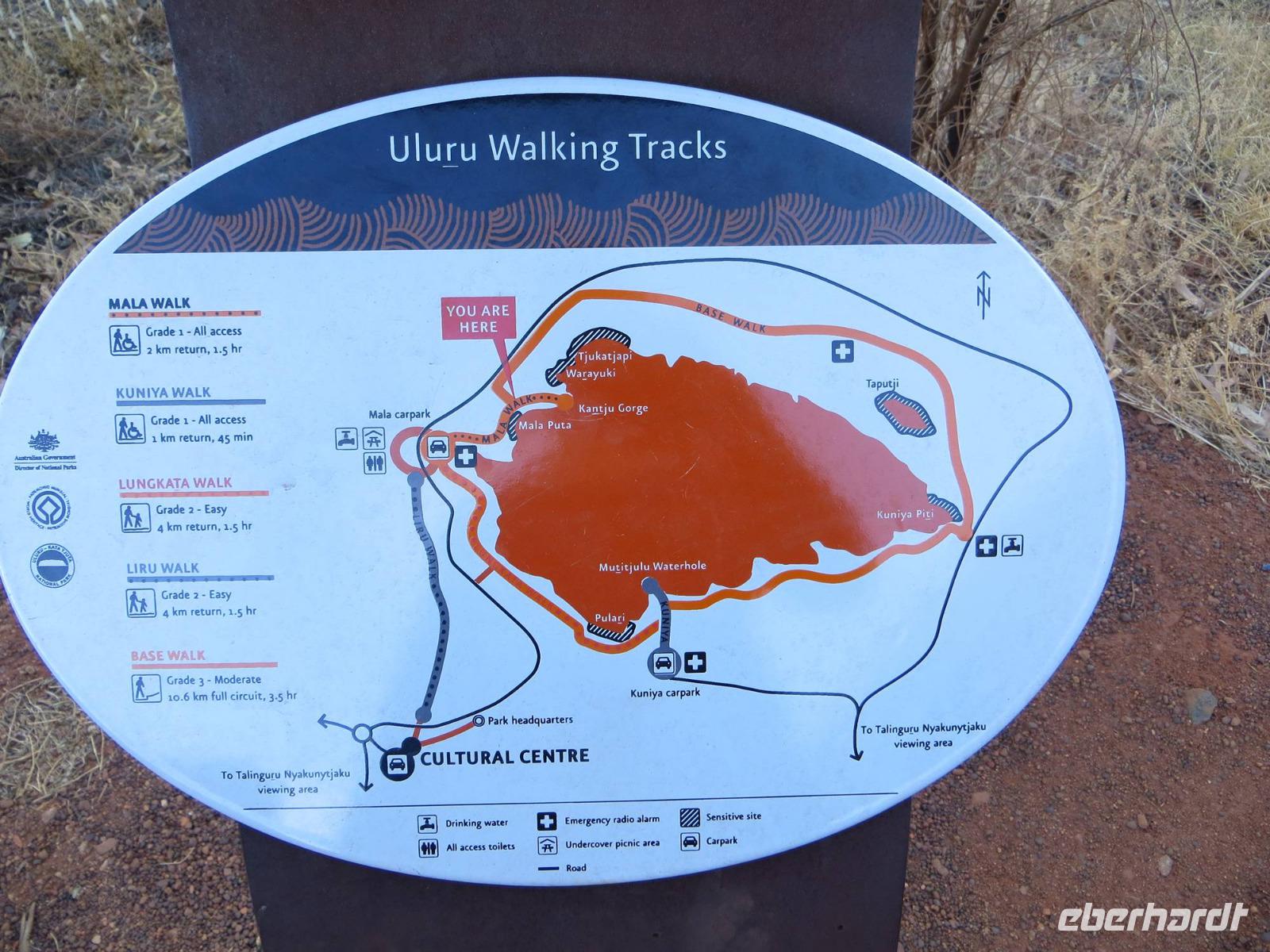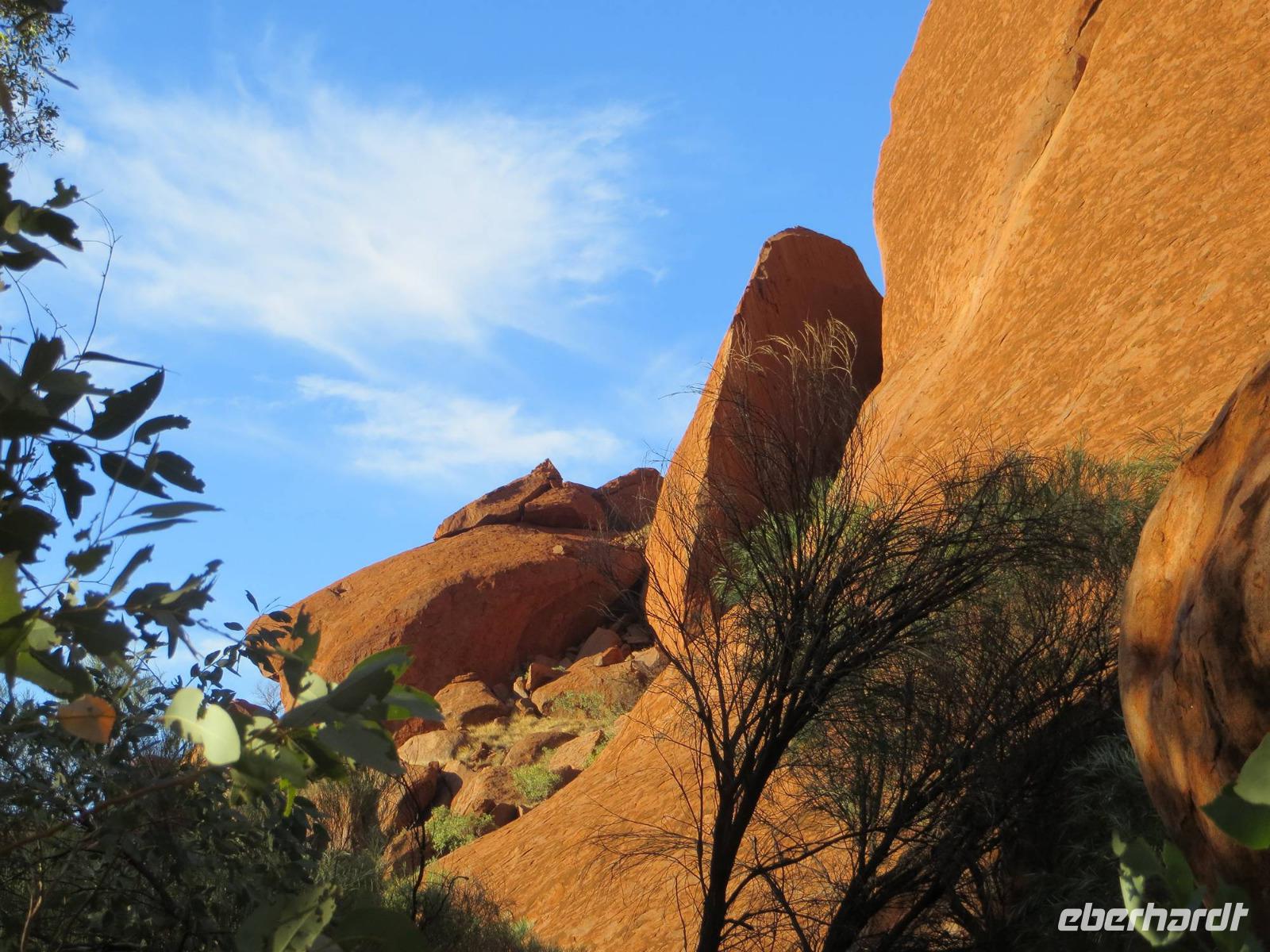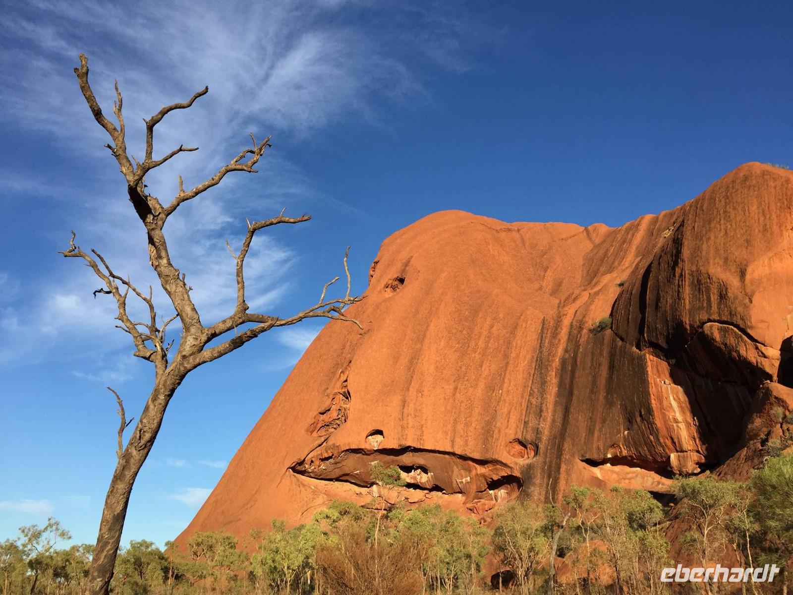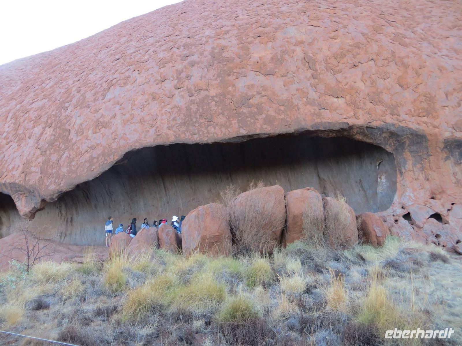 Nachdem wir ein kleines Stück mit dem Bus direkt an den Fuß des Ulurus gefahren sind unternehmen wir bei angenehmen kühlen morgendlichen Temperaturen einen kleinen Spaziergang zum Mutitjulu Wasserloch. Unterwegs besichtigen wir Höhlenmalereien der Aborigines und erfahren von Eva vieles über die Traumzeitgeschichte und den Uluru-Legenden der Ureinwohner. Ein weiterer Spaziergang führt uns zur u.a. zur Mala Puta, einer heiligen Höhle, die den Aborigines-Fragen gehört und weiteren Höhlen.