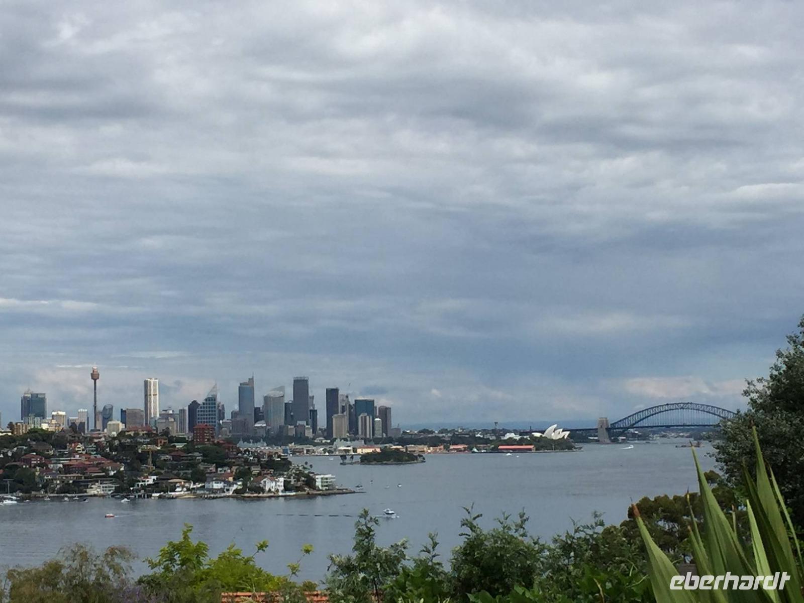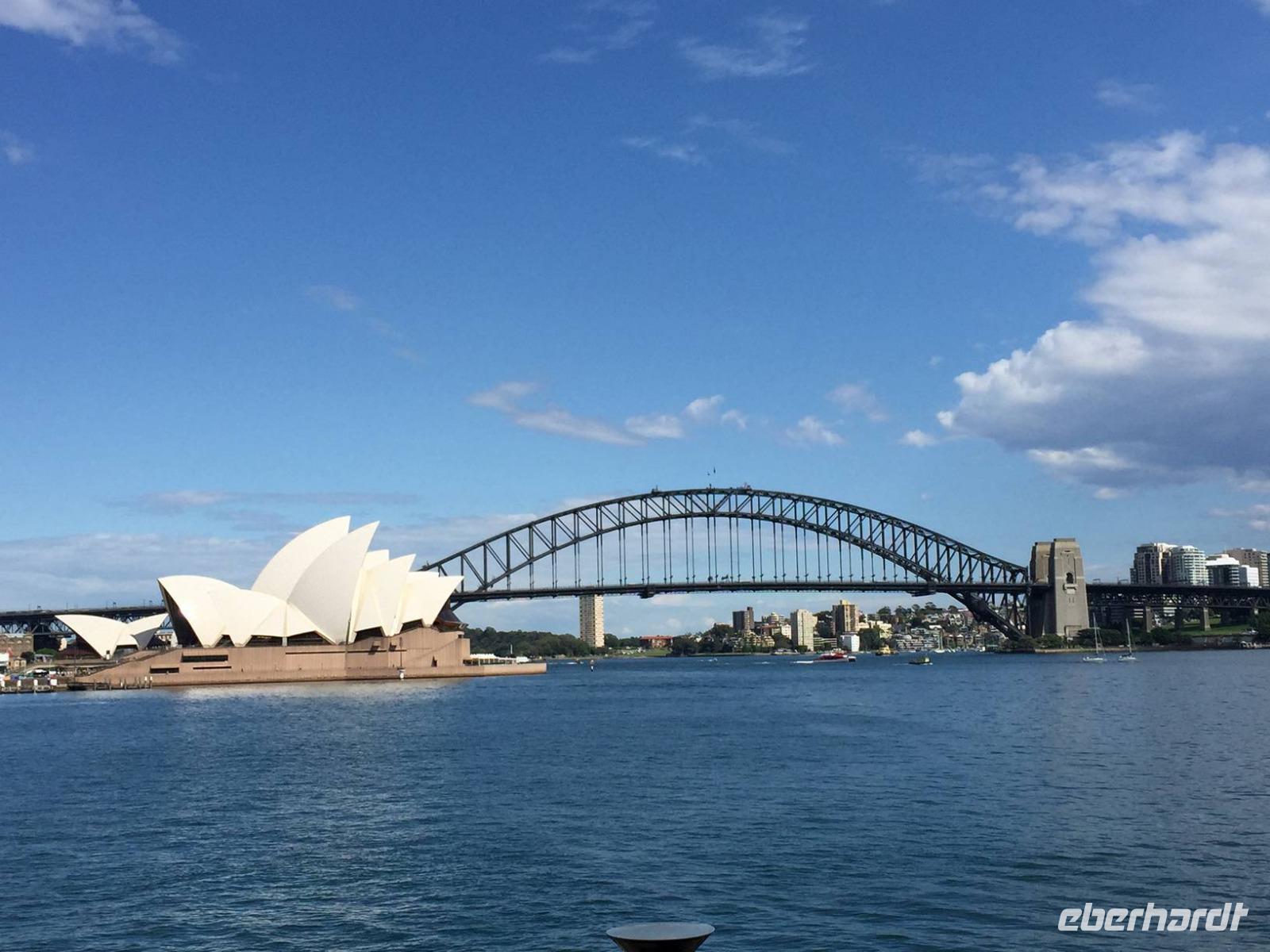Heute verlassen wir die quirlige Weltmetropole und fahren zu den Blue Mountains. Das Gebirge gehört zum Weltnaturerbe und besteht aus ca. 90 Arten verschiedener Eukalyptusbäumen. Diese verdunsten ein ätherisches Öl, das bei Tageslicht die Landschaft in einem blauen Ton taucht. Uns erinnert das Sandstein-Plateau unmittelbar an die verschiedenen Felsformationen der Sächsischen Schweiz. Wir spazieren zu den Felsentürmen, die „Die 3 Schwestern" genannt werden, hören von Uli die dazugehörige Traumzeitlegende der Aborigines (die 3 Schwestern wurden zum eigenen Schutz von ihrem Vater versteinert), genießen die abwechslungsreiche Pflanzenwelt und den grandiosen Rundumblick am Echopoint. Mit dem Bus geht es später weiter zu einem weiteren Aussichtspunkt und anschließend nach Leura. In dem kleinen Städtchen bummeln wir durch die individuellen Geschäften. Nach einem nicht so überzeugendem Mittagessen im örtlichen Golfklub fahren wir zum Featherdale Wildlife Park. Hier lernen wir die australische Tierwelt hautnah kennen, streicheln Archer - einen flauschigen Koalabären und füttern Kängurus, die sich hier frei bewegen können.Auf der Rückfahrt wollen wir noch am Sydney Olympic Park stoppen, leider können wir nicht durch den kompletten Park fahren, da heute Abend ACDC hier im Stadion auftritt (und eine Dame der Eberhardt-Weltreisegruppe einen tollen Konzertabend beschert?) Nach der Rückkunft im Hotel verabredet sich ein Teil der Gruppe zum gemeinsamen Besuch der O-Bar. In ca. 150 m Höhe dreht sich das Restaurant in knapp 1,5 Stunden einmal um 360° Wir genossen leckere Cocktails und Snacks bei einer grandiosen Aussicht auf Sydney mit seiner Oper und Harbour Bridge. Anschließend liefen wir noch ein letztes Mals zum Darling Harbour und erlebten ein farbenprächtiges Feuerwerk! Ein toller Abschied in einer beeindruckenden Stadt. Wir haben alle den Aufenthalt in Sydney und Australien sehr genossen und so manch eine/r wird bestimmt wiederkommen.