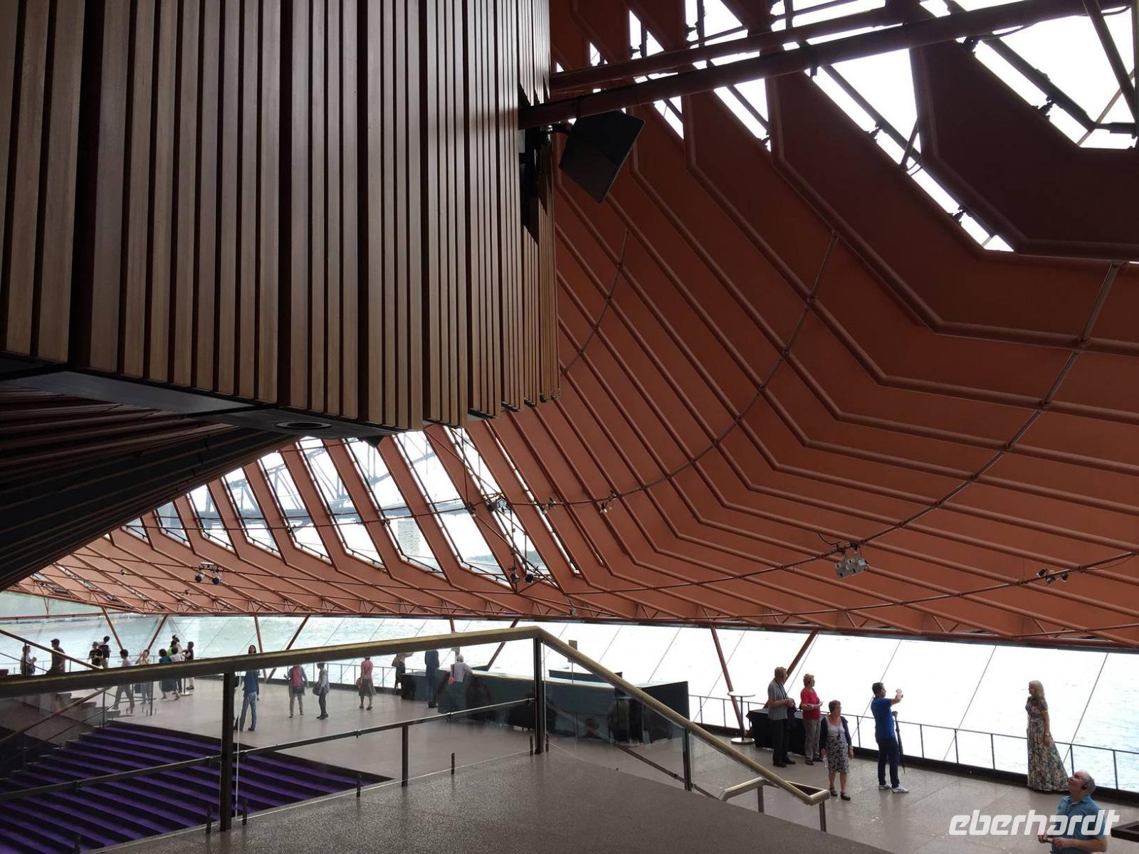 Wir fahren zurück nach Sydney und während es erneut regnet und stürmt unternehmen wir als Überraschung eine ausführliche Führung durch das beeindruckende Opernhaus. Wir erfahren viel über die Entstehung, die Architektur und aktuellen Programme der Bühnen. Leider sind heute und an den kommenden Abenden alle Veranstaltungen ausgebucht.