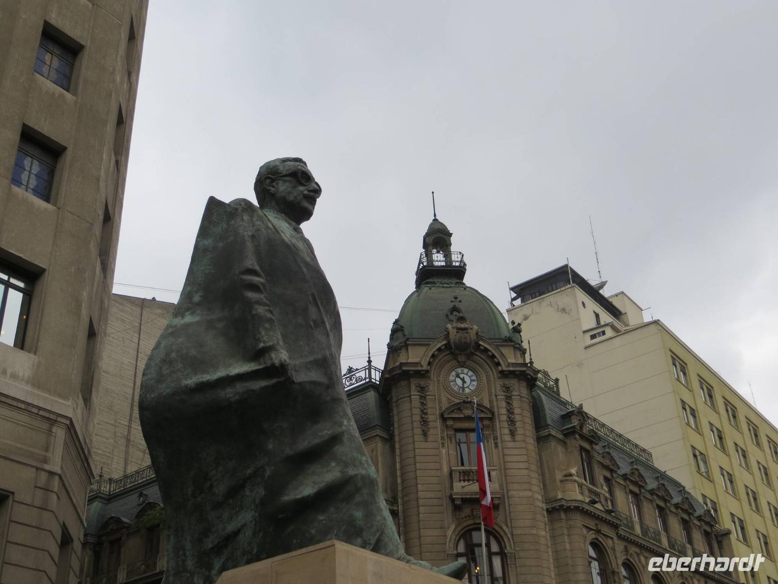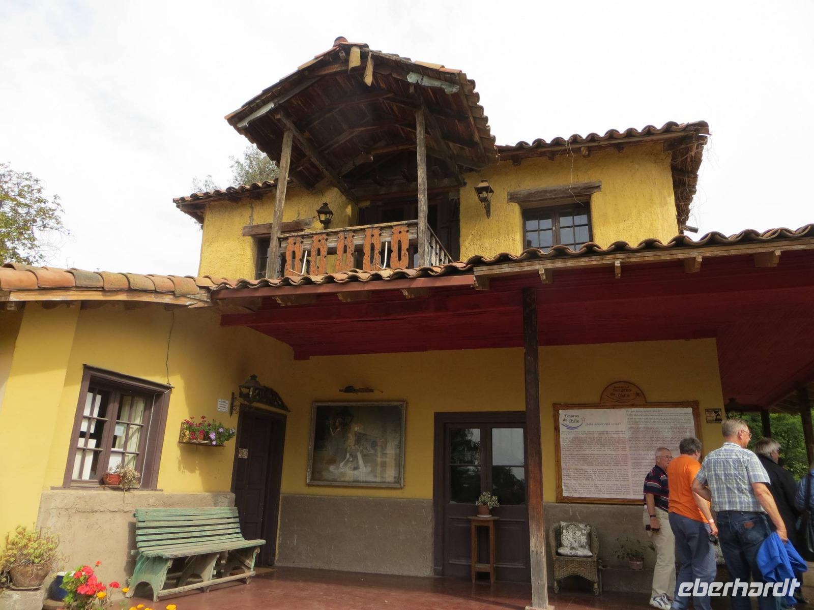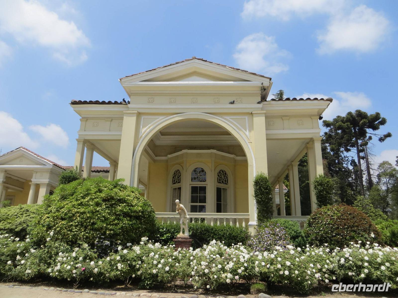 Nach dem leckeren Frühstück im Hotel lernen wir weiter zu Fuß Santiago kennen, wir besuchen die alte Börse und erleben eine Wachablösung am Regierungspalast. Leider ist der Himmel bewölkt und Santiago erscheint uns grauer als es ist. Dann verlassen wir die Großstadt und Santiago und fahren ins Weinanbaugebiet im Maipo-Tal. Wir besuchen das bekannte Weingut „Concha y Toro", dem größten Chiles. (Anmerkung für meine Reisegäste: eine Woche nach Weltreisende bekam ich Rotwein von hier im Steakhouse in Pirna in der Sächsischen Schweiz zum Essen empfohlen?) Wir spazieren durch die gepflegten Parkanlagen, besichtigten die Weinkeller, sahen in einem von ihnen den Leibhaftigen, verkosten natürlich diverse Weine und genossen eine wunderschöne Zeit, nun voller Sonnenschein. Unweit vom Weingut gelegen befindet sich eine tolle alte Hazienda - die Tesoros de Chile. Hier essen wir spät, aber auf das Köstlichste zu Mittag. Sergio, der Eigentümer, Koch, Service (und Gärtner?) ist ein toller Gastgeber. Wir haben uns rundum wohlgefühlt. Das Haus gleicht einem kleinen, liebevoll eingerichteten Museum und der Garten hat uns begeistert. Nach diesem tollen Erlebnis fuhren wir zurück nach Santiago.