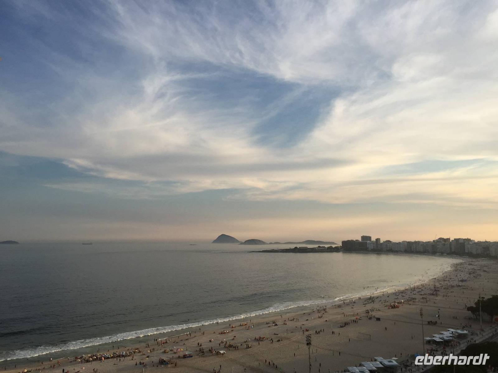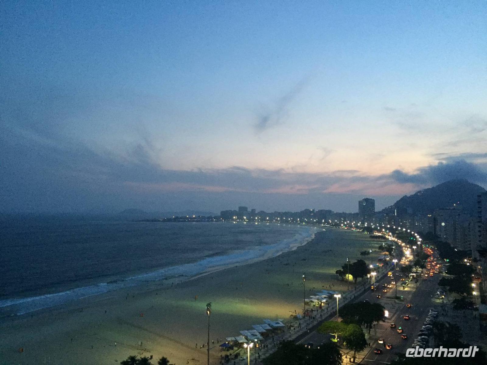 Wir fahren zum Hotel „Excelsior Copacabana" gefahren. Wie der Name so die Lage - wir wohnen direkt an der berühmten Copacabana! Zur Begrüßung treffen wir uns auf der Dachterrasse und genießen mit einem Caipirinha den herrlichen Ausblick auf den langgezogenen Strand, aufs Meer, den Zuckerhut auf der einen Seite und die angestrahlte Christus-Statue hoch oben auf dem Corcovado auf der anderen.