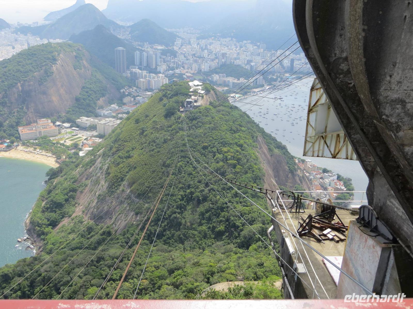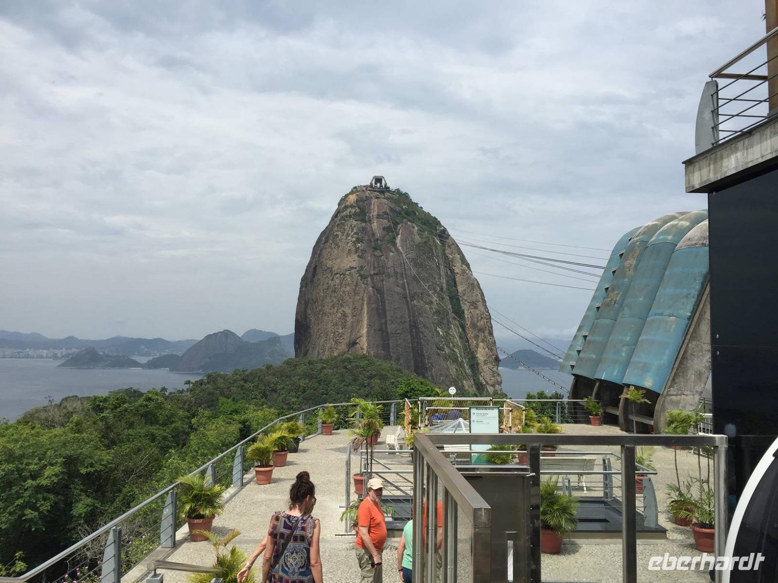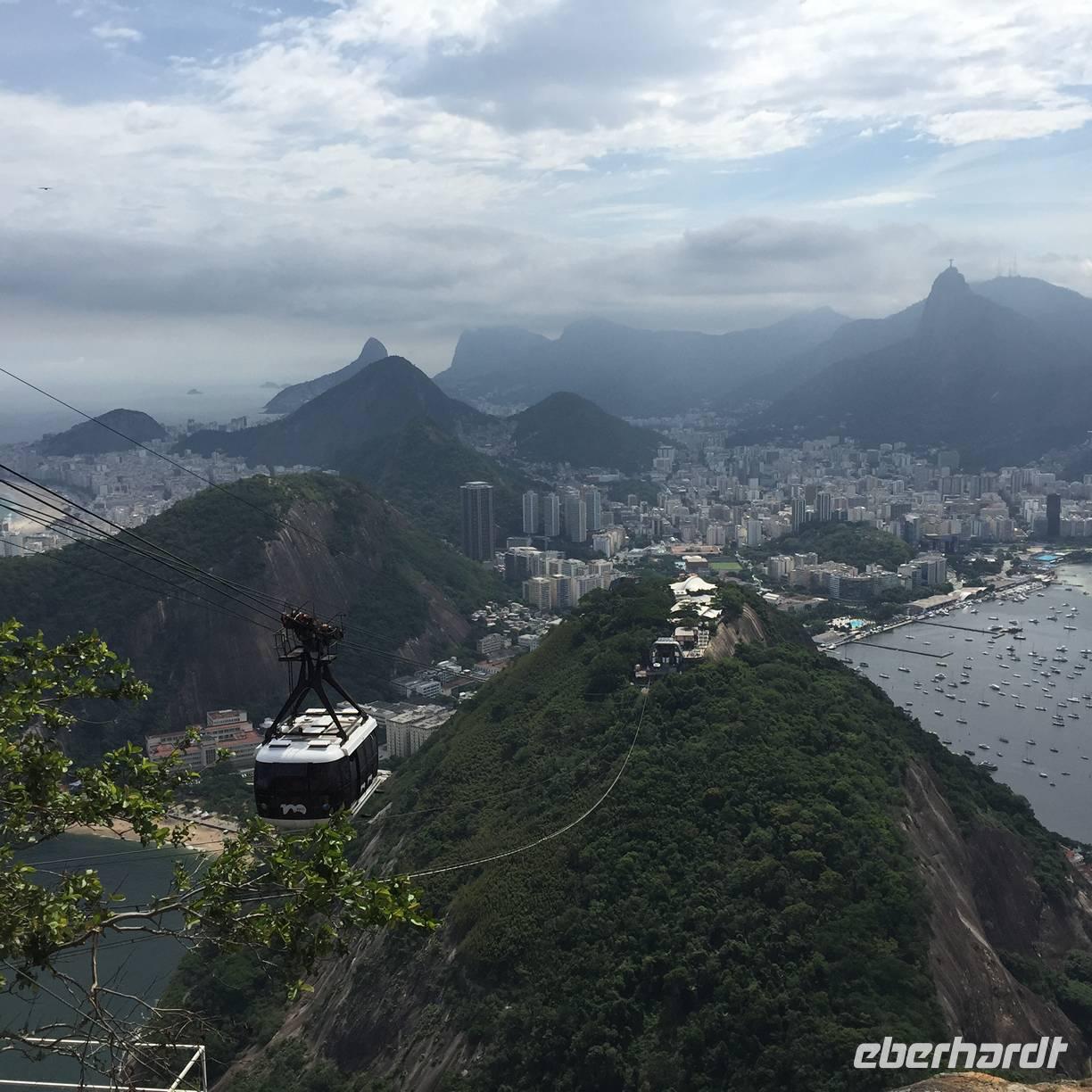 Die Auffahrt mit der Seilbahn ist zweigeteilt. Von der Talstation aus führt uns der erste Streckenabschnitt auf den 226 Meter hohen Morro da Urca. Hier genießen wir die verschiedenen Aussichten u.a. auf das Olympiagelände der Ruderer 2016. Dann geht es weiter mit der vollverglasten Seilbahn auf den benachbarten Zuckerhut, der aus dem Meer herausragt. Oben in knapp 400 Meter Höhe angekommen, genießen wir einfach nur die spektakuläre Aussicht bei diesem herrlichen Wetter.