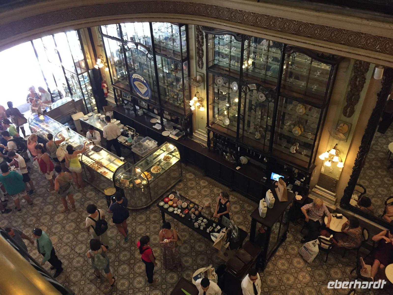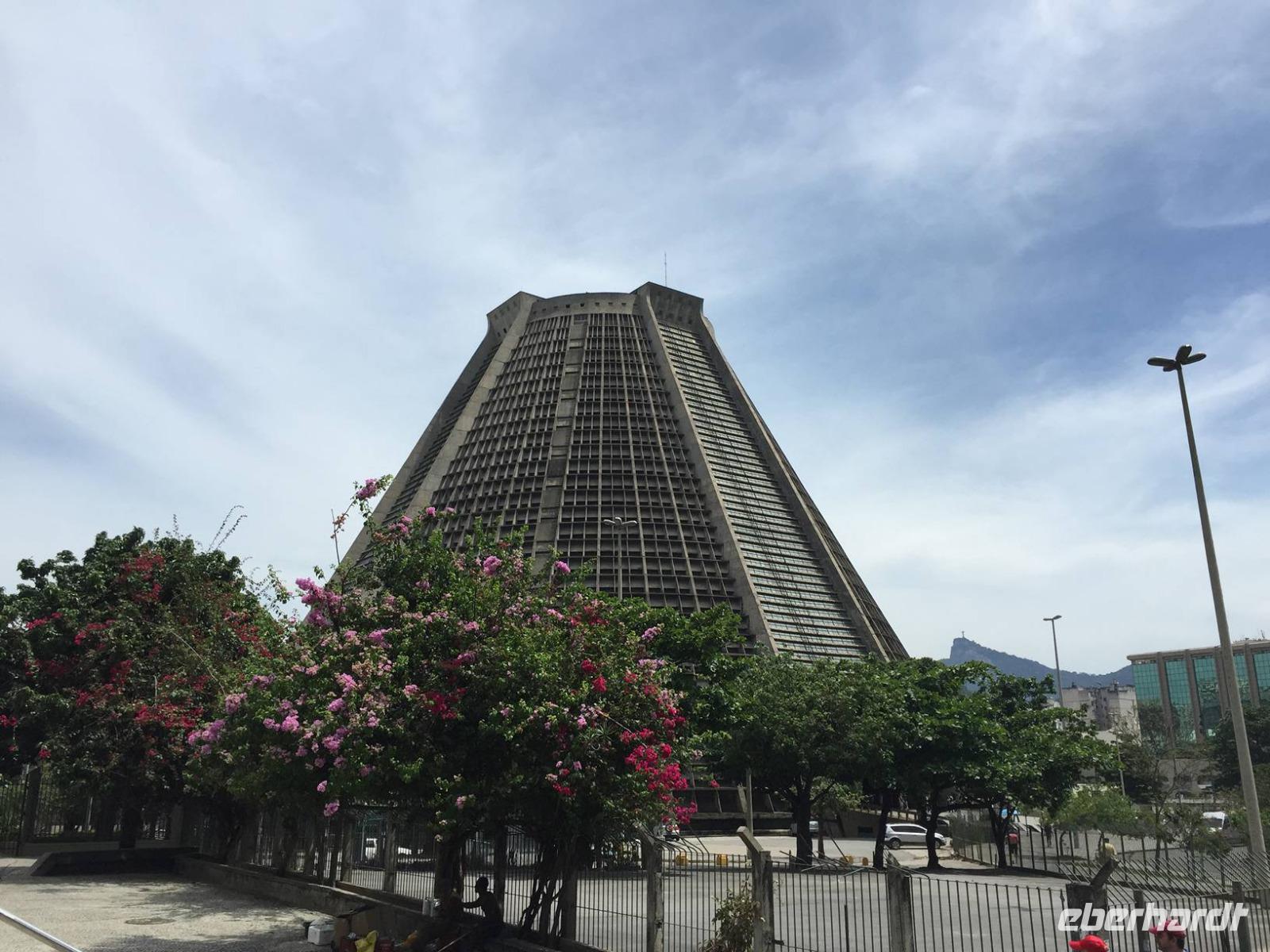 Am Vormittag genießen wir noch etwas die Copacabana, bevor wir am Mittag auschecken und mit dem Bus in die Altstadt von Rio fahren. Im zwar vollen, aber wunderschönen Jugendstil-Café, der „Confeitaria Colombo", essen wir landestypische Speisen zum Mittag, bummeln durch die Straßen, besuchen die „Catedral Metropolitana", wo hunderte Pärchen eine „Massen-(zweite)-Trauung" proben, wir halten kurz an der Oper bevor wir zur „Escadaria do Seláron" - der bunten Fliesentreppe gelangen. Wir entdecken Fliesen aus der ganzen Welt auch von deutschen Städten wie Heidelberg, Nürnberg, Stralsund und der Insel Rügen! Vorbei am berühmten Sambodromo, wo alljährlich der weltberühmte Karneval von Rio gefeiert wird, gelangen wir zum „Heiligen Tempelplatz der Deutschen" wie Carlos