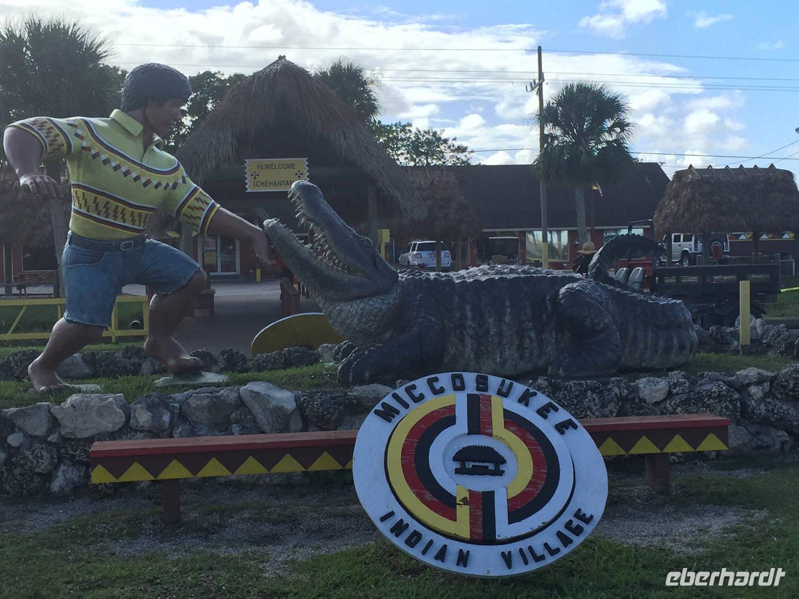 Wir erhalten alle Ohrstöpsel und starten unser Fahrt mit einem Propeller-Boot . Wir fliegen nahezu über die Wasserfläche, sehen viele Seerosen und andere Wasserpflanzen, stoppen an einem ehemaligen Indianerdorf und der Bootsführer erzählt uns einiges zum Leben vor über 200 Jahren in diesem Gebiet. Anschließend geht es zurück zum Ausgangspunkt unserer Tour. Hier nehmen wir an einer Führung durch das nachgebaute Miccosukee-Indianerdorf teil, besuchen eine kleine Alligator-Shoh und lassen uns (ein zweites Mal auf dieser Reise) mit einem Baby-Alligator im Arm fotografieren.
