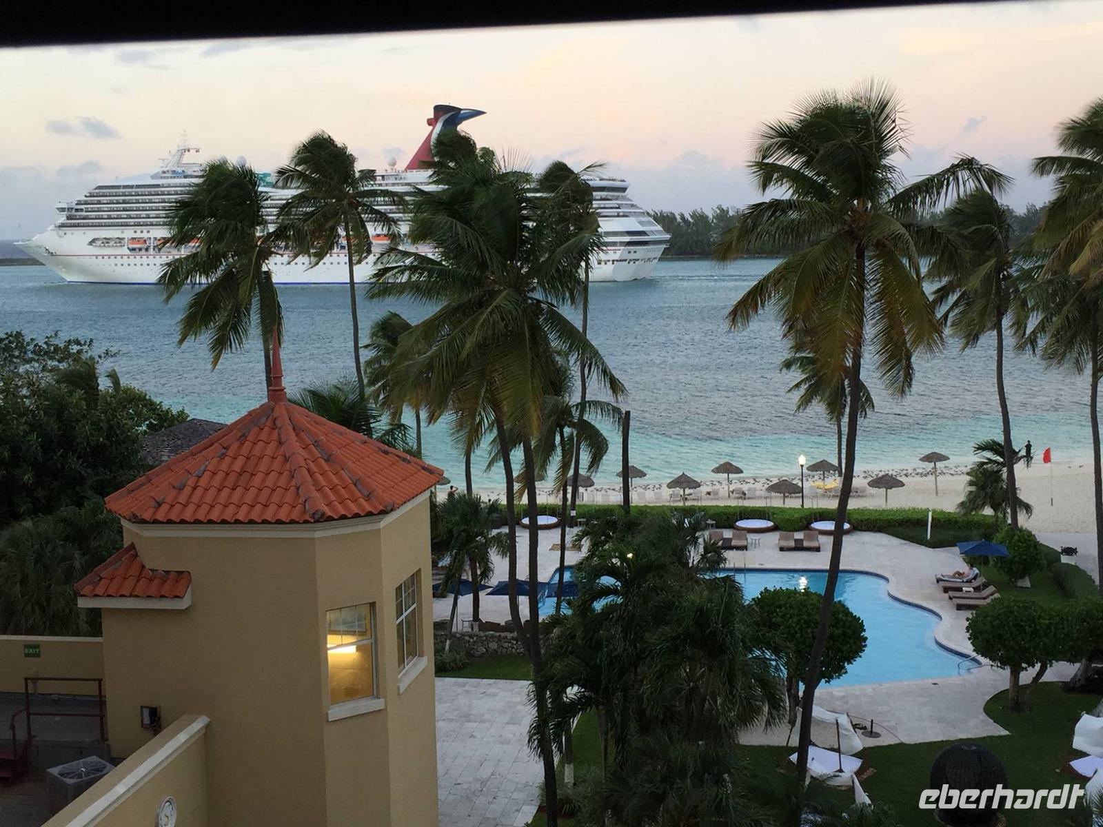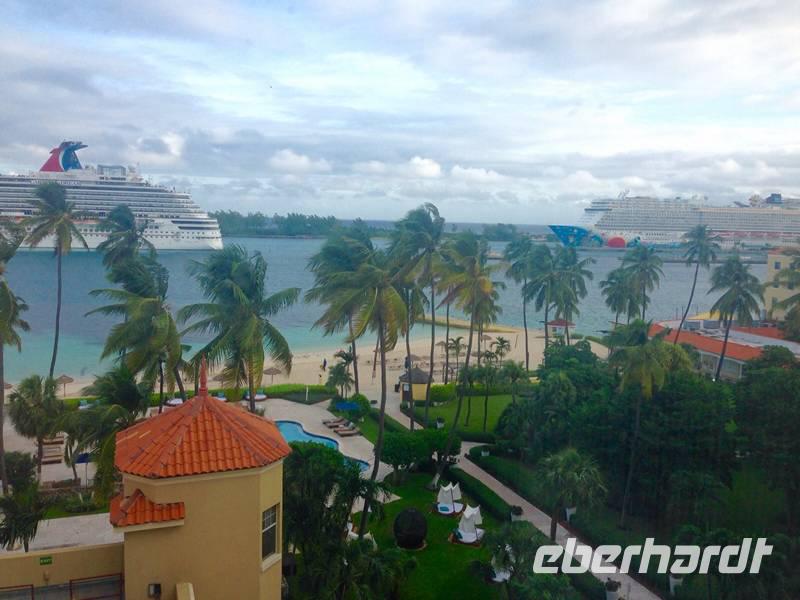 Bereits von oben freuen wir uns über das türkisblaue Meer mit den unzähligen Inseln. Ohne Probleme geht unsere letzte Einreise von statten und wir fahren zum „British Colonial Hilton" Hotel, dass sich direkt in Nassau am Hafen mit den riesigen Kreuzfahrtschiffen befindet.