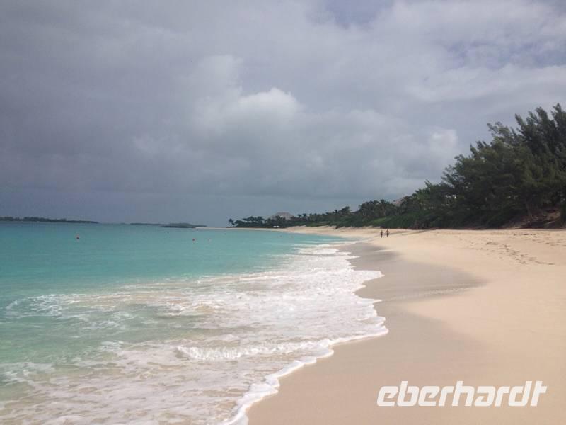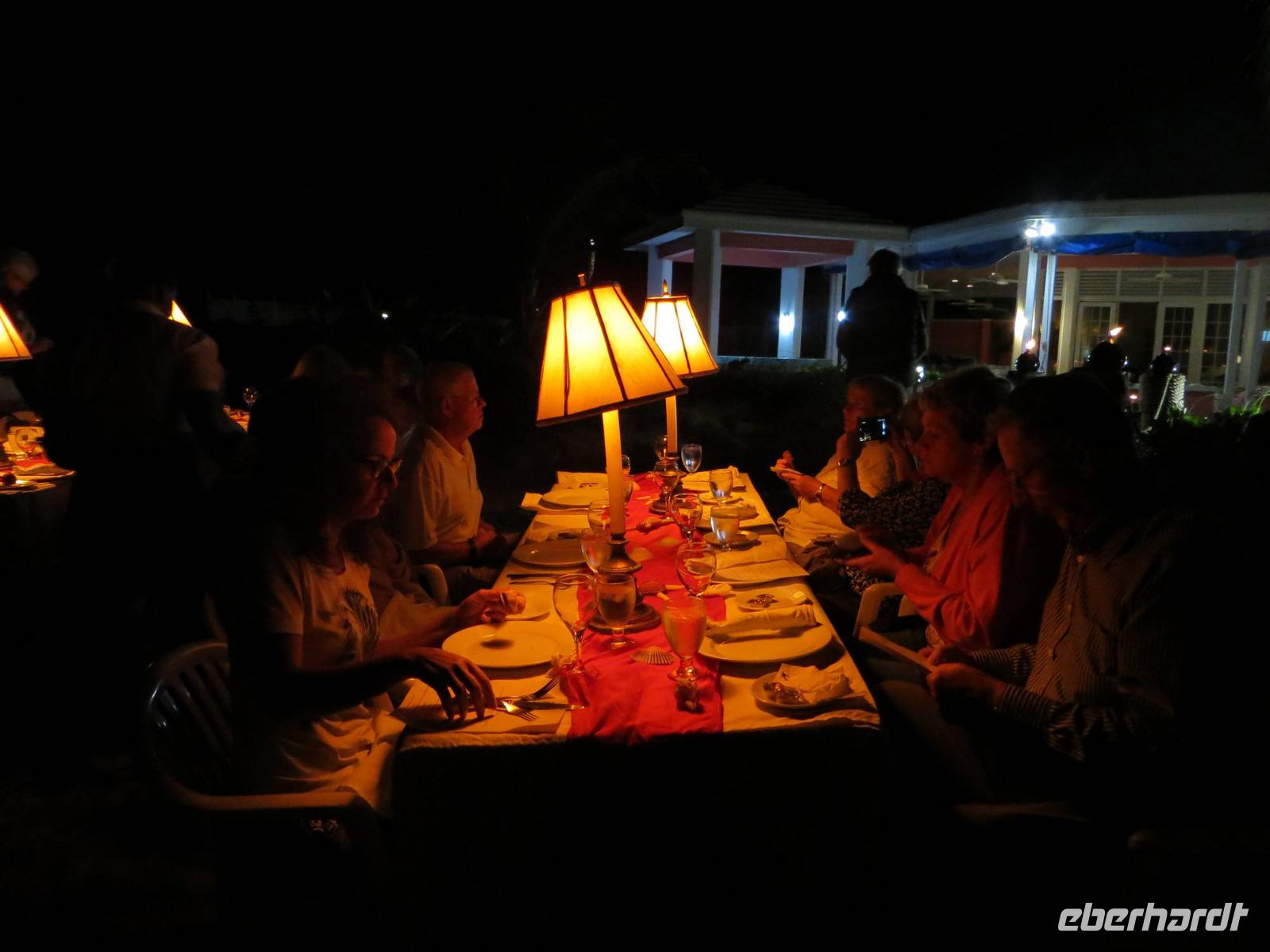 Wir müssen uns zwischen frischen Lobster und zarten Fillet Migon entscheiden, kosten kleine Küchlein aus Krabben und Schnecken und ein traditionelles bahamisches Dessert. Leider können wir unsere exklusiven Plätze im Sand nur bis nach der Vorspeise genießen. Dann setzt der angekündigte Regen ein und wir nehmen im Restaurant Platz.