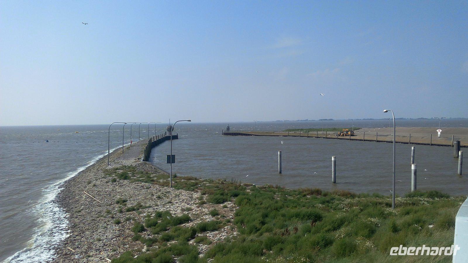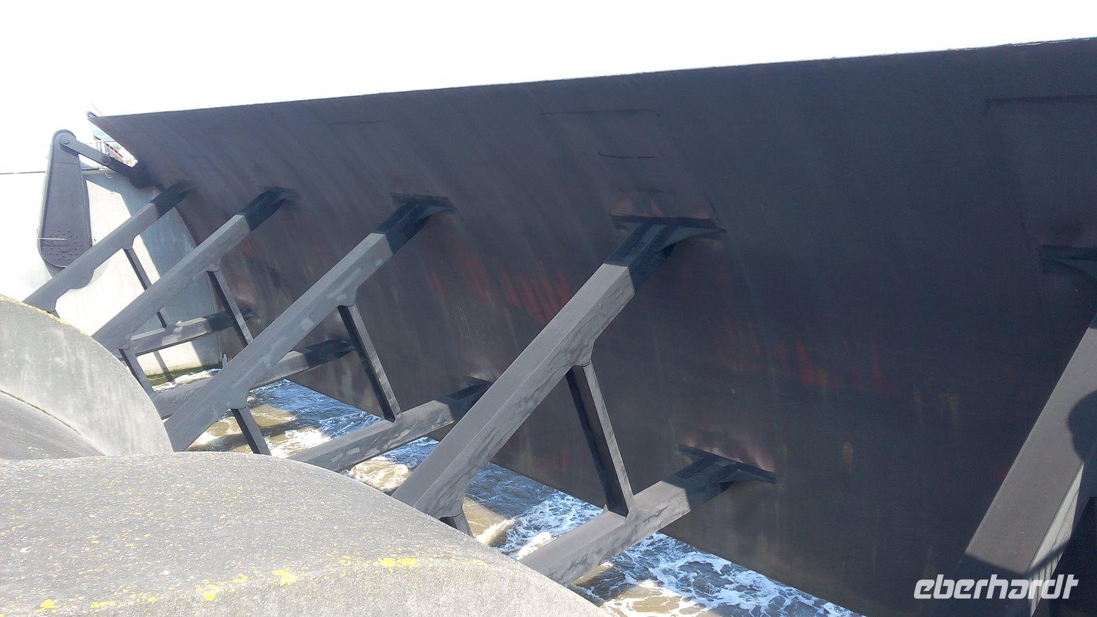 Wir planen hier unsere Mittagspause und jeder nutzt die Zeit nach seinen Wünschen. Zum Essen bei Gosch oder man probiert einfach nur ein Fischbrötchen. Andere suchen den Strand auf und hätten sich etwas mehr Zeit gewünscht. Im Anschluss fahren wir zum Eidersperrwer. Gegen 14.00 Uhr erreichen wir dann das Sperrwerk. Dieses trennt seit 1973 die Eidermündung von der offenen Nordsee. Wir sehen die Fünf 40 breiten Stömungstore, die bei günstigem Wetter offen sind (so wie heute) und bei Sturmflut geschlossen werden. Beeindruckt von dem größten deutschen Küstenschutzbauwerk setzten wir unsere Fahrt fort.