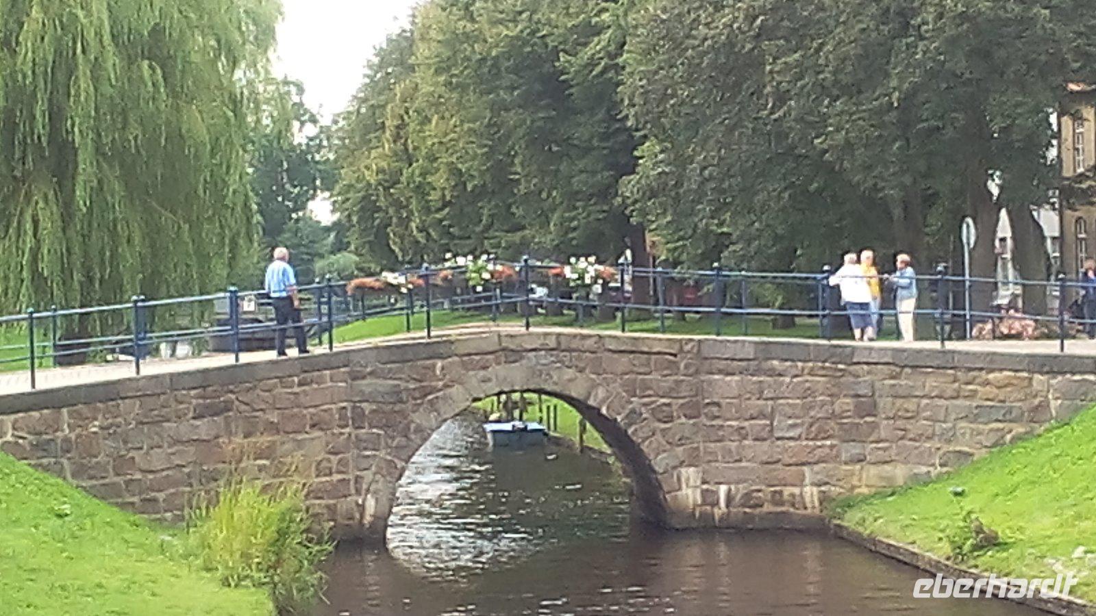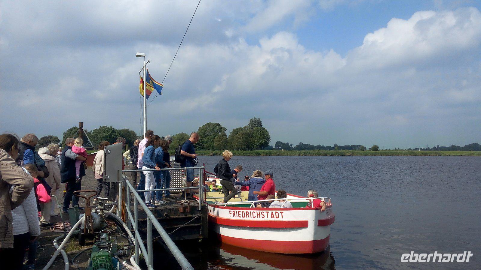 Frau Erichsen überrascht uns mit dem Vorschlag Friedrichstadt zu besuchen und erfüllt damit vielen von uns einen lang gehegten Wunsch. Wir fahren durch Tönning zu dem nur 13 km von Husum entfernten Fiedrichstadt. Frau Erichsen informiert uns, dass 1621 von Herzog Friedrich III. von Schleswig-Gottorf das Städtchen für Glaubensflüchtlinge aus den Niederlanden gegründet wurde. Bei einer Grachtenfahrt erfahren wir noch viel Wissenswertes