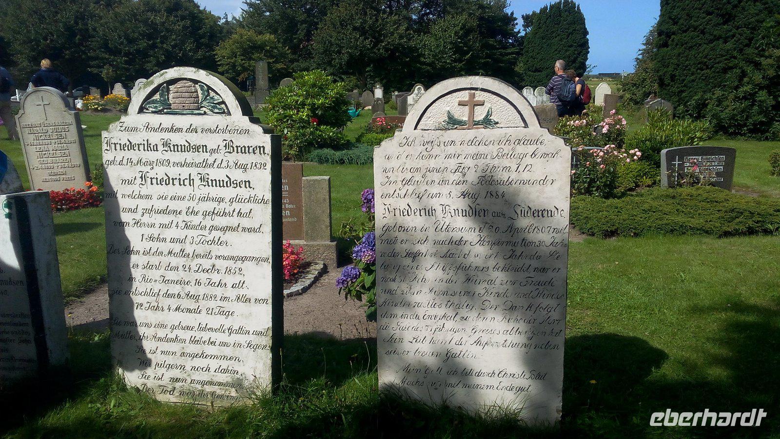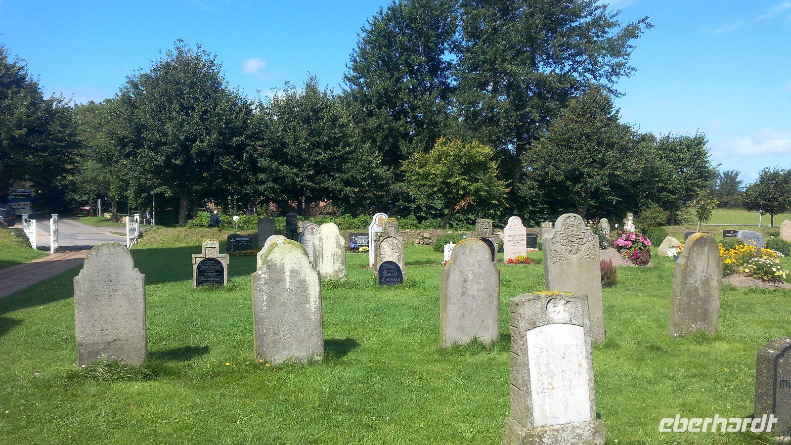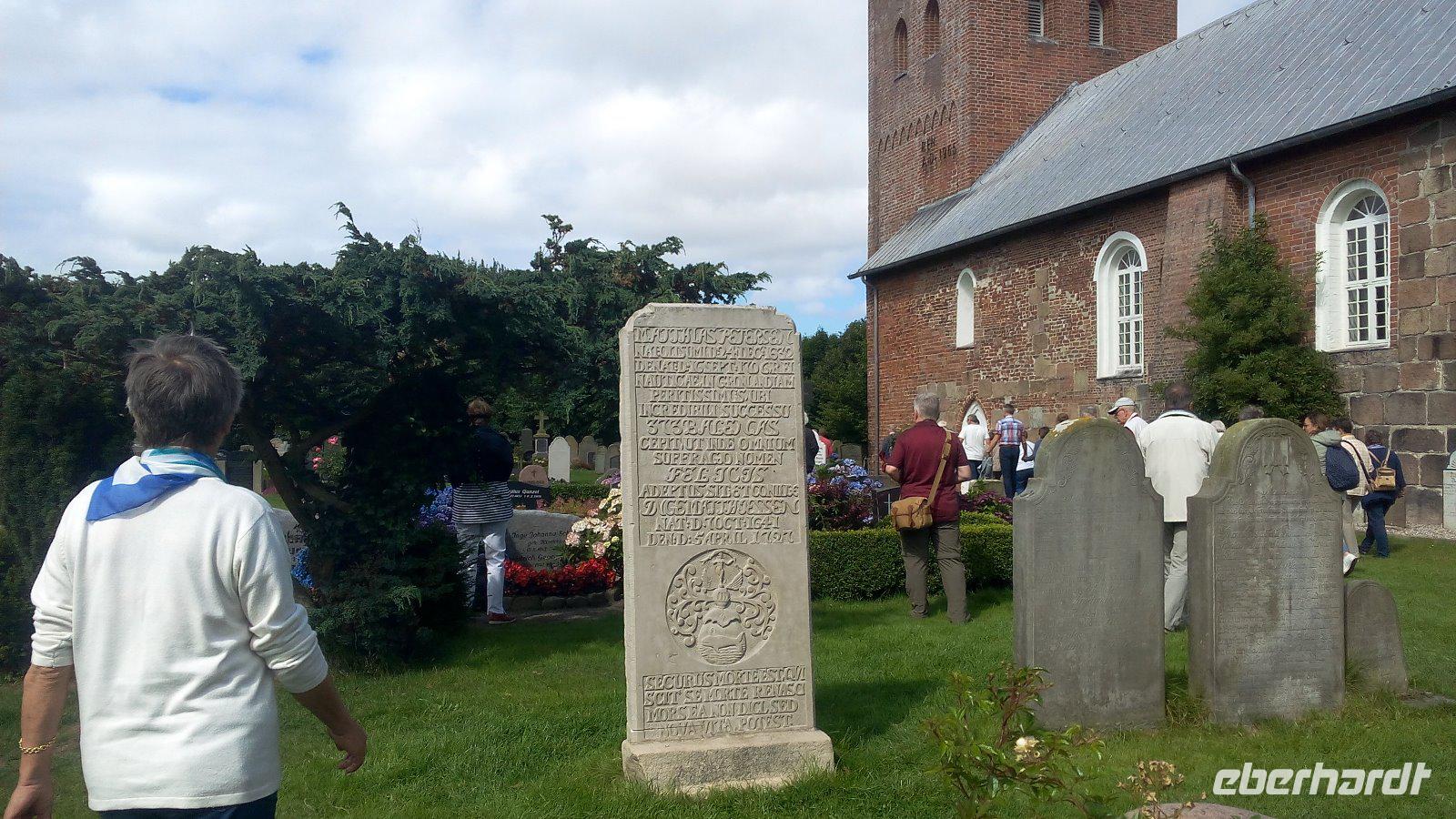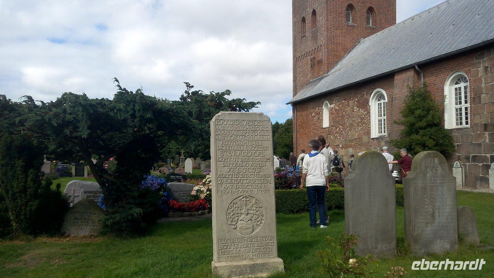 Eine weitere Insel steht auf dem Programm. Föhr, die Insel, die auch die Friesische Karibik genannt wird. Wir fahren mit dem Bus nach Dagebüll zur Fähre der WYKER-Dampfschiffs-Rederei (W.D.R.). Auf Föhr, in Wyk, angekommen wartet schon ein Chauffeur auf uns, mit dem wir eine Inselrundfahrt unternehmen werden. Sehr informativ zeigt er uns die kleinen Orte und auch das Wattenmeer. Dabei können wir Wattwanderer beobachten, die von Inseln zu Insel wandern. Für die Ev. - luth. Kirchengemeinde St. Laurentii in Süderende mit den redenden Grabsteinen lassen wir uns etwas mehr Zeit. Auf den Grabsteinen wurde nicht nur der Name, der Geburts-und Sterbetag genannt, sondern die auch das Leben von Kapitänen auf den Walfangschiffen. Viel erfahren wir auch über Matthias Peterssen, ein nordfriesischer Kapitän und Walfischfänger mit dem Beinamen„Glücklicher Matthias" trug und vor dessen Grab wir auch stehen.