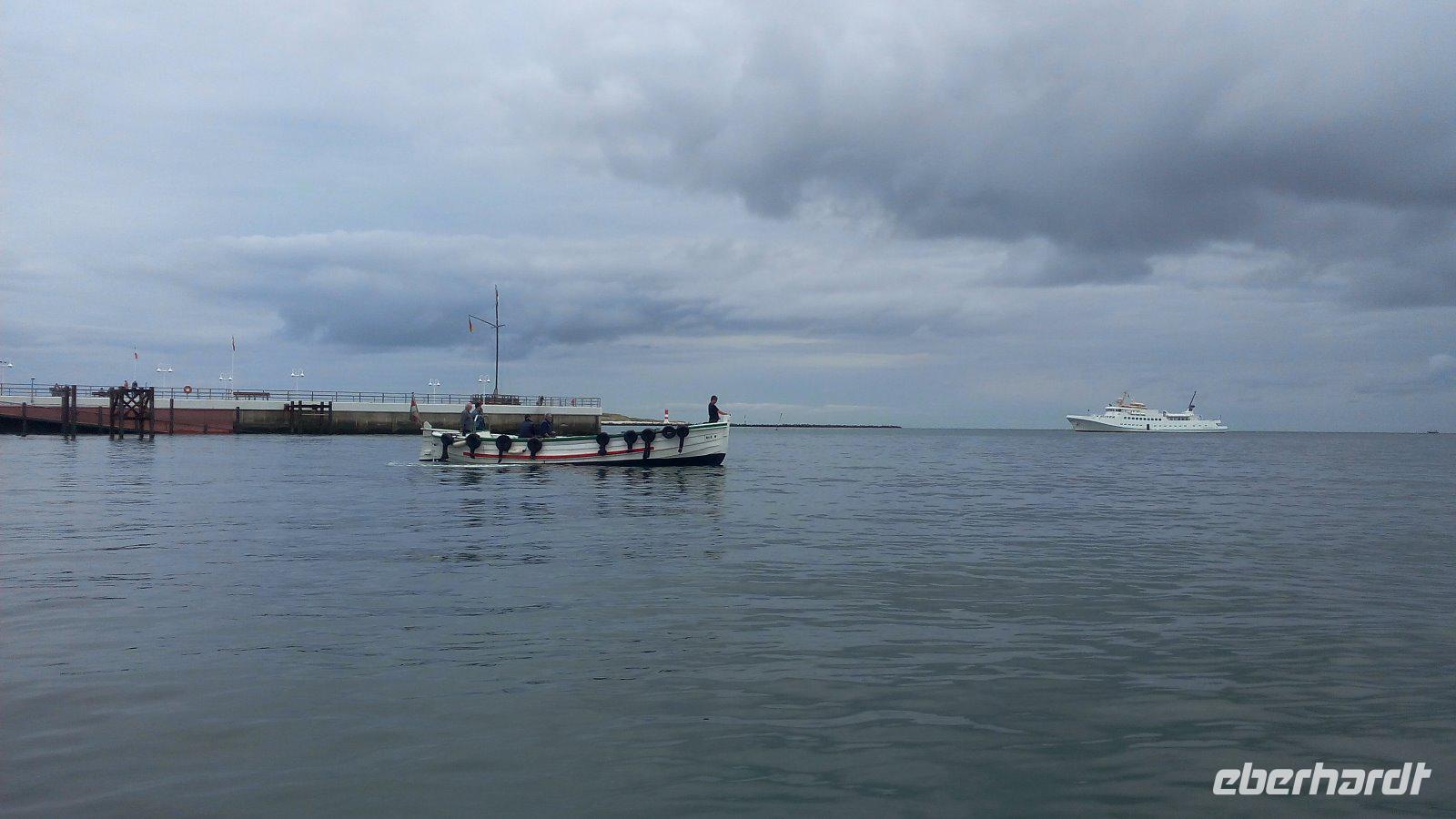 09.15 Uhr geht es mit der „Lady von Büsum" nach Helgoland. Im Oberdeck sind für uns Plätze reserviert und mit "Eberhardt-Travel" gekennzeichnet. Rund drei Stunden fahren wir die rund 50 km bis zum Roten Fels in der Brandung - Deutschlands einziger Hochseeinsel. Einigen Gästen ist es ein wenig "mulmig" zumute. Vor der Insel werden wir ausbooten, (eine Touristenattraktion). Dabei wissen wir doch, dass wir uns nur in die Arme der starken Matrosen fallen lassen müssen. Also, es kann kein Problem sein. So kommt es auch. Von weitem haben wir schon einen Blick auf die Insel und die Düne, als die Börteboote auf unsere "Lady" zu kommen. Schnell und unkompliziert geht das Ausbooten vonstatten.