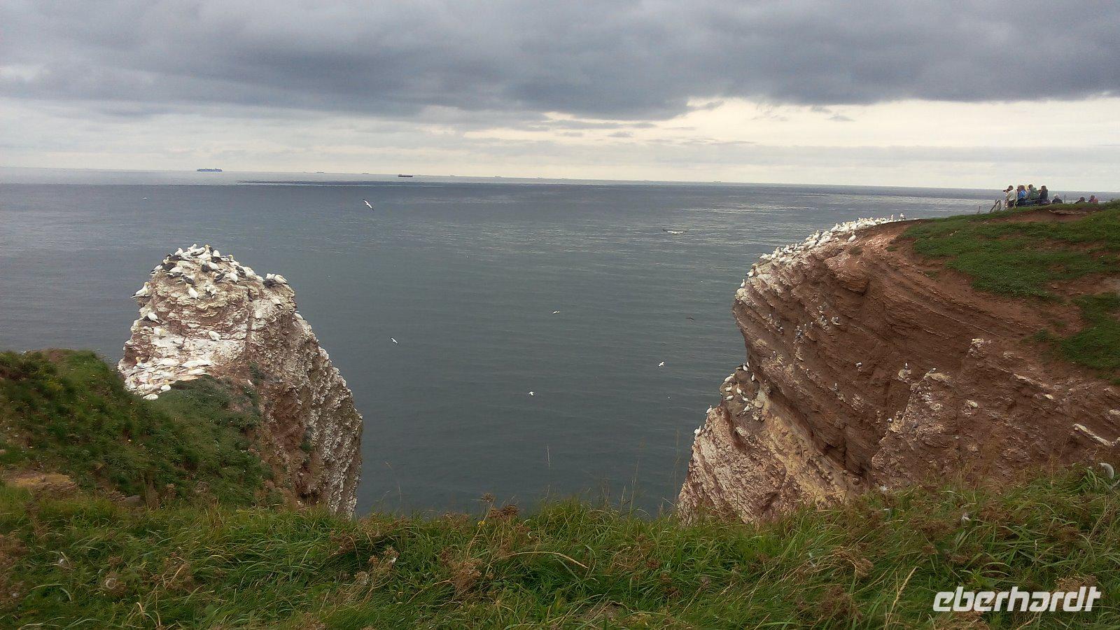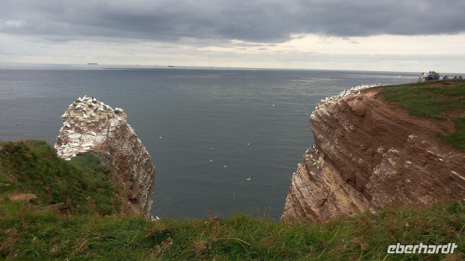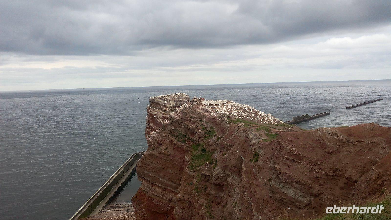 Nun sind es nur einige Meter, um zur Insel zu kommen. Von der Unterstadt kommen wir mit einem Fahrstuhl oder auch entlang der Treppen zum Oberland. Eines der interessanten Wege ist der Klippen-Randweg. Auf dem gelangen wir zu dem bekannten Lummenfelsen, in dem die selten gewordenen pinguinähnlichen Seevögel nisten. Im Juni kann man den Lummensprung in den Abendstunden beobachten, wenn sich die Jungen von den Klippen in die Tiefe stürzen. Da wir aber im August hier sind, können wir die vielen Basstölpel beobachten. Einige Meter weiter kommen wir zur "Langen Anna",die eine mächtige von der naturgeschaffenen Steinsäule und eines der Wahrzeichen von Helgoland ist.