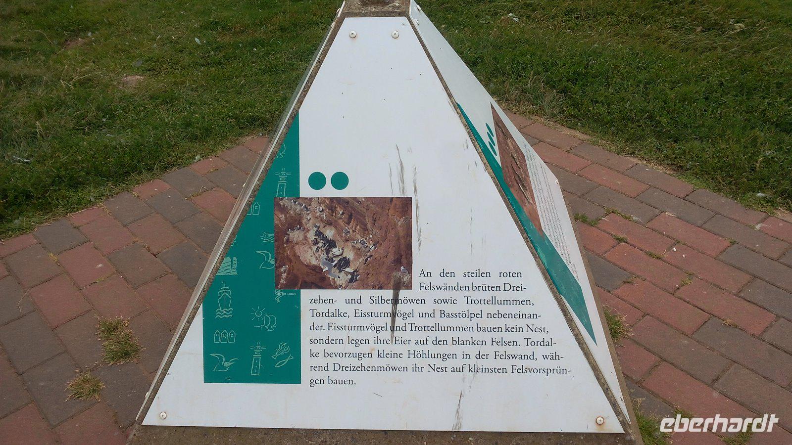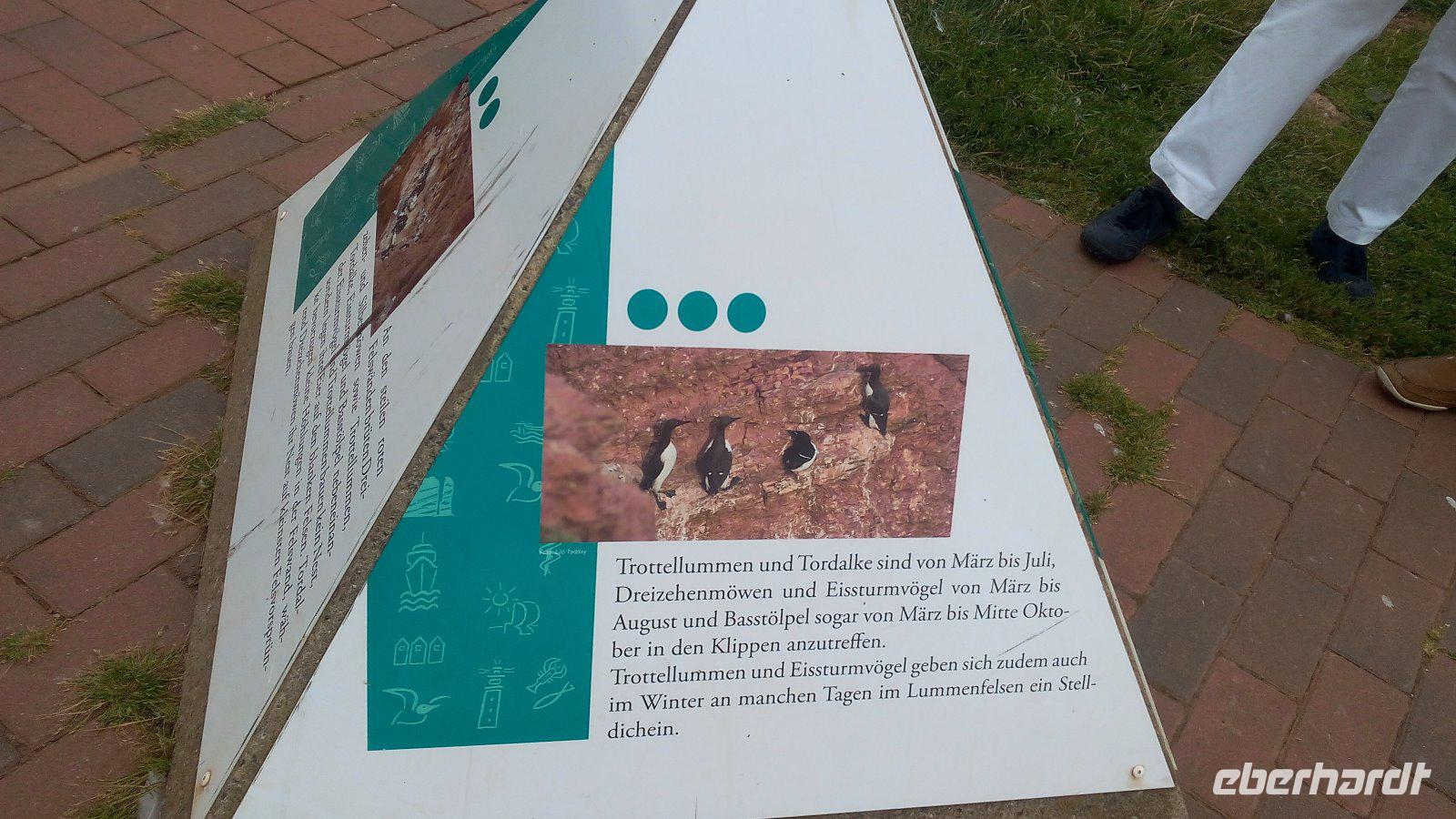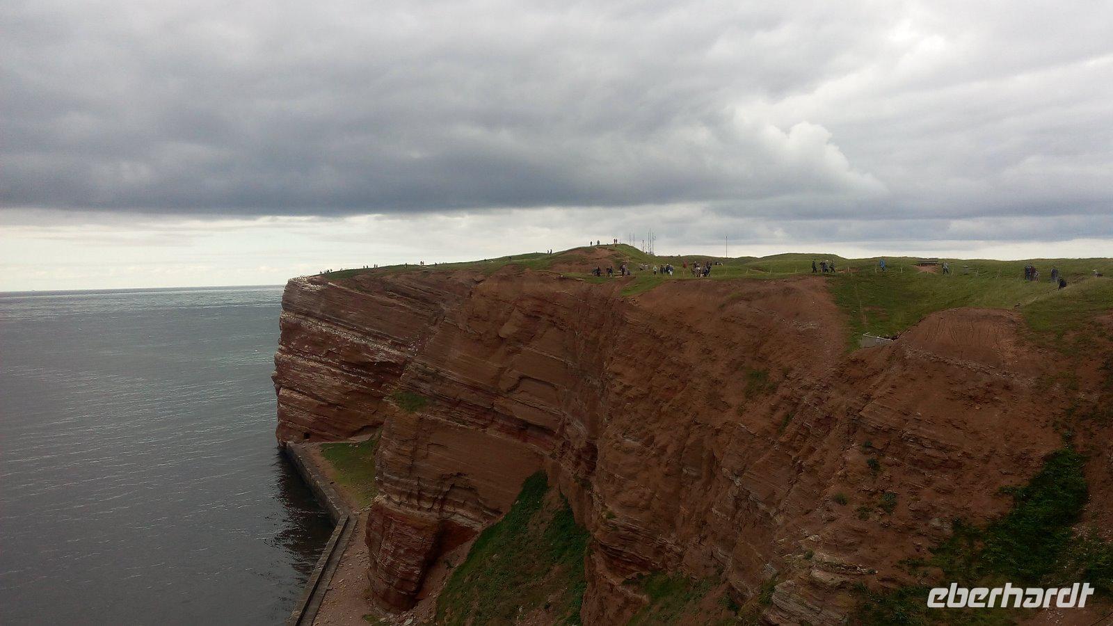 Nun sind es nur einige Meter, um zur Insel zu kommen. Von der Unterstadt kommen wir mit einem Fahrstuhl oder auch entlang der Treppen zum Oberland. Eines der interessanten Wege ist der Klippen-Randweg. Auf dem gelangen wir zu dem bekannten Lummenfelsen, in dem die selten gewordenen pinguinähnlichen Seevögel nisten. Im Juni kann man den Lummensprung in den Abendstunden beobachten, wenn sich die Jungen von den Klippen in die Tiefe stürzen. Da wir aber im August hier sind, können wir die vielen Basstölpel beobachten. Einige Meter weiter kommen wir zur "Langen Anna",die eine mächtige von der naturgeschaffenen Steinsäule und eines der Wahrzeichen von Helgoland ist.