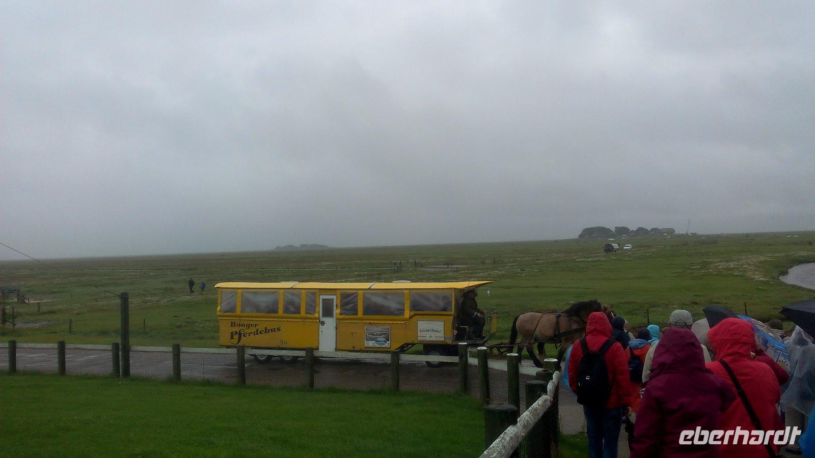 Unser letzter Urlaubstag bricht an. Es ist nicht kalt, aber heute erleben wir Nebel und Regen. Wir fahren heute wieder nach Nordstrand zum Hafen Strucklahnungshörn. Bei Regen erreichen wir mit dem Adler-Express die Halligen Hooge, die Königin der Halligen. Die gelbe Kutsche steht schon bereit und wir fahren zur Hanswarft zuerst sehen wir im Sturmflutkino das Leben auf der Halligen, wenn die Flut kommt. Danach gehen wir in die Prachtstube der Warft, dem Königspesel. Räume voller Zeugnisse der Vergangenheit. Der Regen bricht nicht ab. Wir fahren weiter mit unserer Kutsche zur Kirchenwarft und später noch zum Friesenpesel. Hier genießen wir ein gutes Mittagessen. Ziemlich durchnässt erreichen wir mit der Fähre wieder Strucklahnungshörn. Auf der Fahrt nach Husum und zum Abschluss der Reise sind wir von Eberhardt-Travel zu einem Pharisäer eingeladen. Es ist wohl das bekannteste Getränk des Nordens, das gerade an kalten Tagen für wohlige Wärme sorgt. Im Pharisäerhof wurde er erfunden. Damit runden wir den Abschluss unserer Reise ab.
