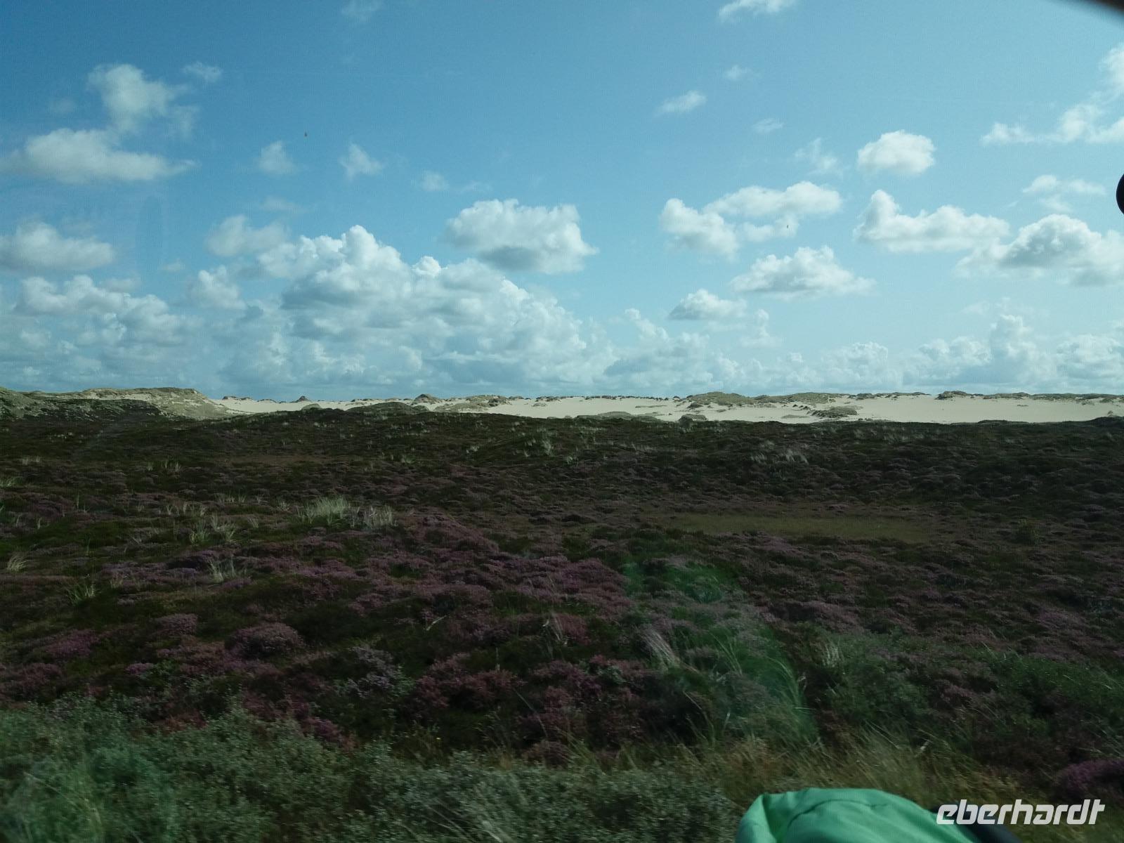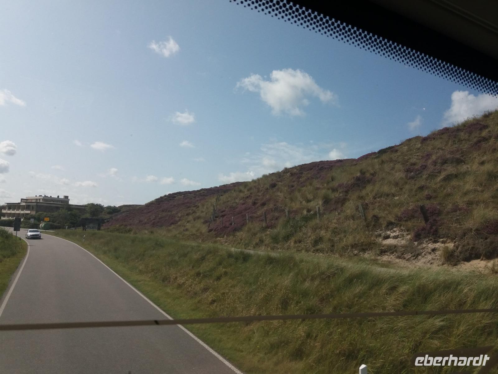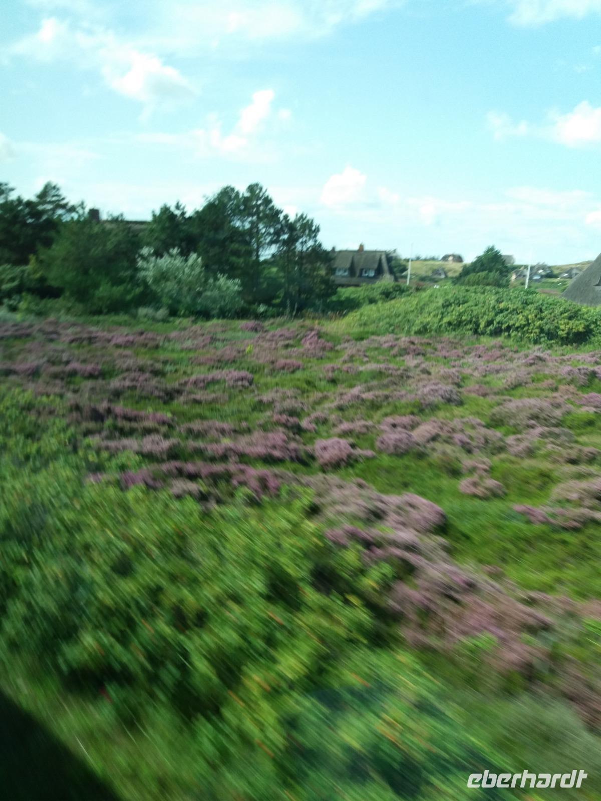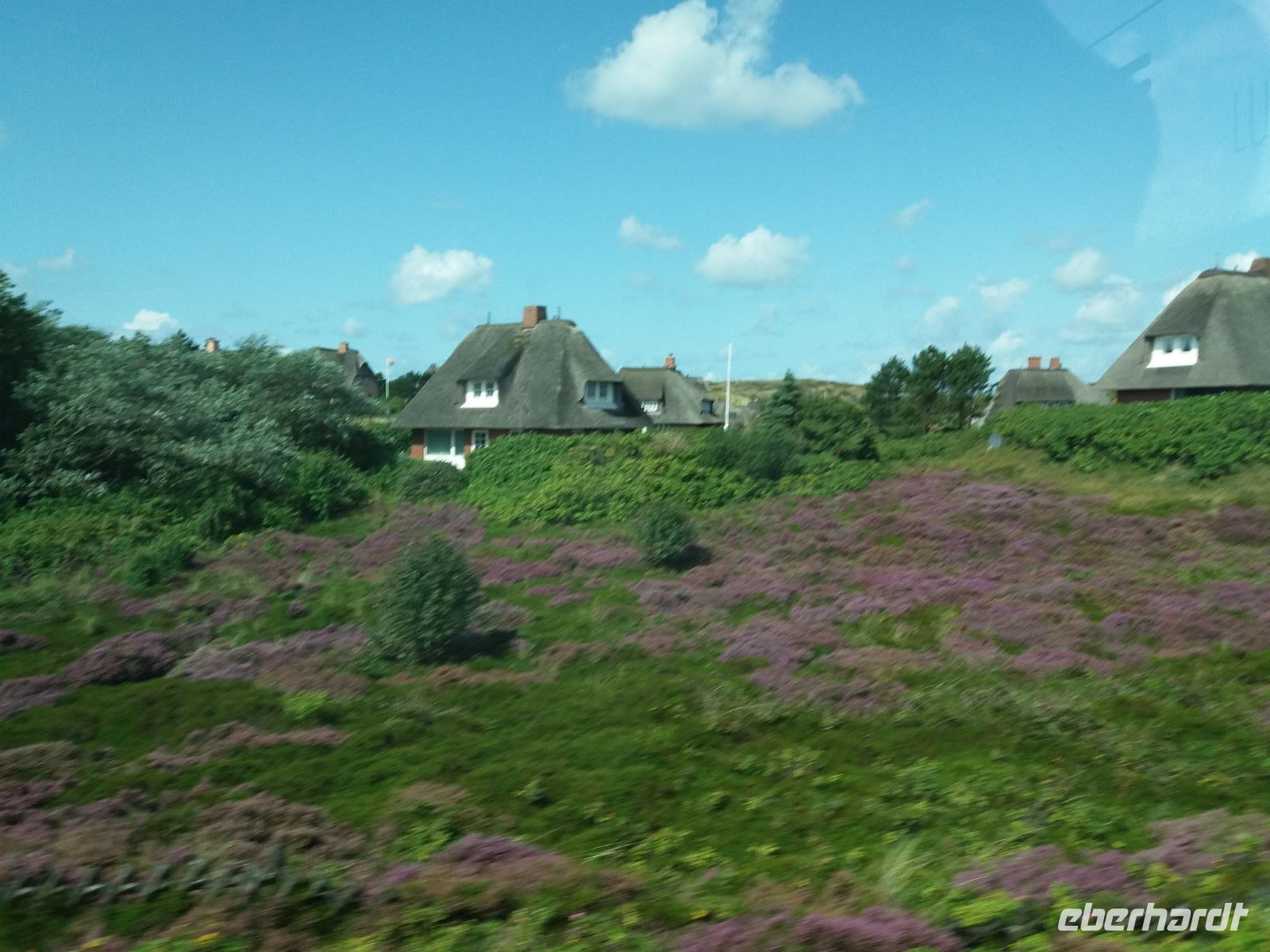 Die Jugendherberge „Krähenheide" heißt natürlich so, weil sie in den Heidewiesen liegt und im September wie in einem Farbenmeer liegt.Der überall zu sehende Strandhafer hat bis zu 10m lange Wurzeln und hält natürlich den Sylter-Sand fest, damit das Meer nicht zu viel Land abträgt.Wir fahren durch Kampen. Nobelort mit bildschönen reetgedeckten Häusern, deren Eigentümer bebannte Persönlichkeiten sind. Die teuersten Bodenpreise finden wir hier. Zwischen 35 und 37 T€ muss man schon für nur 1m² bezahlen.