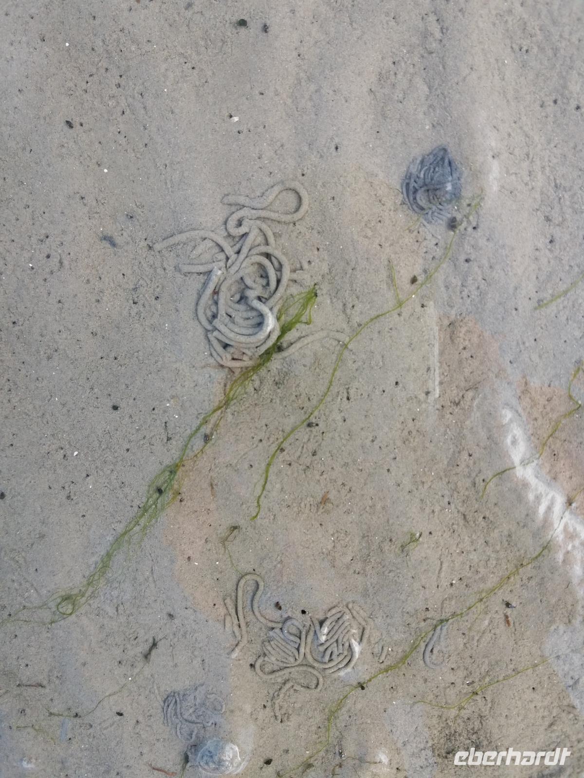 Man sieht sie oft erst auf den zweiten Blick. Die Wattwürmer produzieren diese unverkennbaren Haufen, Krebse schleichen seitwärts vorbei, die Wattschnecken hört man überall „knistern".