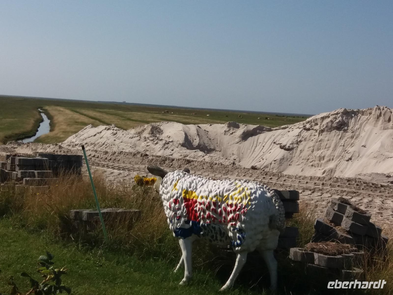 Nach über 1 ½ Std. spülten wir uns die Füße ab und fuhren in Richtung Eidersperrwerk weiter.Vorbei an den weiten Grasflächen der Insel, sind überall weidende Schafe zu sehen. Auch die Engelmühle, die noch funktionstüchtig ist, kamen wir vorbei. Heute wird diese nur noch für Trauungen und als Cafe genutzt.Am Eidersperrwerk angekommen, welches das größtes Küstenschutzbauwerk seit 1973 ist, bestauntes wir diese gigantische Technik.