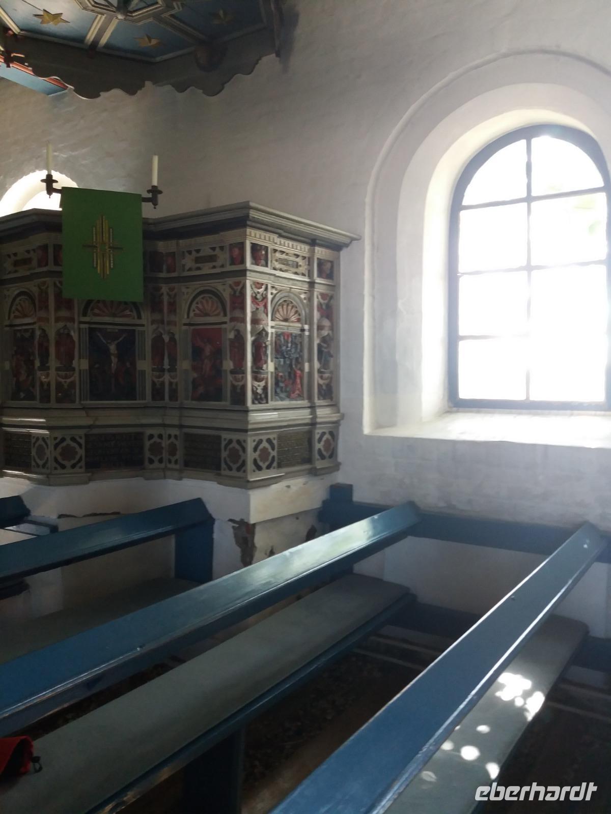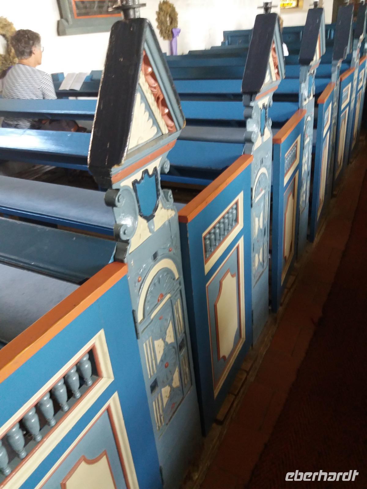 In einem Kurzfilm sahen wir, wie der Sturm und das Wasser von der Insel besitz ergreifen. Das Meer steigt mehrere Meter an. Alle Straßen verschwinden. Nur die Häuser, die auf Hügeln liegen bleiben im Trocknen stehen. Immer eine Herausforderung von Mensch und Tier, denn auch diese müssen in Sicherheit gebracht werden. Abgeschnitten von jeglicher Verbindung zum Festland, meistern die Insulaner das Leben hier auf einer Warft. Sie leben ihr Land.Die kleine Inselkirche sahen wir uns zum Schluss an. Die Fotos werden Ihnen zeigen, wie eine alte friesische Kirche von innen aussieht.