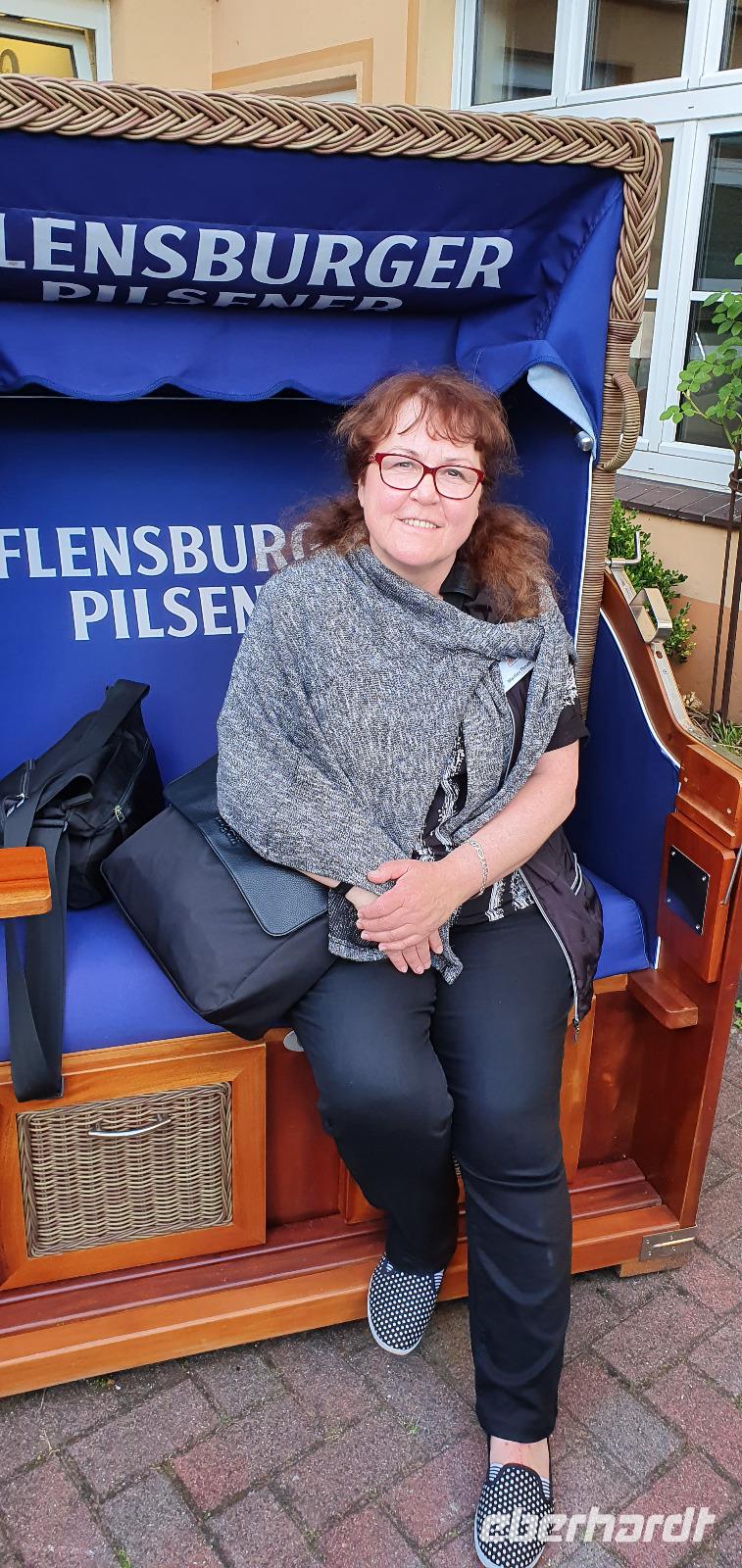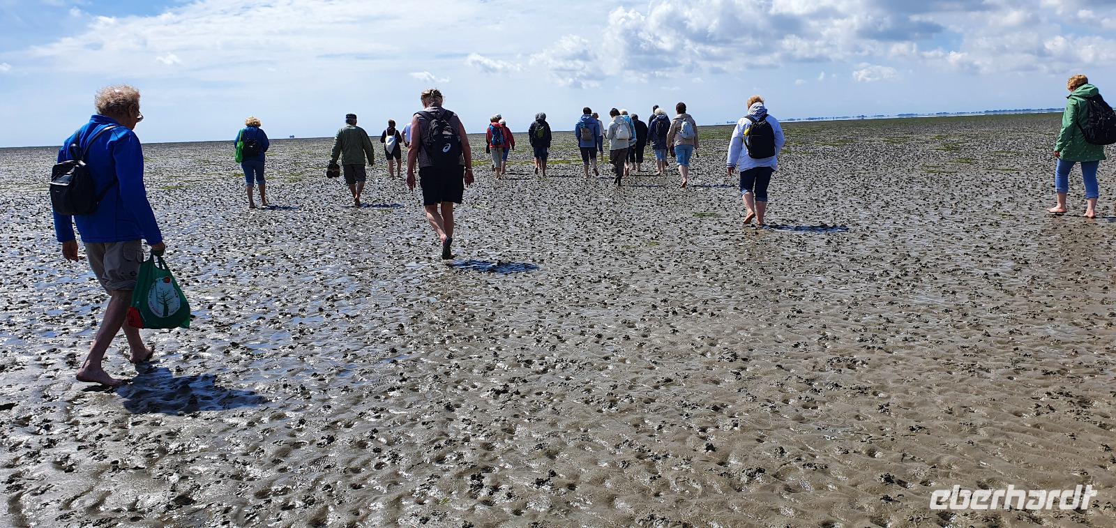 durchführen. Wir fahren durch Husum nach Nordstrand. Der Damm hier wurde 1935 erbaut. Auf ihm fahren wir entlang- Jan gewohnt sicher- und gekonnt lenkte er auf kleinstem Raum um damit er einparken konnte. Dann hieß es: Füße frei. Barfuss wanderten wir ins Watt. Das Gefühl, auf Meeresboden zu laufen ist unbeschreiblich und Hilke zeigte uns immer wieder, wieviel Leben im Watt steckt. Da sind die Wattwürmer, die den Sand quasi filtern und dann als dünne Spaghetti wieder ausscheiden, die Schnecken, die man nur an den Löchern im Sand erkennt. Erst wenn alles ruhig ist ringsum zeigt sich ein kleiner Rüssel zum Luft-Holen. Kleine und größere Krebse sehen wir, Fischlein, Algen und natürlich Quallen. Wir sehen auch die Wattkutscher: Pferdekutschen fahren zur kleinsten Hallig Südfall und zurück, sie dürfen aber maximal 50 Touristen pro Tag befördern. Wir sind absolut begeistert vom Watt und würden am liebsten noch bleiben. Aber auch das schönste Erlebnis endet einmal und wir bemerken bereits, dass das Wasser zurückkommt. Also heißt es Füße abduschen und auch die einen oder anderen Sandspritzer von den Hosen zu bekommen. Vom Damm aus sehen wir nun deutlich die Insel Pellworm. Nun heißt es: Rückfahrt nach Husum. Hier verabschieden wir uns von Hilke für heute. Wir werden mit ihr noch nach Sylt fahren übermorgen. Für heute aber verabschieden wir uns voneinander. Unsere Gruppe trifft sich zum leckeren Abendessen wieder und wir lassen in unseren Gesprächen den Tag Revue passieren.