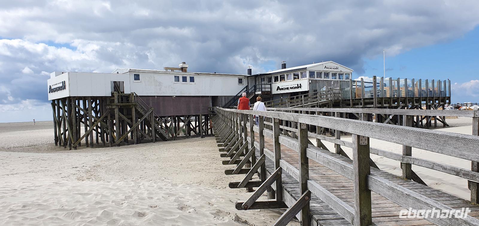 Hilke erzählt uns, dass dieser Ortsname eigentlich ein Sammelbegriff für die Orte hier ist, seit hier in 52 Metern Tiefe eine Schwefelquelle entdekct wurde ist St. Peter Ording das einzige Nordseeheilbad. In St. Peter Bad halten wir und spazieren gemeinsam zur Promenade und zur großen Brücke. Wer wollte entrichtete seinen Obulus und konnte dann bis zum Strand hinunter laufen. Auf der Holzbrücke konnte man bis dahin kommen ohne die natürlich gewachsenen Sandsalzwiesen zu zerstören. Von hier hatte man auch einen tollen Blick auf die Dünen. Sie wurden ab 1864 aufgeforstet um sie zu befestigen. Bis dato hatte der Sand durch Verwehungen immer wieder Ackerboden unbrauchbar gemacht und Hilke meinte, dass der Sand überall war: im Essen, in der Stube, in den Zähnen, einfach überall. Uns konnte das nicht passieren und wir ließen uns einen Mittagimbiss- meist in Form eines leckeren
