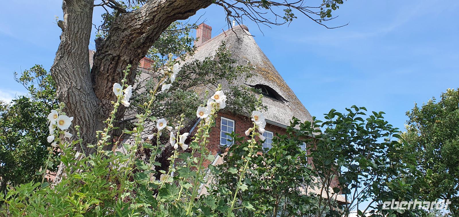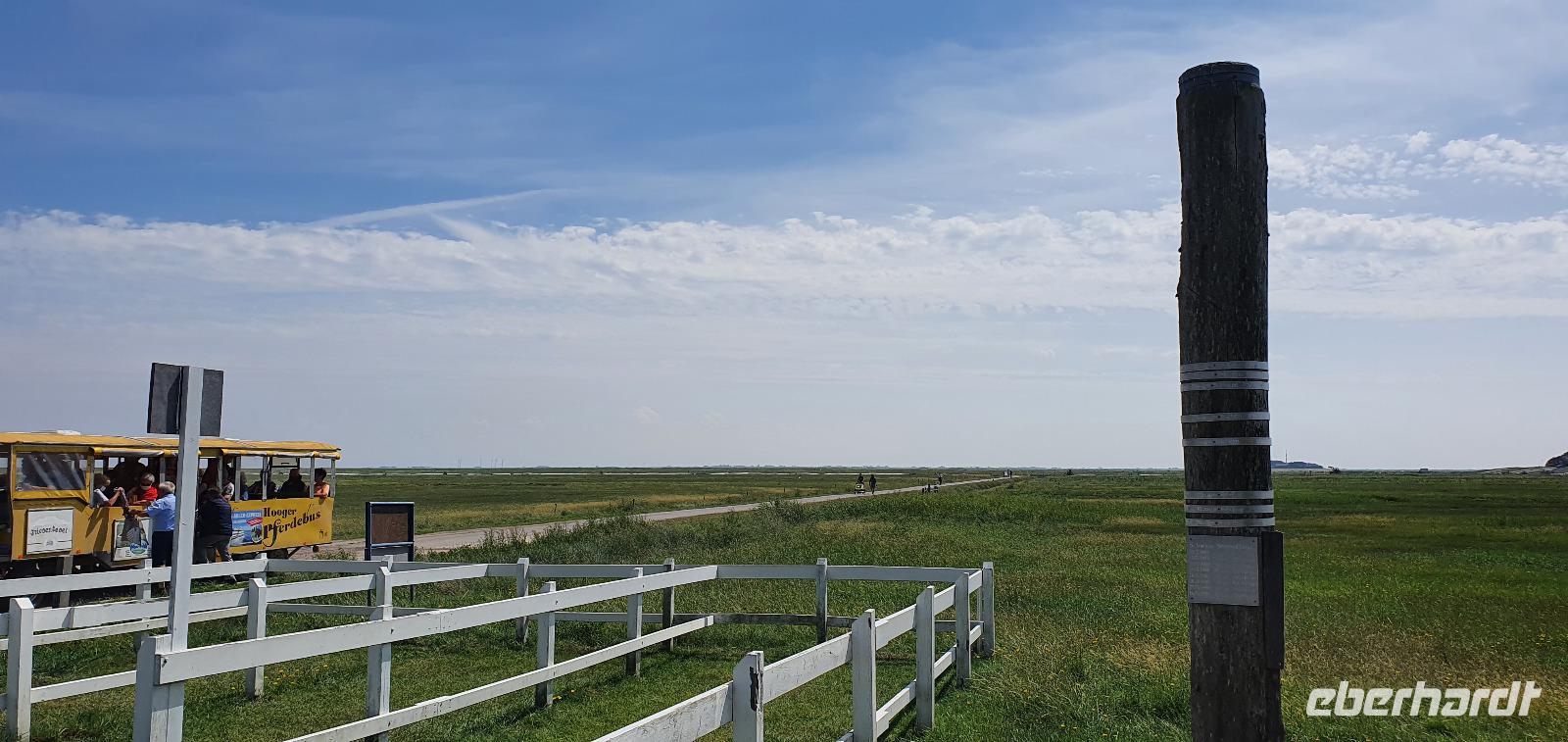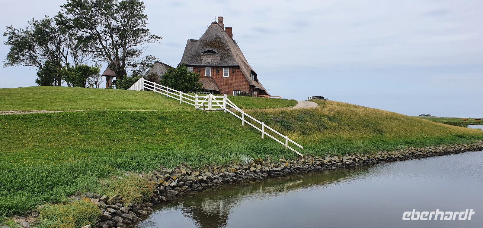 Die Siedlungen und Gebäude stehen auf den Warften, künstlichen Aufschüttungen, um den Fluten standzuhalten. Hooge hat einen Sommerdeich, der 1,20 m hoch ist, trotzdem heißt es bis zu 10 Mal im Herbst und Winter "Land unter". Dann überflutet die Nordsee die Halligen bis zu den Warften. Die meisten von uns entscheiden sich für die Pferdekutsche, um zur