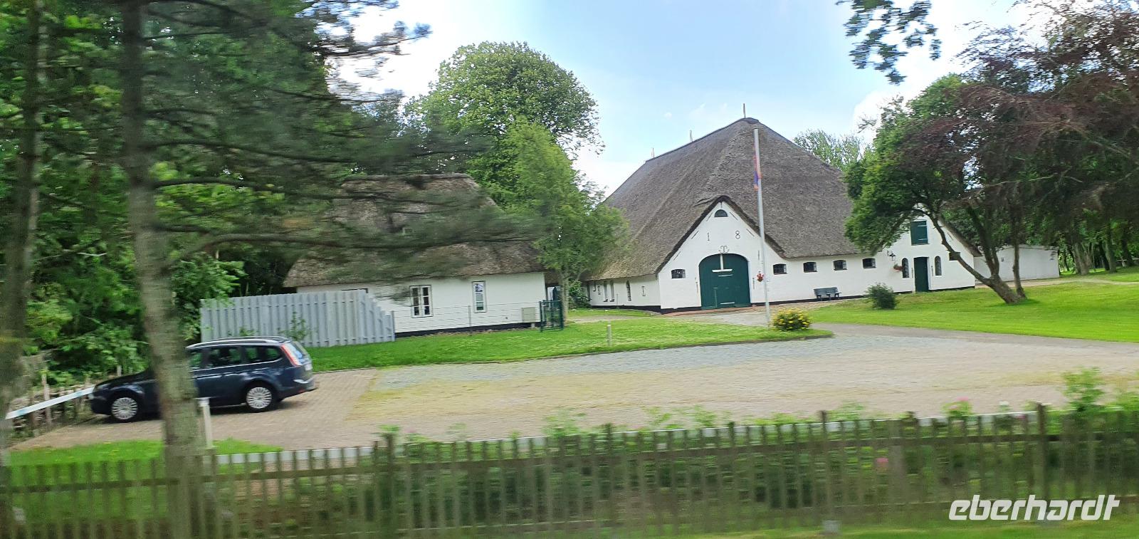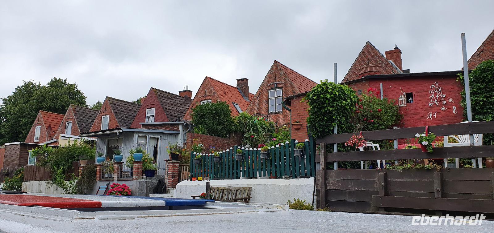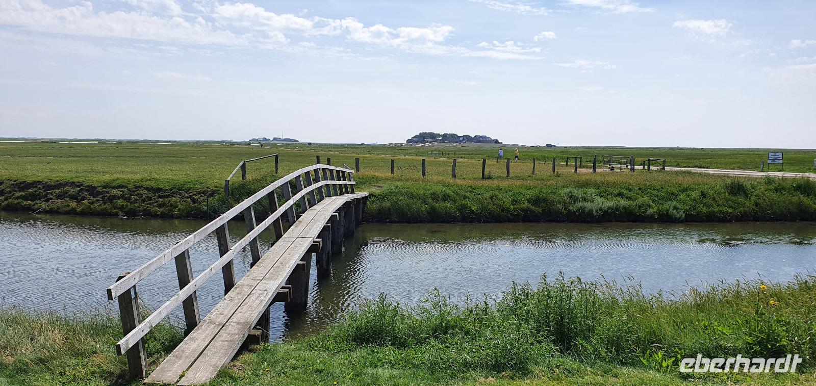 Die Siedlungen und Gebäude stehen auf den Warften, künstlichen Aufschüttungen, um den Fluten standzuhalten. Hooge hat einen Sommerdeich, der 1,20 m hoch ist, trotzdem heißt es bis zu 10 Mal im Herbst und Winter "Land unter". Dann überflutet die Nordsee die Halligen bis zu den Warften. Die meisten von uns entscheiden sich für die Pferdekutsche, um zur