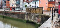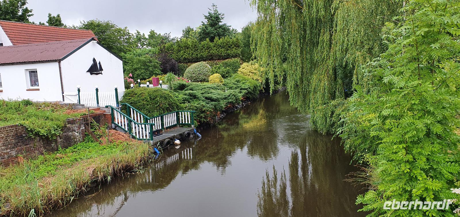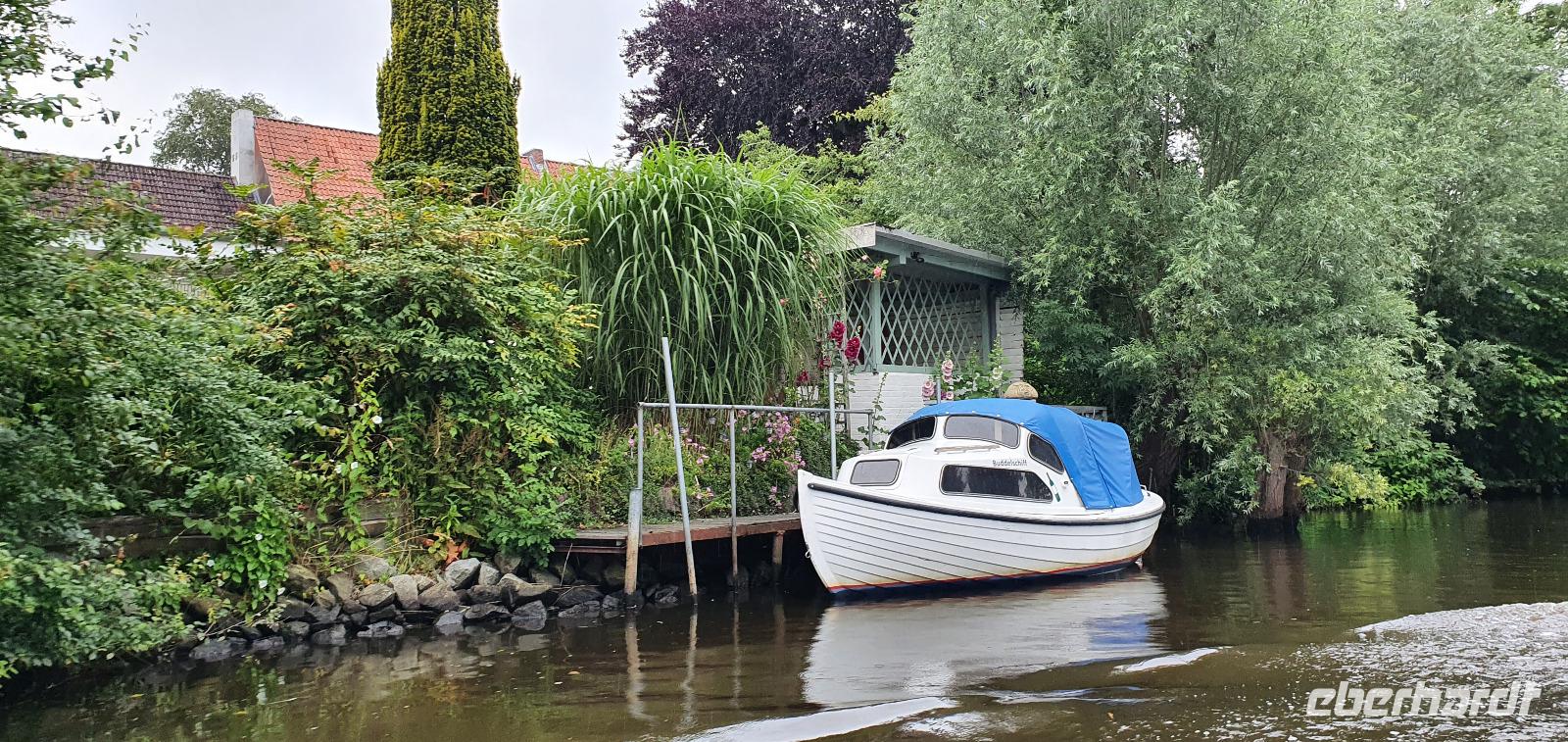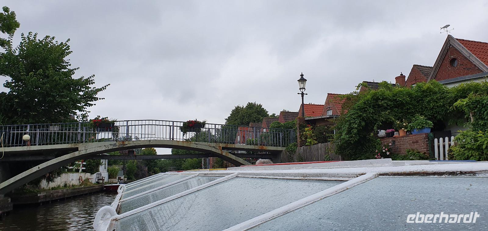 zu einer Grachtenfahrt. Mit der Bahn ging es dann nach Friedrichstadt. Ihren Namen hat sie von Friedrich III. Er überließ hier den "Glaubens-Unerwünschten" Land, auf dem sie ihre Stadt bauen konnten. So lebten hier zeitweise 13 Religionen und Glaubensgemeinschaften zusammen. Heute sind es noch 5. Am Schiffsanleger dann stiegen wir in die "Treeneprinzessin" ein. Es war überdacht, so konnte uns der leichte Regen nichts anhaben. Auf der Treene fuhren wir hinaus zur Eider, beide Flüsse treffen sich hier. Dann retour in die