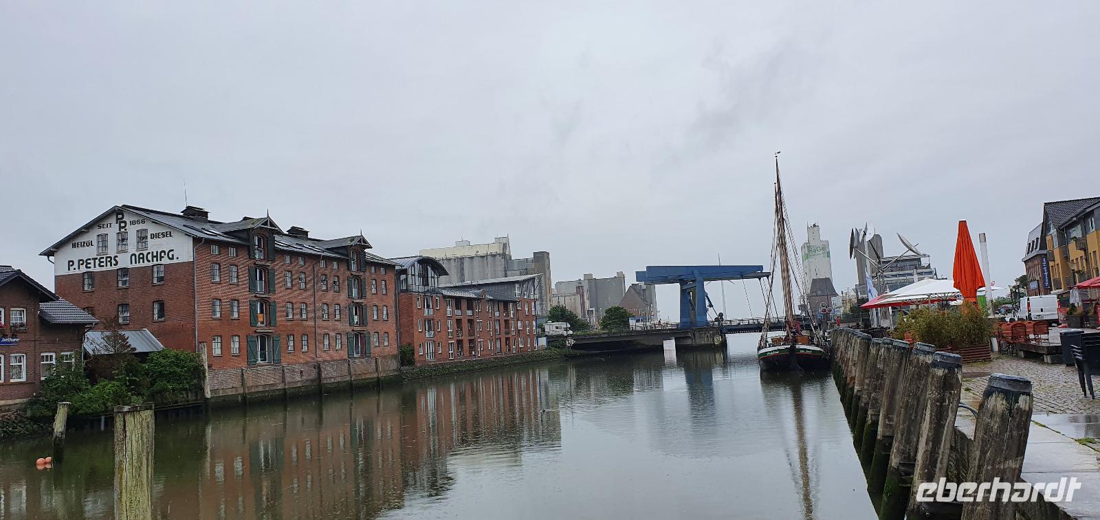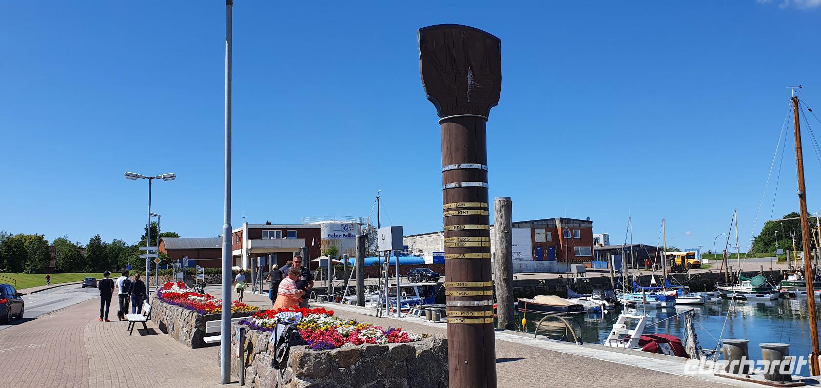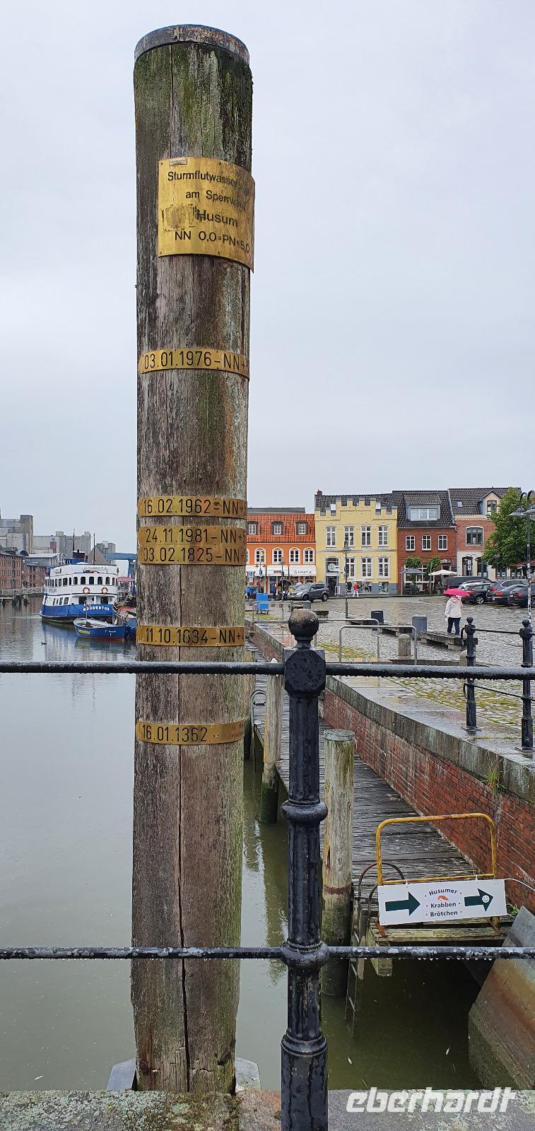 Da ist das neue Rathaus, gleich gegenüber unserem Hotel. Es soll 20 Jahre gedauert haben, bis die Husumer den ungewöhnlichen Neubau akzeptiert haben sollen. Am Binnenhafen natürlich der Flutpfahl. Hier ist angeschlagen, wie hoch die Fluten standen. Dann spazieren wir zum Hafen, den alten Speichern, die heute zu Geschäften, Kulturzentren und Wohnungen umgebaut sind. Ein Besuch des