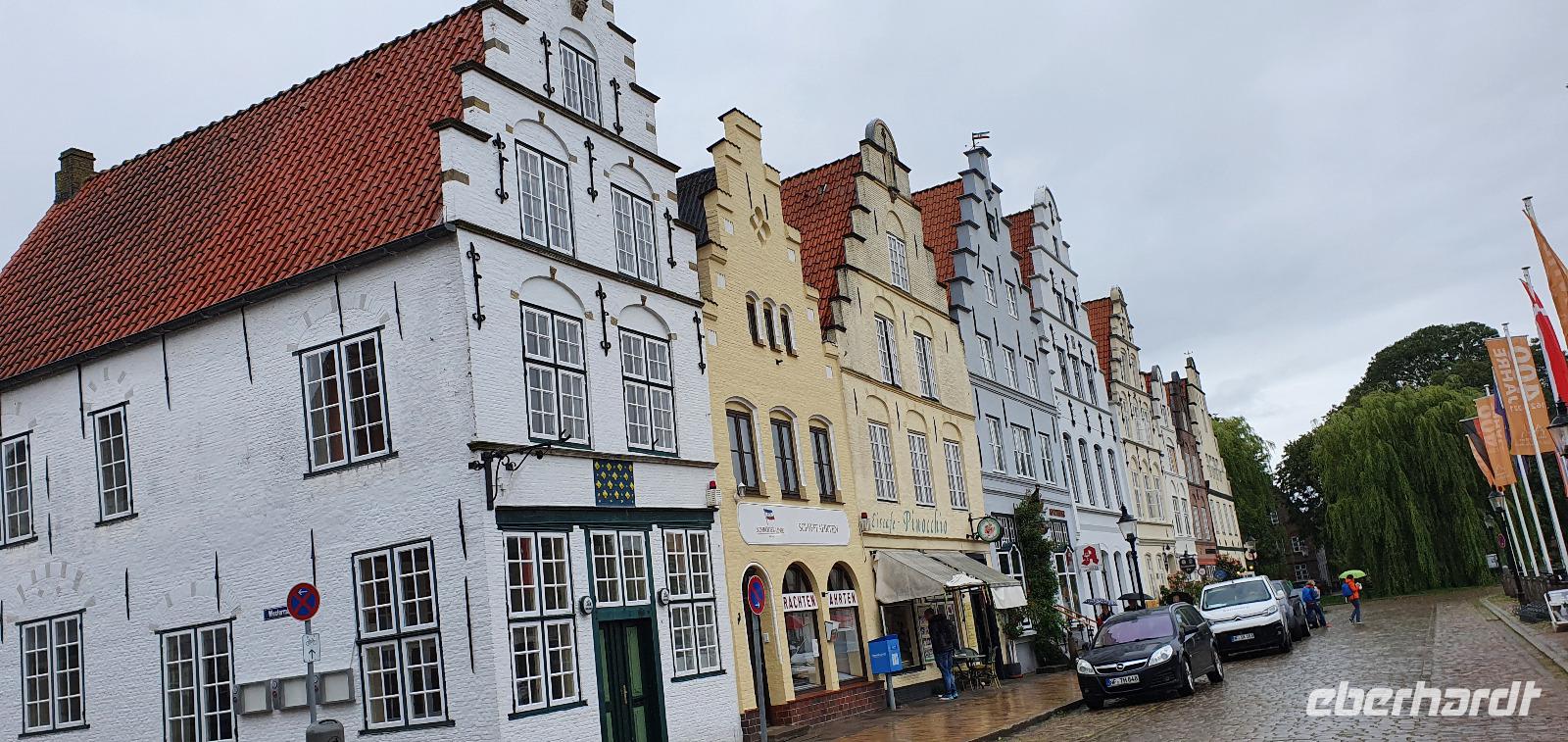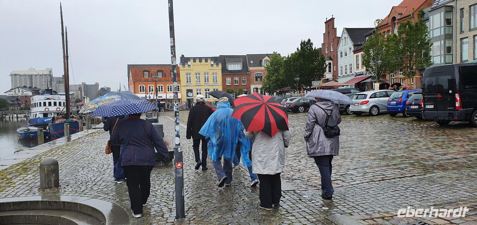 Heute verläßt uns unser Wetter-Glück. Dicke Regenwolken hängen über der Stadt. Und das ausgerechnet heute, wo wir bei einem Stadtrundgang Husum näher kennenlernen wollen. Aber da es ja bekanntlich kein schlechtes Wetter sondern nur unpassende Kleidung gibt starten wir mit Regenkleidung und Schirm. Aufgeteilt in 3 Gruppen erkunden wir nun mir ortskundigen Stadtführern