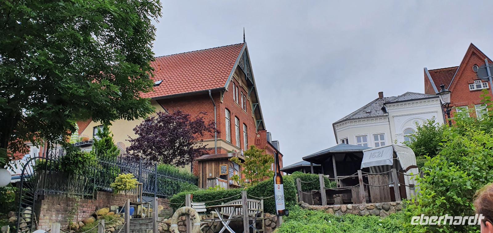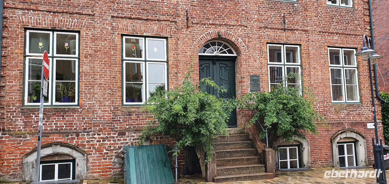 darf selbstverständlich ebensowenig fehlen wie der Garten, der davor angelegt wurde. Storm liebte die Blumen und verabredete sich zu Zeiten "wenn die ... blühen". Auf unserem Spaziergang zum Zentrum sehen wir noch sein Wohn- und Geburtshaus. Es geht durch die "Hohle Gasse" (die wirklich so heißt) und wo früher zum Viehmarkt 2 x im Jahr tausende Rinder zum Hafen getrieben wurden. Das Haus, in dem heute die Tourist Information untergebracht ist, war früher Gästehaus des Schlosses. Wir sehen im Hof den kleinsten Laden, die "Schlossluke" und liebevoll restaurierte Ateliers. Auf dem Markt dann der Tine- Brunnen, offiziell das Asmussen-Woldsen-Denkmal. Dann besuchen wir die