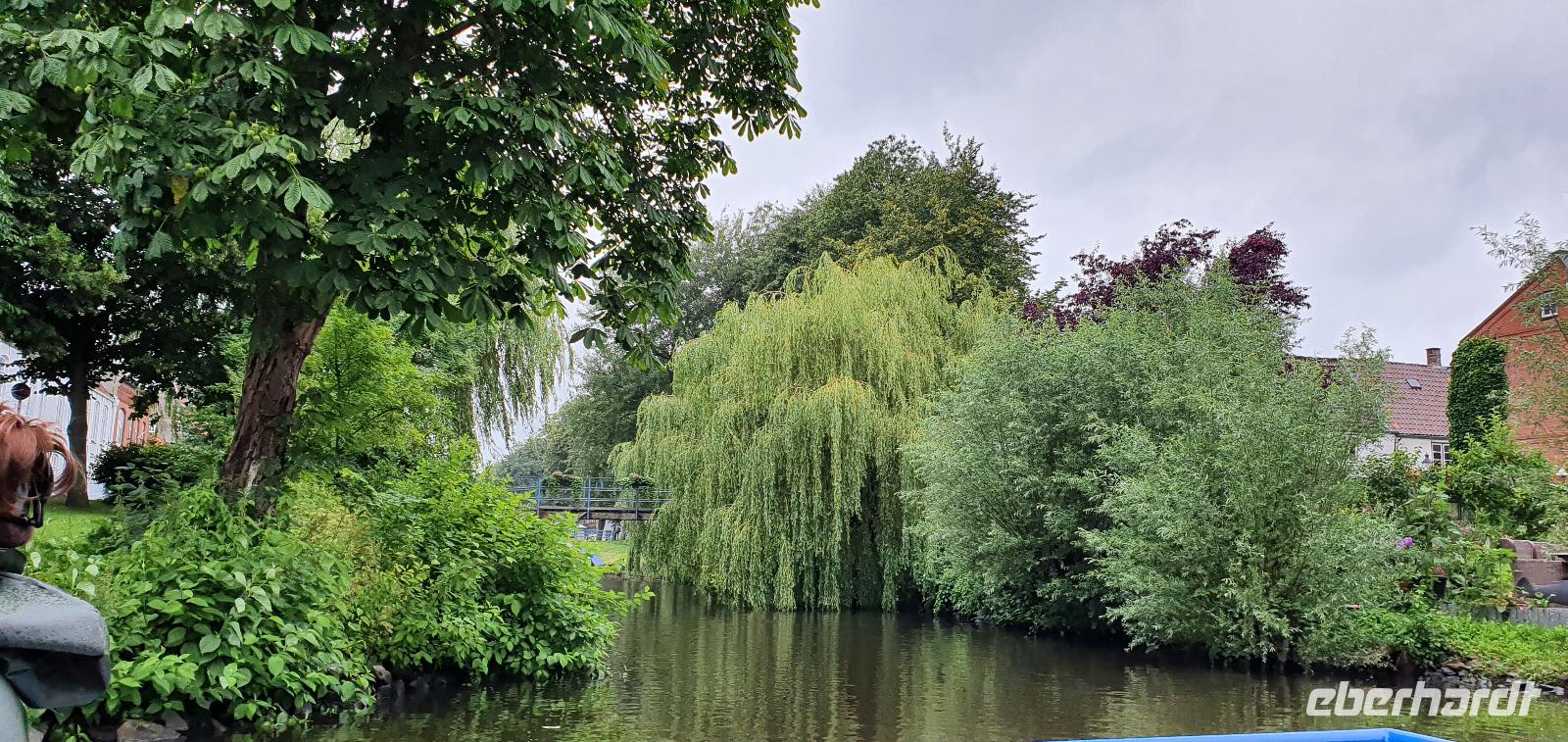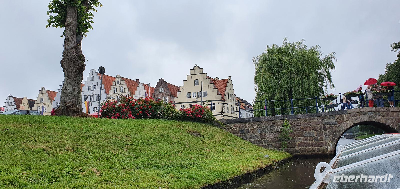 wie sie genannt wird. Auch Amsterdam des Nordens. Die Fahrt durch die Grachten ist wunderschön und unser Schiffsführer unterhält uns mit Anekdoten und Wissenswertem. Da sind die 16 Häuser: weil die Grundsteuer so hoch war sind sie äußerst schmal, aber hoch gebaut. Die Familien hier hatten 6 bis 12 Kinder und die Hebamme wohnte auf der anderen Seite des Treene-Armes. Als sie es wieder einmal nicht zur Geburt schaffte wurde für sie eine Brücke gebaut-die Hebammenbrücke. Und so sehen wir viele geschichtsträchtige Häuser, ehemalige Kirchen, oppulente Neubauten genauso wie farbenfrohe Gärten und Bootsanleger. Viel zu schnell ist unsere Fahrt zu Ende und wir bummeln noch ein wenig durch die Fussgängerzone, probieren uns an Friesentorte und genießen die Zeit hier. Dann treffen wir uns am Bahnhof wieder. Problemlos kommen wir zurück nach Husum. In unserem Hotel dann wartet am Abend wieder ein leckeres Essen auf uns, das wir uns natürlich schmecken lassen. Dabei erzählen viele von ihren Erlebnissen, einige hatten das Schifffahrtsmuseum besucht, andere waren relaxen oder in der Sauna. So verging wieder ein schöner, wenn auch verregneter Tag. Morgen aber soll das besser werden, mal sehen.