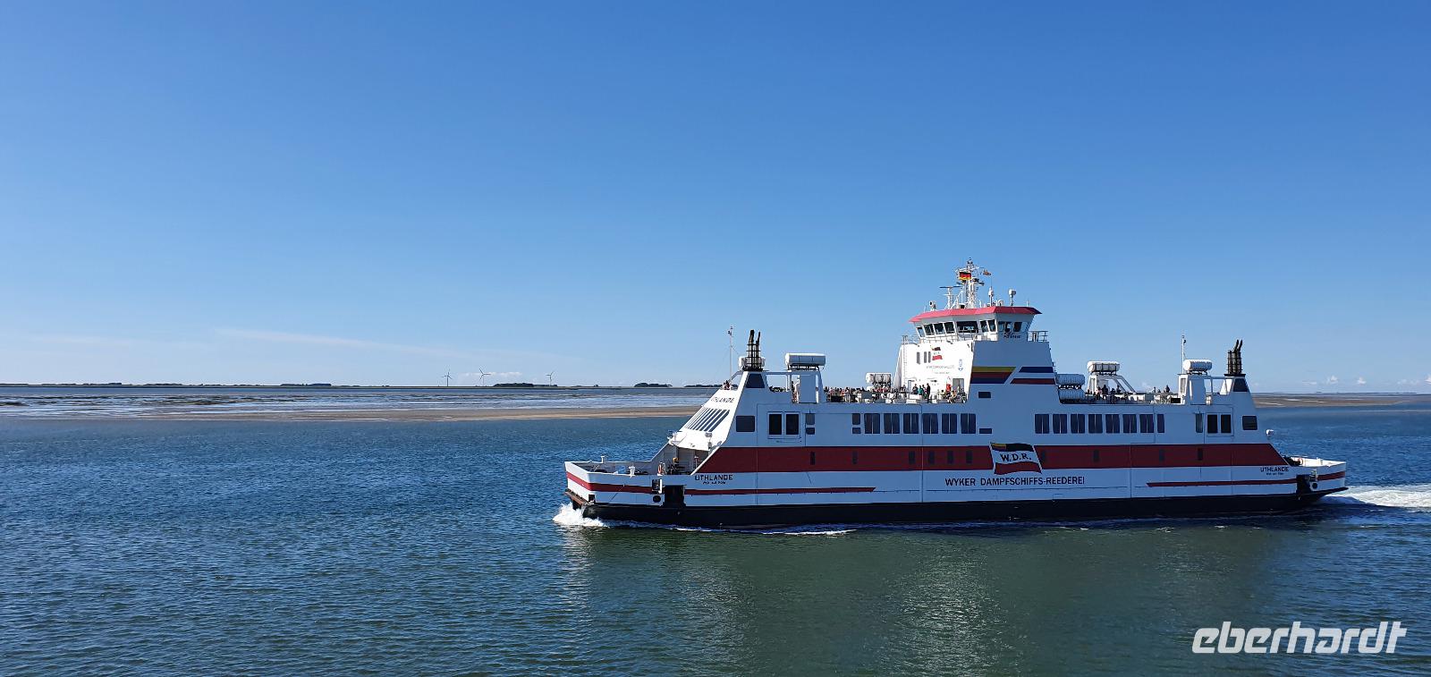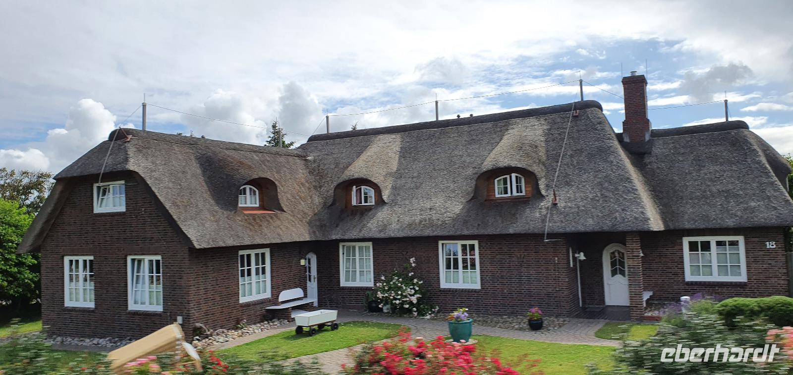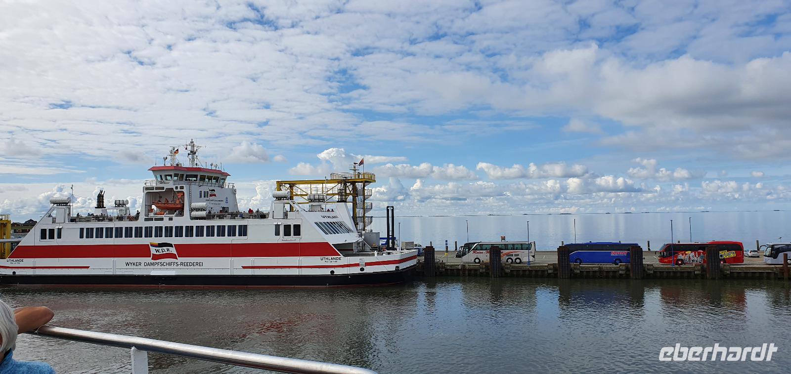 teil zu nehmen. Also lassen wir uns unser Frühstück schmecken und starten dann nach Dagebüll zu unserer Fähre. Eine knappe Stunde dauerte die Überfahrt zur Insel und dort empfängt uns im Hafen ein Transparent am Leuchtturm das sagt "schön dass ihr da seid". Direkt am Hafen wartet dann auch schon Daniel mit dem Bus auf uns. Er wird uns auf einer Rundfahrt seine Insel zeigen. Daniel selbst ist hier aufgewachsen und das spürt man bei allem was er uns erzählt. So erfahren wir, dass Wyk zum Beispiel Bucht heißt und das "um" in den Ortsnamen bedeutet "heim". Midlum zum Beispiel: das Heim in der Mitte. Durch Oevesum, Alkersum und Oldsum geht die Fahrt und wir bestaunen prächtige reetgedeckte Häuser. Im Ortskern jeweils die Feuerwehr und gegenüber der Dorfkrug. Am