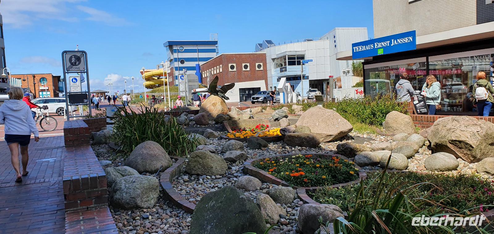 schließlich legen wir eine kleine Pause ein. Daniel erklärt uns, dass der Unterschied zwischen Ebbe und Flut hier 2 Meter und 90 ist. Wattwanderungen sind sehr beliebt, hier kann man von Föhr bis nach Amrum wandern, es gibt leichtere aber auch sehr anspruchsvolle lange Touren. Auf unserer weiteren Tour sehen wir kleine Zwergenfiguren vor den Häusern. Sie erinnern an die